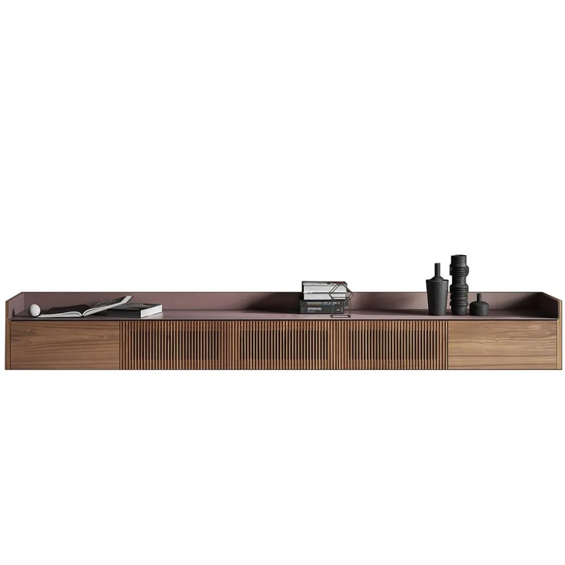 Porte à lattes assortie en noyer avec charnières Salice et sans poignées (ouverture 105 °). Plateau rose pâle en aluminium anodisé. Supports muraux noirs inclus.