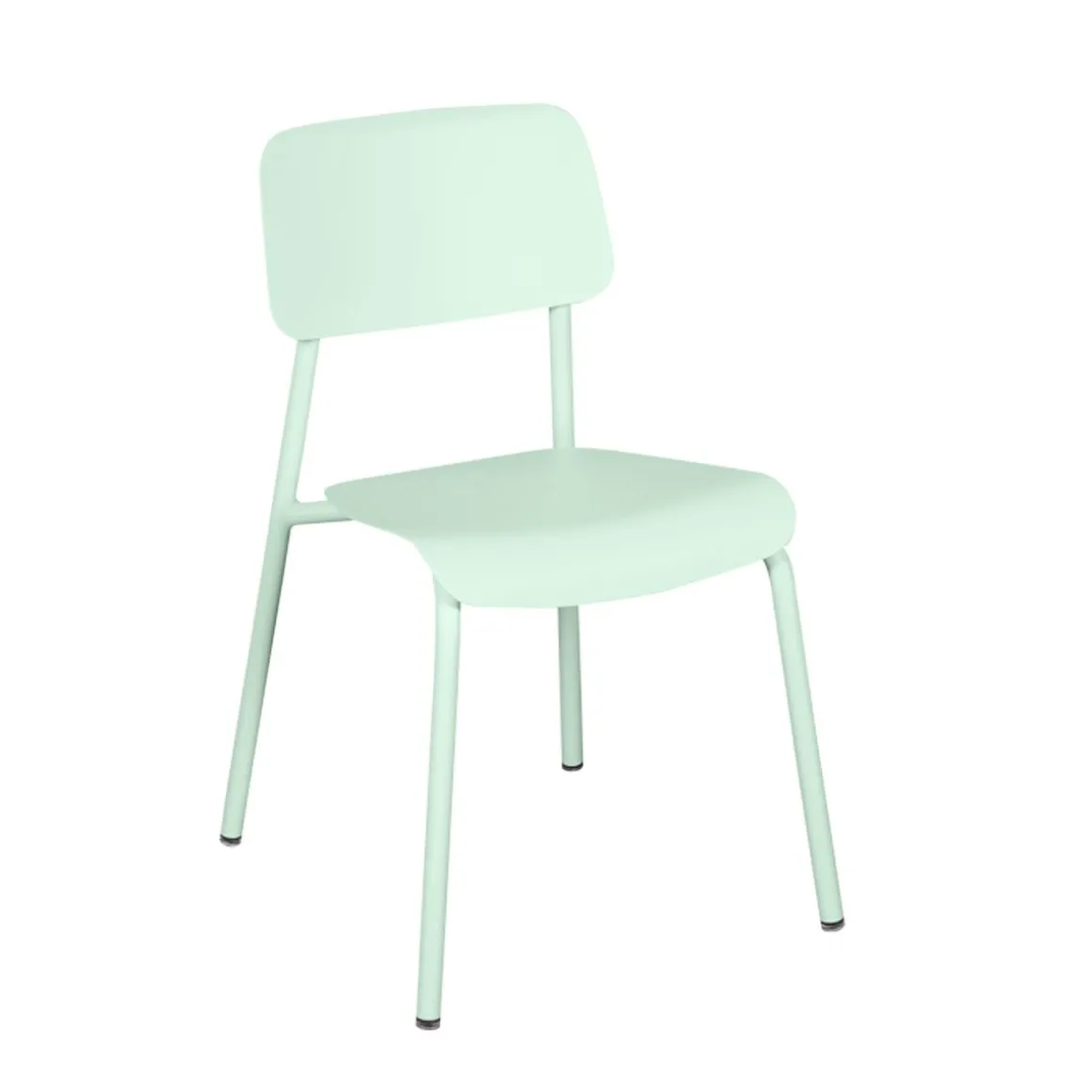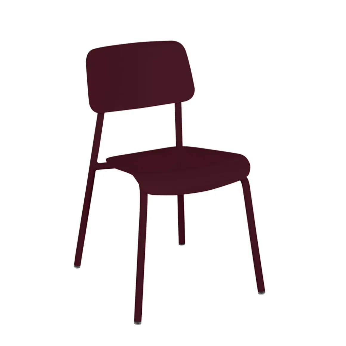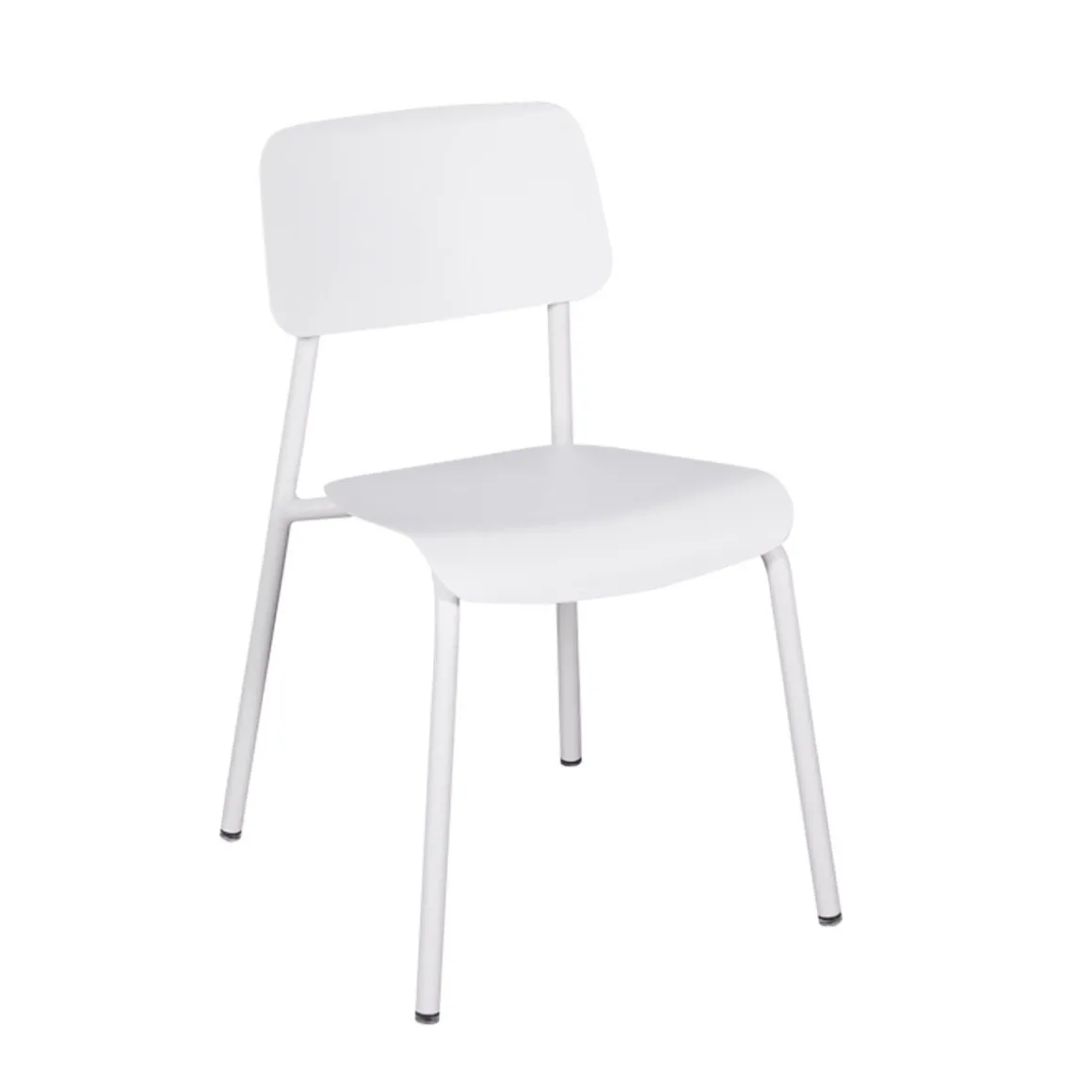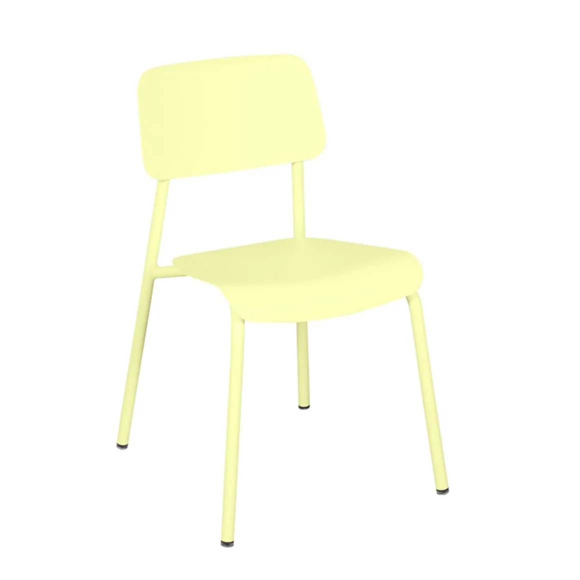 Studie chaise de Fermob par Tristan Lohner. Retombez en enfance et laissez-vous gagner par la nostalgie avec la chaise Studie, inspirée de nos chaises d’écolier. Dessinée par Tristan Lohner, designer et partenaire fidèle de Fermob, elle emprunte aux chaises iconiques de nos salles de classe leurs lignes épurées, revisitées de manière contemporaine. Ce qui lui donne une belle allure stylée ! Quand la simplicité sublime… C’est ce que l’on se dit en regardant la chaise Studie. Son look contemporain très dépouillé est du plus bel effet. Et son assise galbée est un appel à s’y poser : il est visuellement évident que l’on va s’y sentir bien installé… En effet, si cette chaise s’inspire de nos chaises d’écoliers, elle diffère de ces dernières par son confort optimal : le galbe de son assise et de son dossier est idéalement conçu pour épouser les formes de nos corps. Autre différence notable : les patins silence, dont elle est équipée, brevetés Fermob, permettent de la déplacer sur le sol sans bruit, là où manipuler nos chaises d’école en faisait tant (du bruit) ! Enfin, il est facile d’empiler ces chaises en métal pour les stocker : conçues en aluminium, elles sont d’une grande légèreté et leurs patins d’empilabilité les protègent des frottements. Elles sont ultra-résistantes par ailleurs, même dans les climats de bord de mer. Last but not least : conçues en aluminium avec patins démontables, elles sont entièrement recyclables. Un atout de plus au crédit de la chaise Studie ! Choisissez votre couleur parmi les nombreuses teintes du nuancier. Et associez-les à n’importe quelle table Fermob. Disposez-les dehors, sur votre balcon, ou bien rentrez-les, autour d’une table de salle-à-manger. Avec la chaise Studie, que vous repérerez peut-être sur la terrasse branchée de votre restaurant préféré, le champ des possibles est largement ouvert.