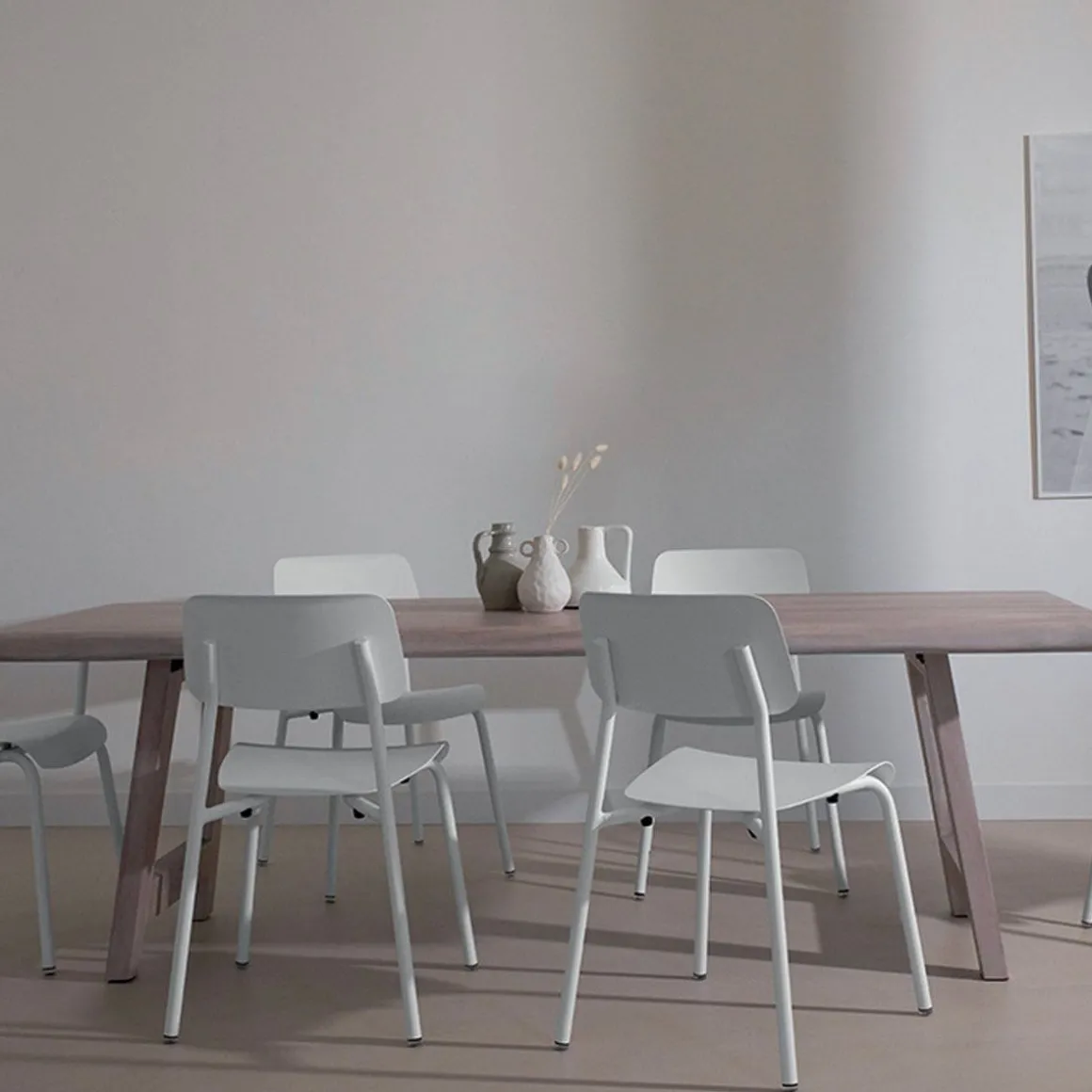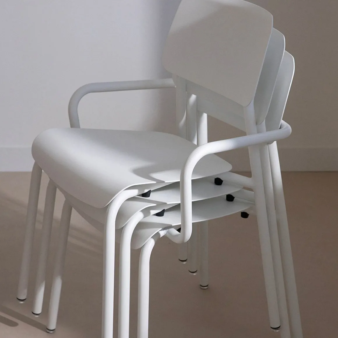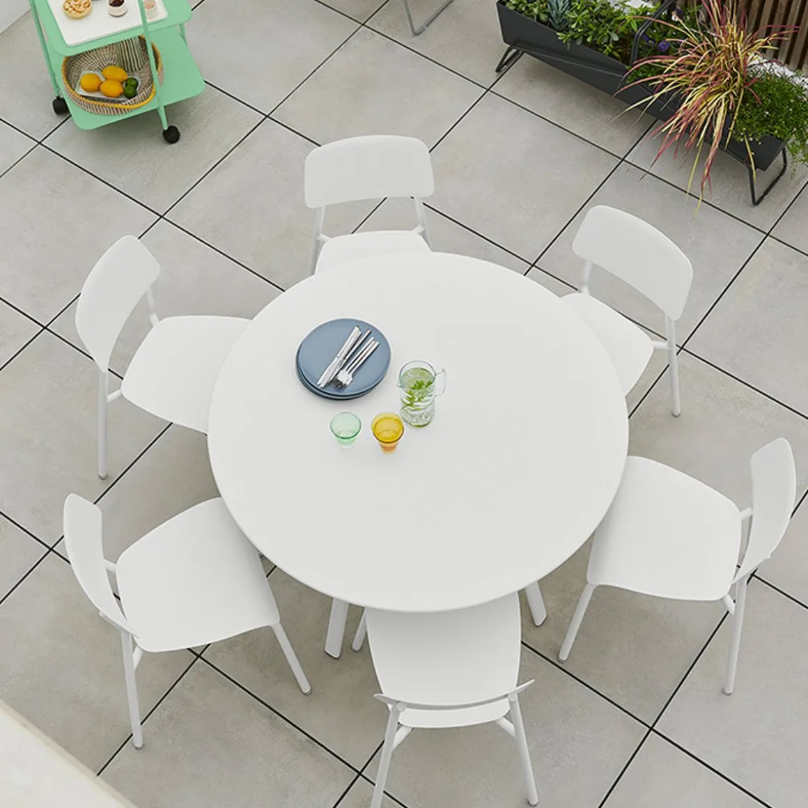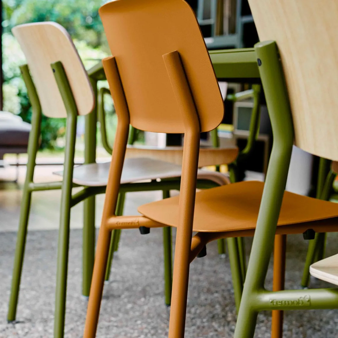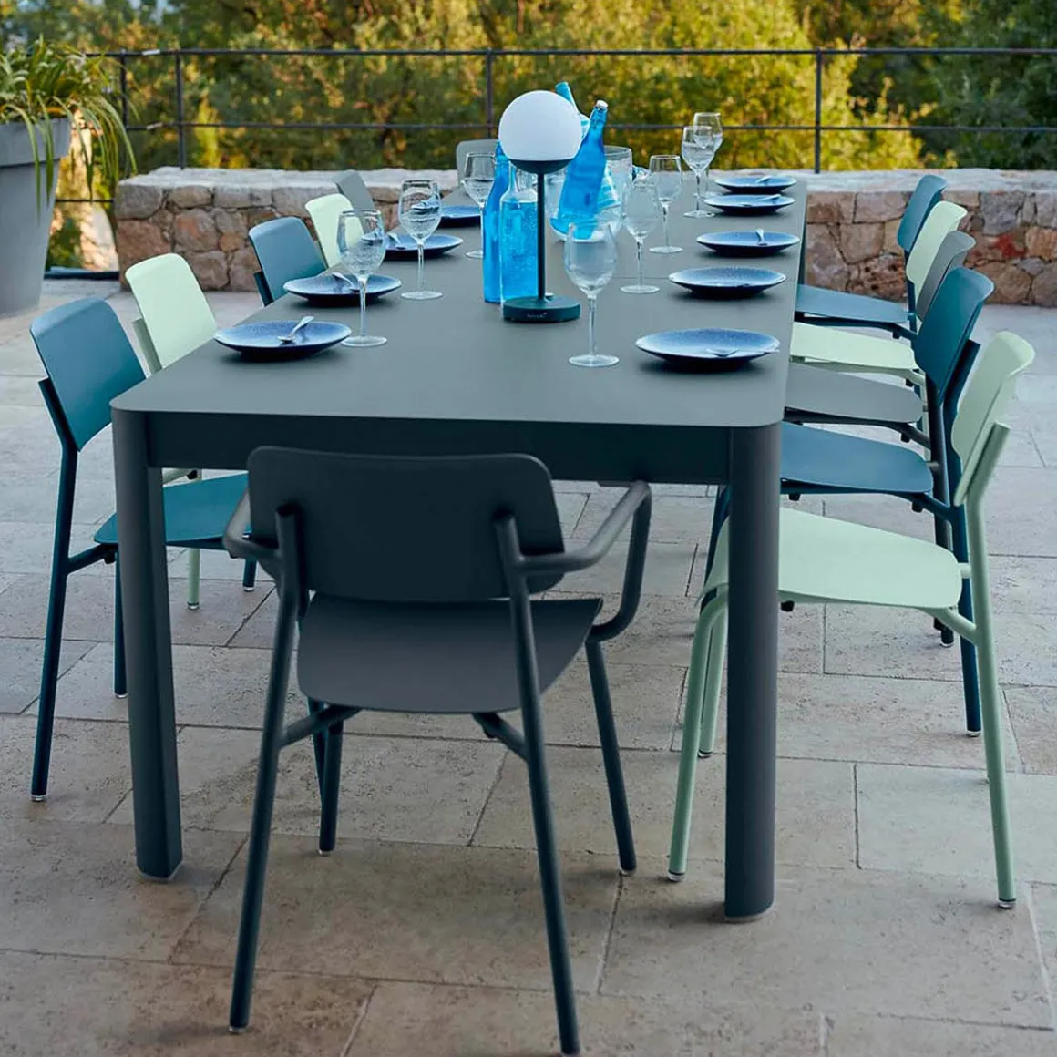 Studie chaise de Fermob par Tristan Lohner. Retombez en enfance et laissez-vous gagner par la nostalgie avec la chaise Studie, inspirée de nos chaises d’écolier. Dessinée par Tristan Lohner, designer et partenaire fidèle de Fermob, elle emprunte aux chaises iconiques de nos salles de classe leurs lignes épurées, revisitées de manière contemporaine. Ce qui lui donne une belle allure stylée ! Quand la simplicité sublime… C’est ce que l’on se dit en regardant la chaise Studie. Son look contemporain très dépouillé est du plus bel effet. Et son assise galbée est un appel à s’y poser : il est visuellement évident que l’on va s’y sentir bien installé… En effet, si cette chaise s’inspire de nos chaises d’écoliers, elle diffère de ces dernières par son confort optimal : le galbe de son assise et de son dossier est idéalement conçu pour épouser les formes de nos corps. Autre différence notable : les patins silence, dont elle est équipée, brevetés Fermob, permettent de la déplacer sur le sol sans bruit, là où manipuler nos chaises d’école en faisait tant (du bruit) ! Enfin, il est facile d’empiler ces chaises en métal pour les stocker : conçues en aluminium, elles sont d’une grande légèreté et leurs patins d’empilabilité les protègent des frottements. Elles sont ultra-résistantes par ailleurs, même dans les climats de bord de mer. Last but not least : conçues en aluminium avec patins démontables, elles sont entièrement recyclables. Un atout de plus au crédit de la chaise Studie ! Choisissez votre couleur parmi les nombreuses teintes du nuancier. Et associez-les à n’importe quelle table Fermob. Disposez-les dehors, sur votre balcon, ou bien rentrez-les, autour d’une table de salle-à-manger. Avec la chaise Studie, que vous repérerez peut-être sur la terrasse branchée de votre restaurant préféré, le champ des possibles est largement ouvert.