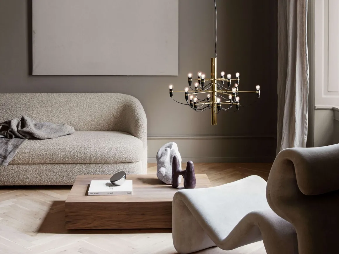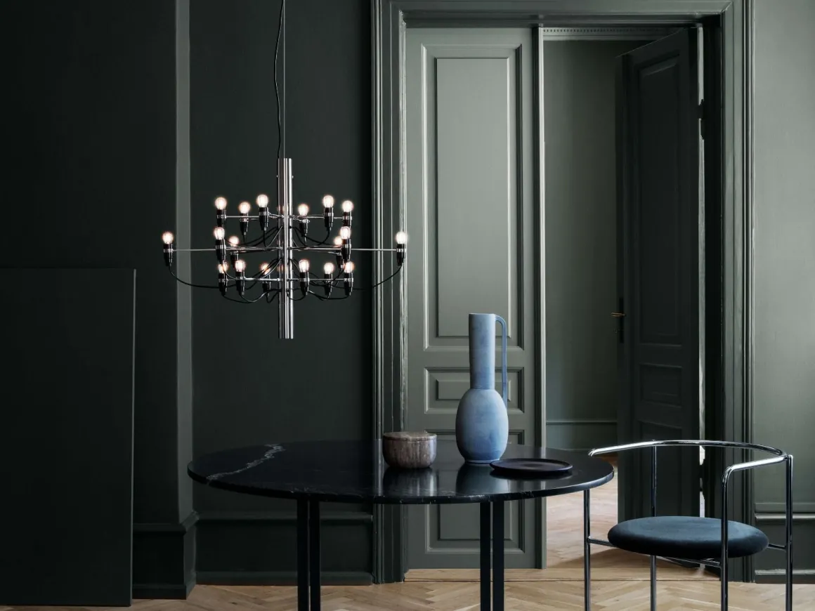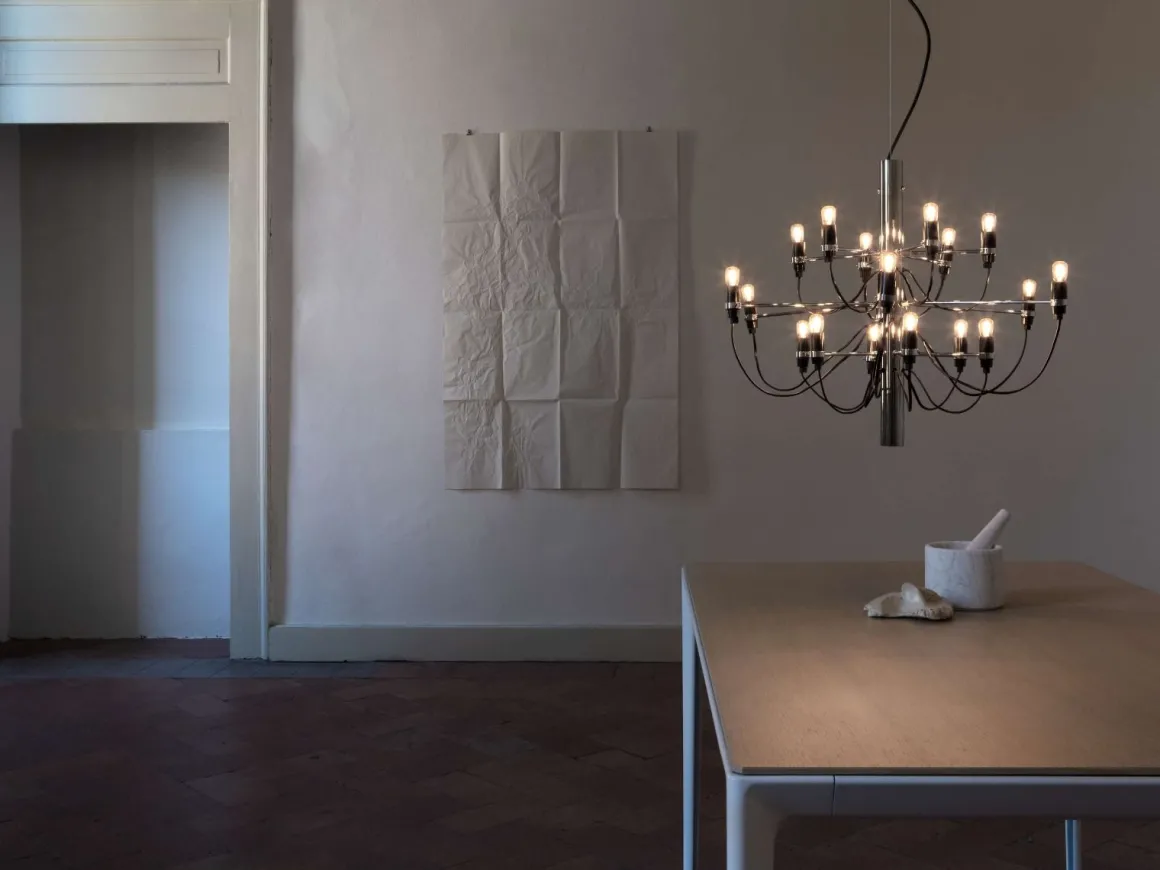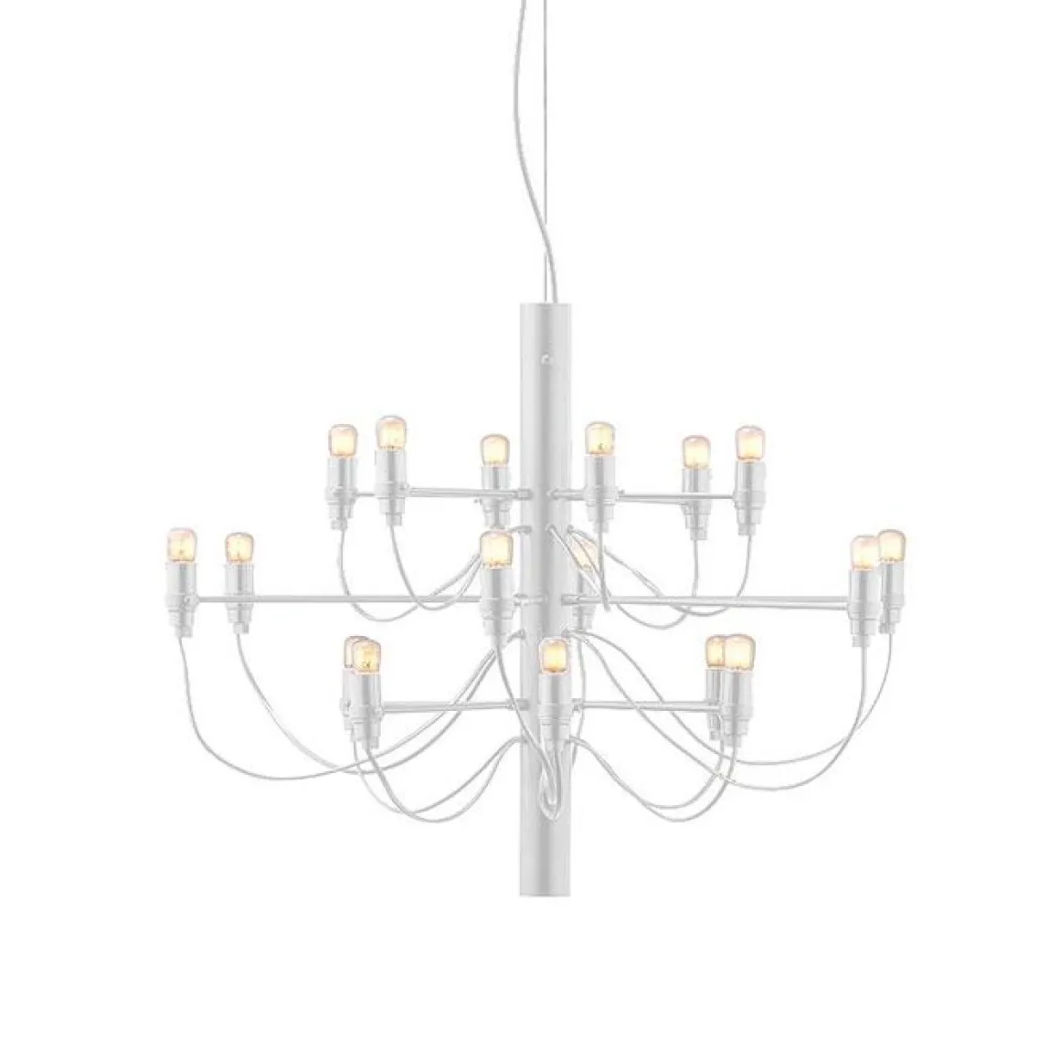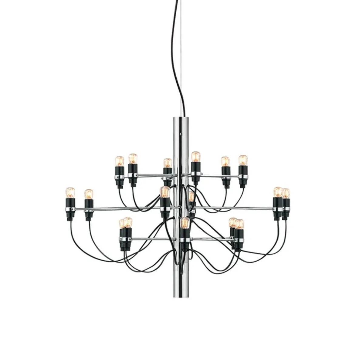 En revisitant l’esthétique classique d’un chandelier, Gino Sarfatti dessine 2097 en 1958. Les ampoules et les câble sont exposé, ce qui donne une forme moderne et minimaliste. La collection de lustres mordernes est enrichie par le tout nouveau modèle 2097/18, hébergeant 18 ampoules LED disponibles en version claires ou givrées, avec deux températures de couleur différentes. Même design et allure, dans une version plus discrète.