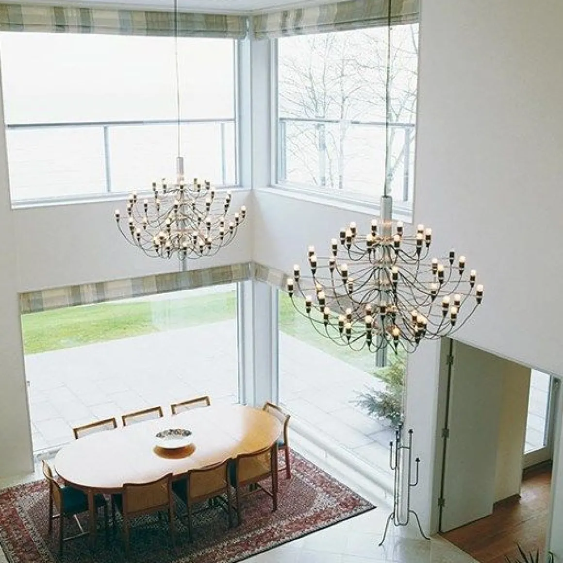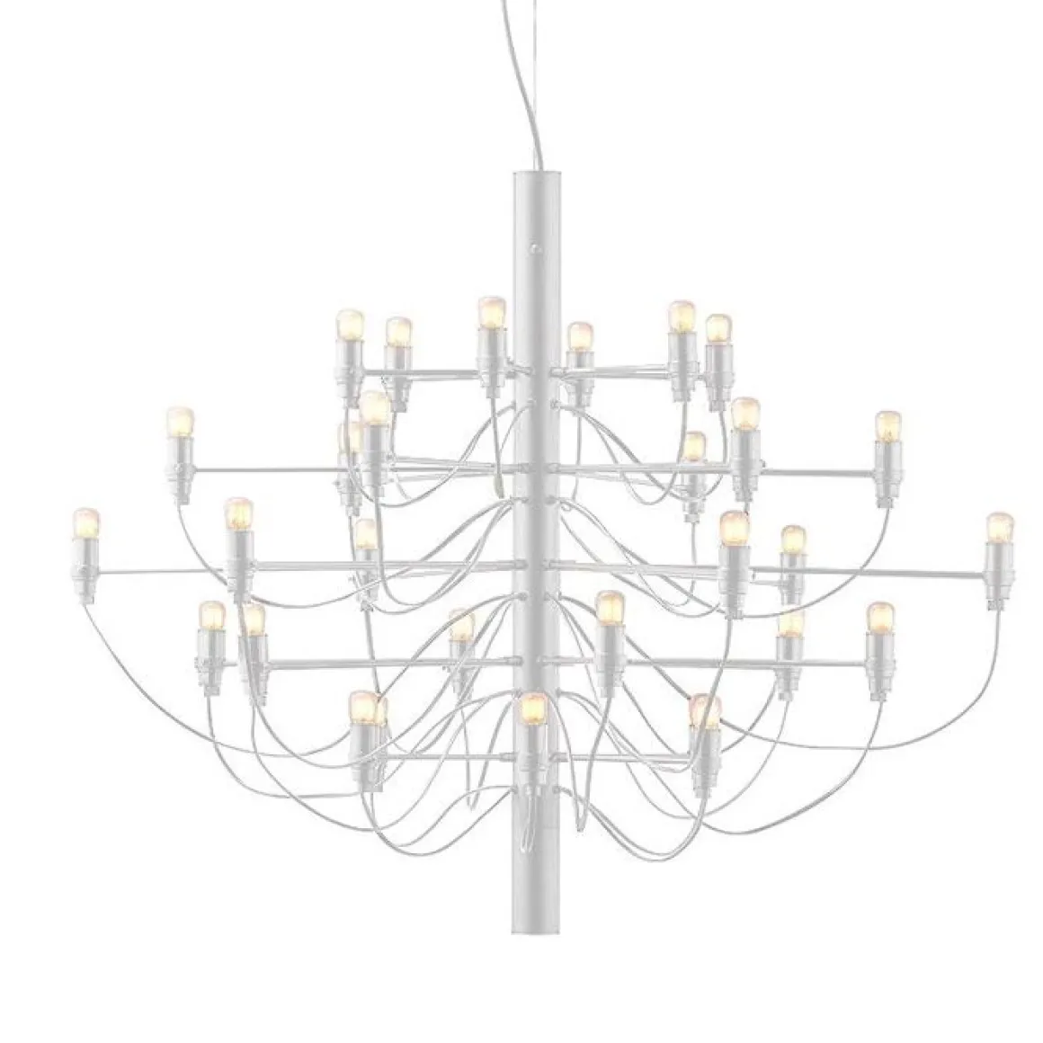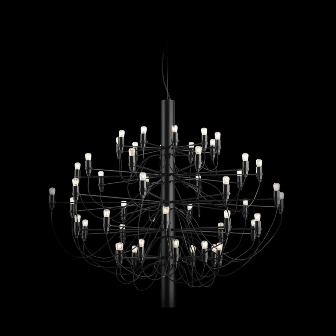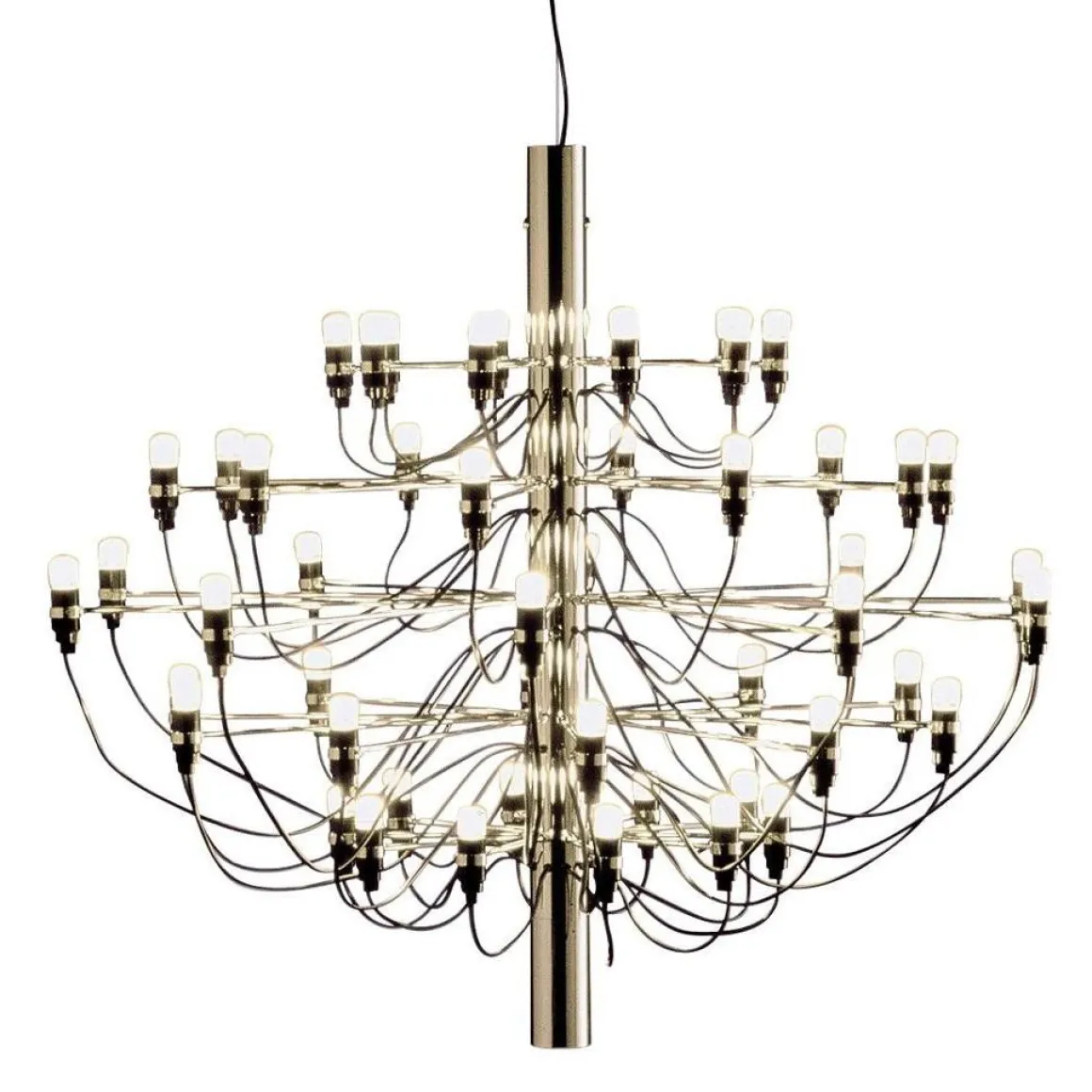 Suspension 2097 de Flos, créé en en 1958 par Gino Sarfatti. 2097 est une suspension à lumière diffuse. Sa structure centrale est en fer et son bras en laiton en finition chromée. Son attache plafond et sa rosace sont en acier.