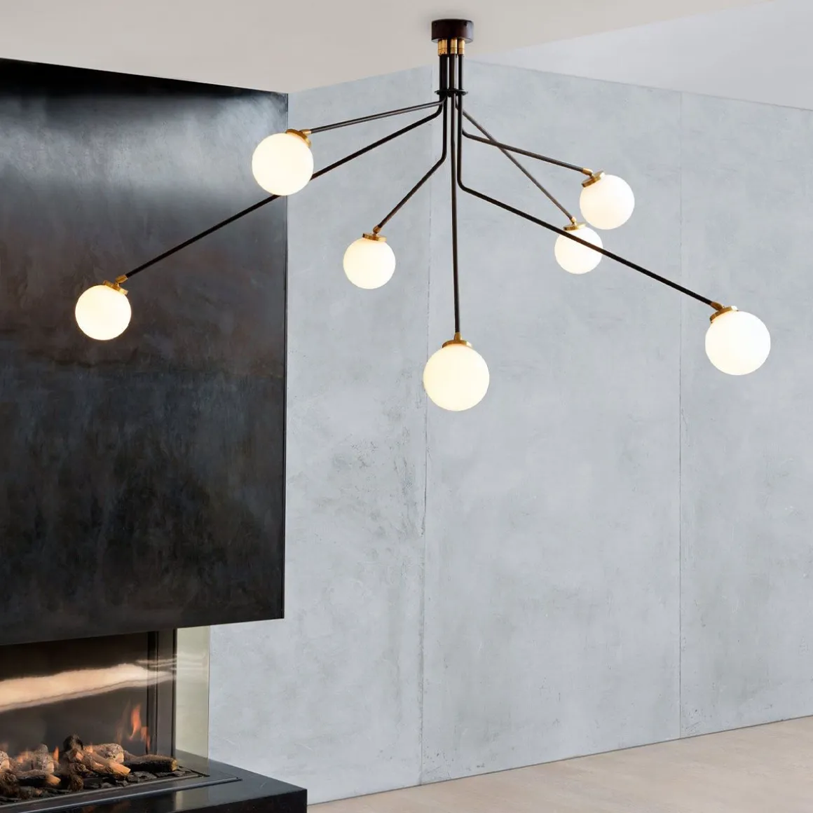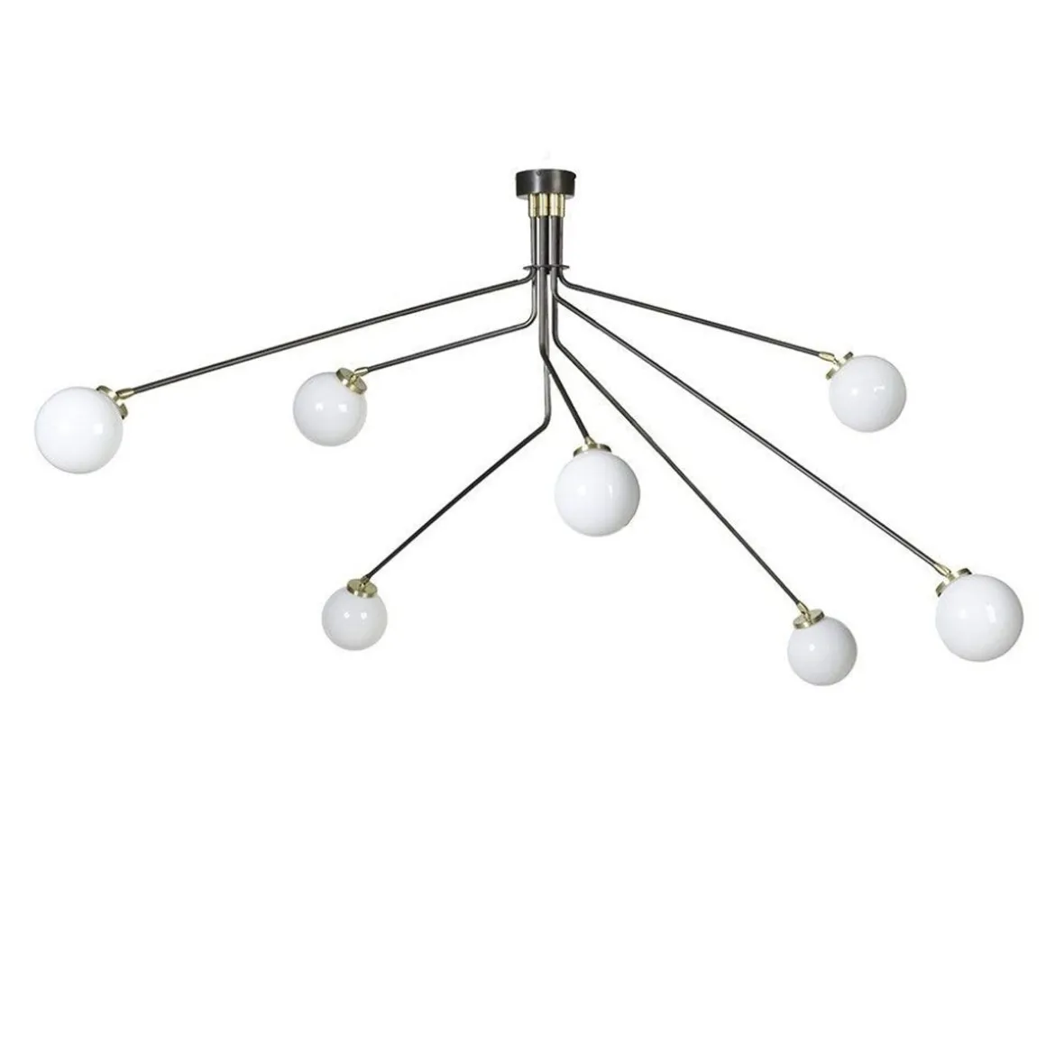 Inspiré de l’Italie des années 60. À la fois familière et moderne, sa forme distinctive avec ses bras rotatifs et ses abat-jours en opale soufflés à la bouche permettent de repositionner la pièce sculpturale. La ferronnerie est en laiton, puis bronzée et cirée à la main, ce qui contraste avec les détails en laiton.