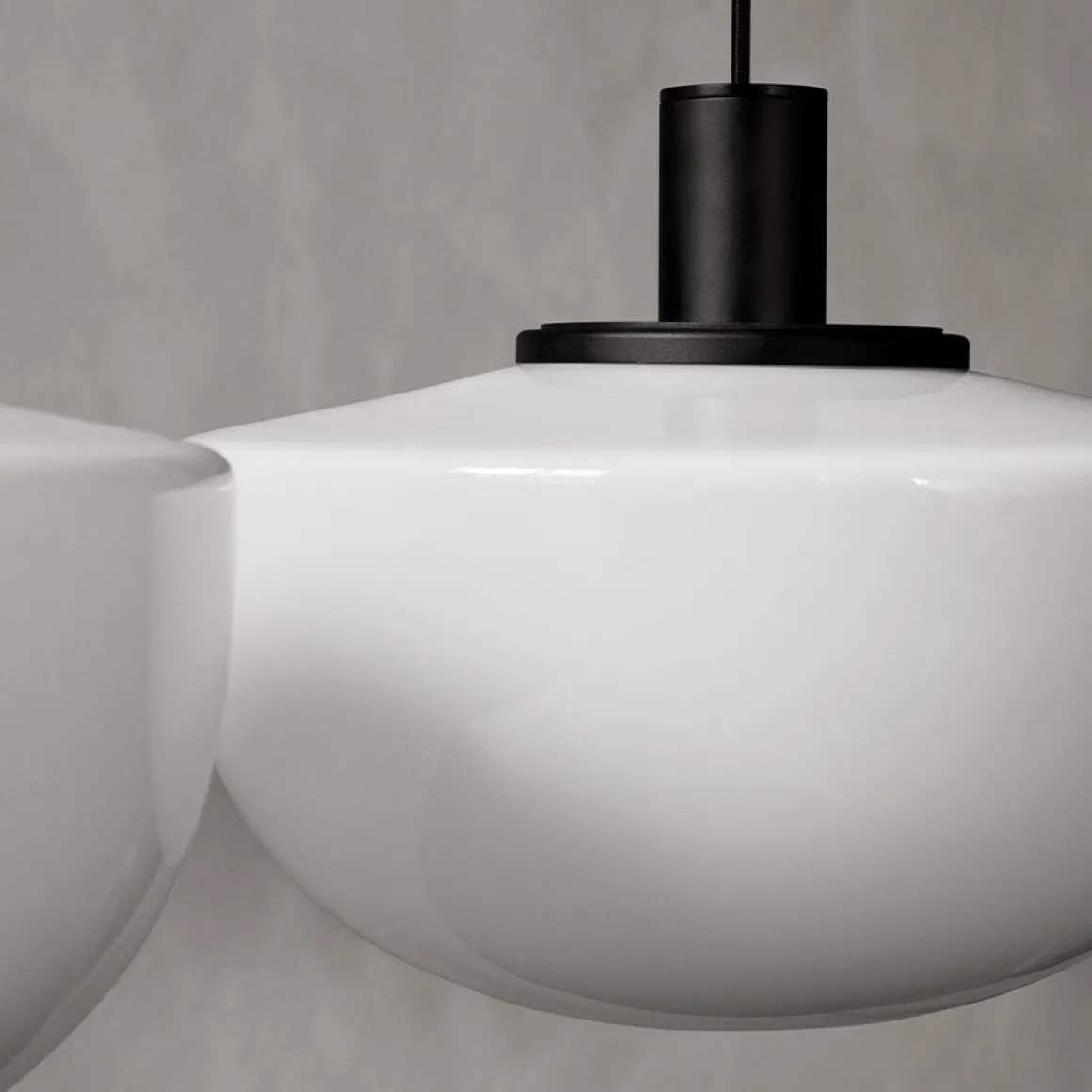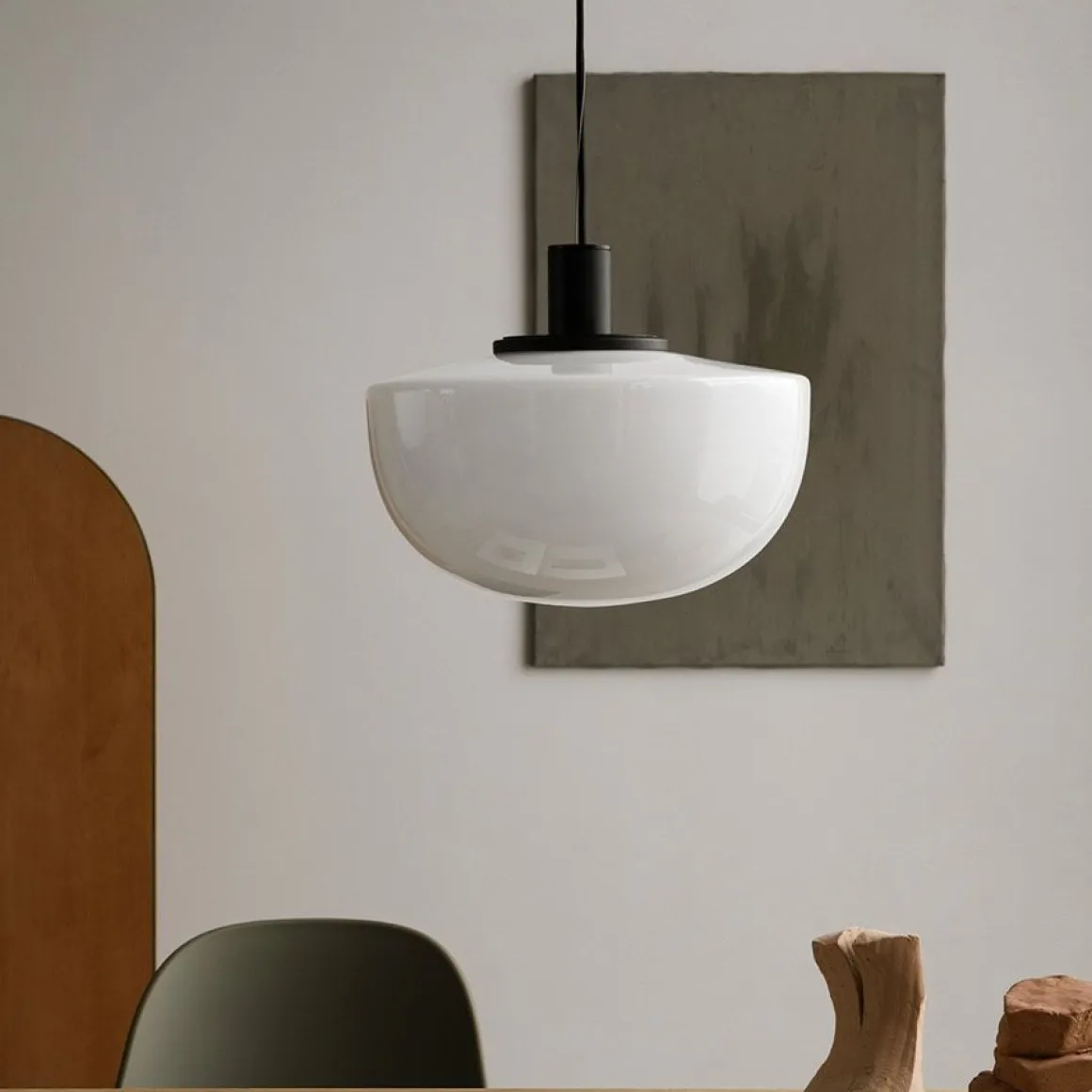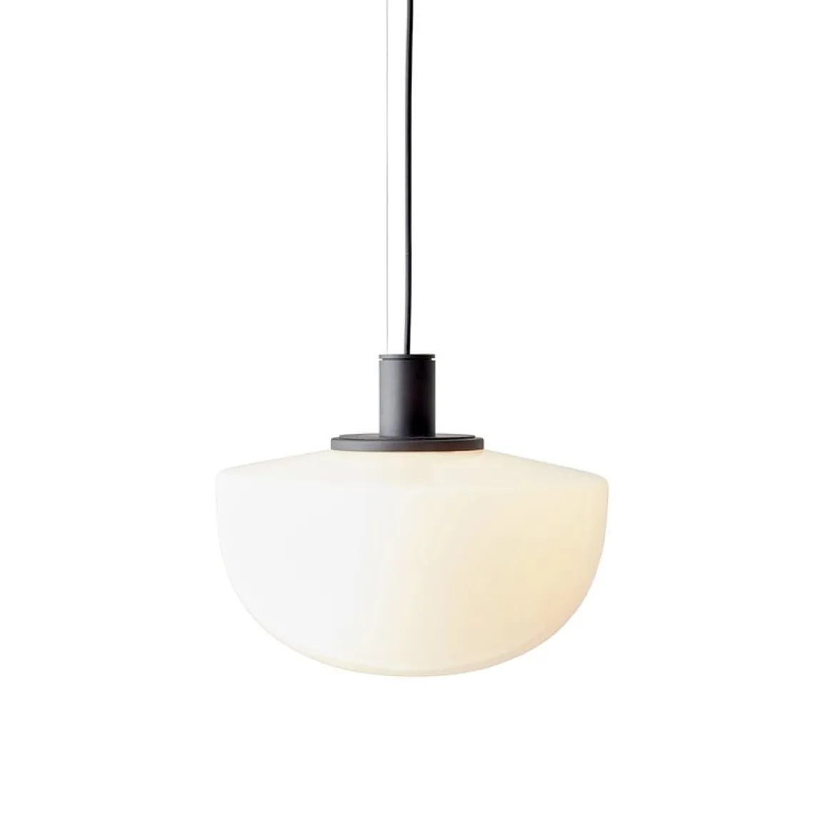 Le pendentif Bank est un pendentif semi-circulaire d’intérieur fabriqué à partir de verre opalin ou soufflé à la bouche et de raccords en aluminium enduit de poudre noire. Le verre opaque diffuse doucement la lumière à 360 degrés de n’importe quelle ampoule E26, créant une ambiance et fournissant un excellent éclairage de travail. L’association du verre opaque et du métal fin confère au produit une qualité, une tactilité et une longévité durables. Un raccord spécial avec un fil assure que l’abat-jour en verre unique peut facilement être ajusté pour accrocher uniformément.
