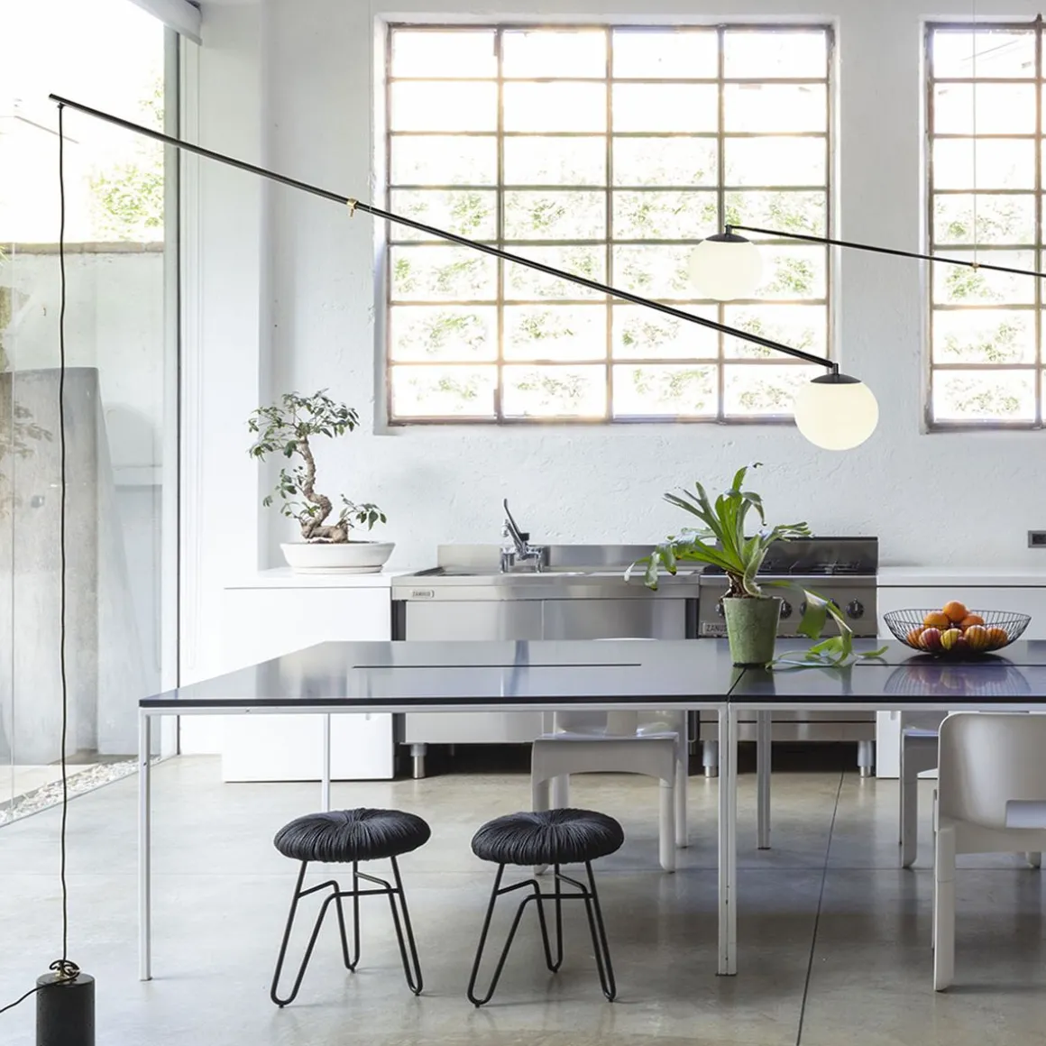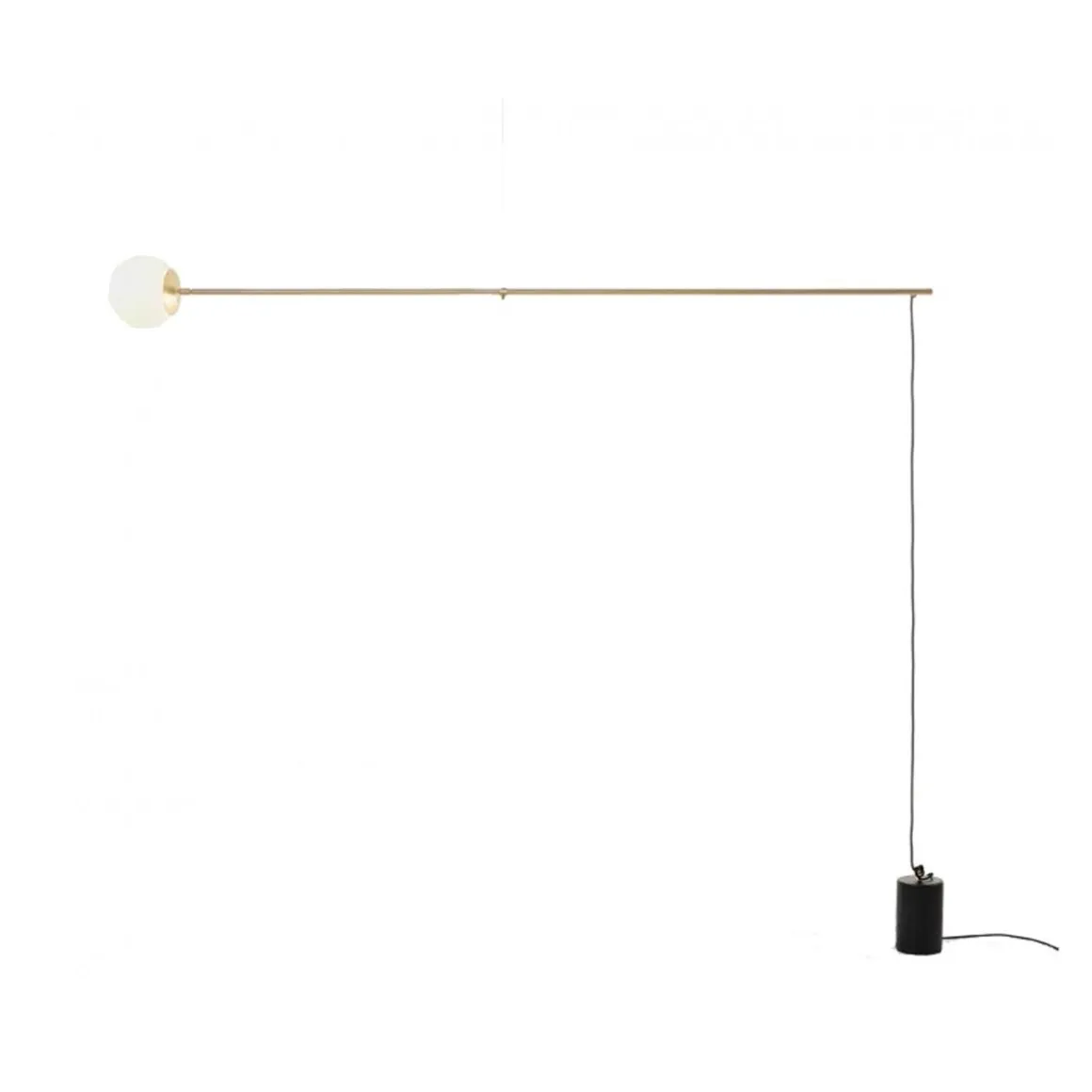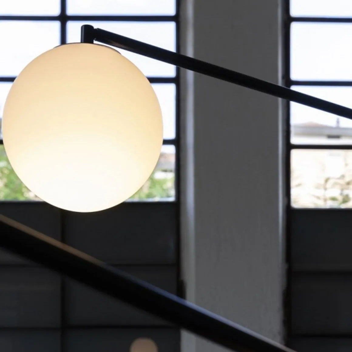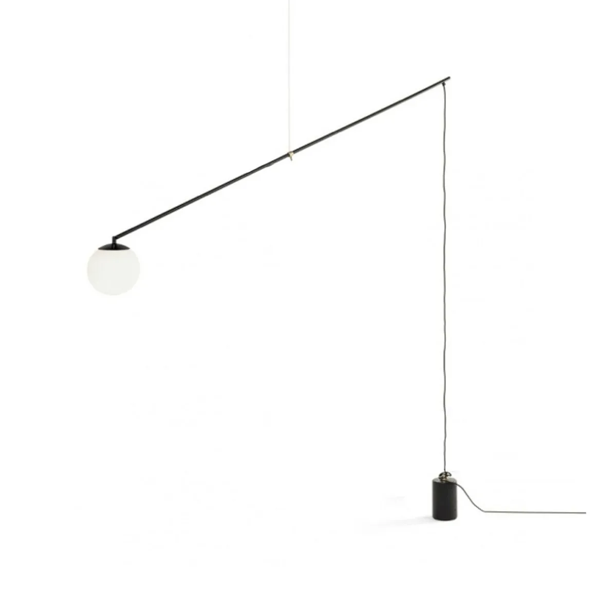 Bitta conçu par Sebastiano Tosi pour Mogg, lampe à suspension avec structure en métal peint dans différentes finitions. Sphère réglable en verre opale diam. 20 cm, poids au sol pour le positionnement et réglage en hauteur en ciment noir.