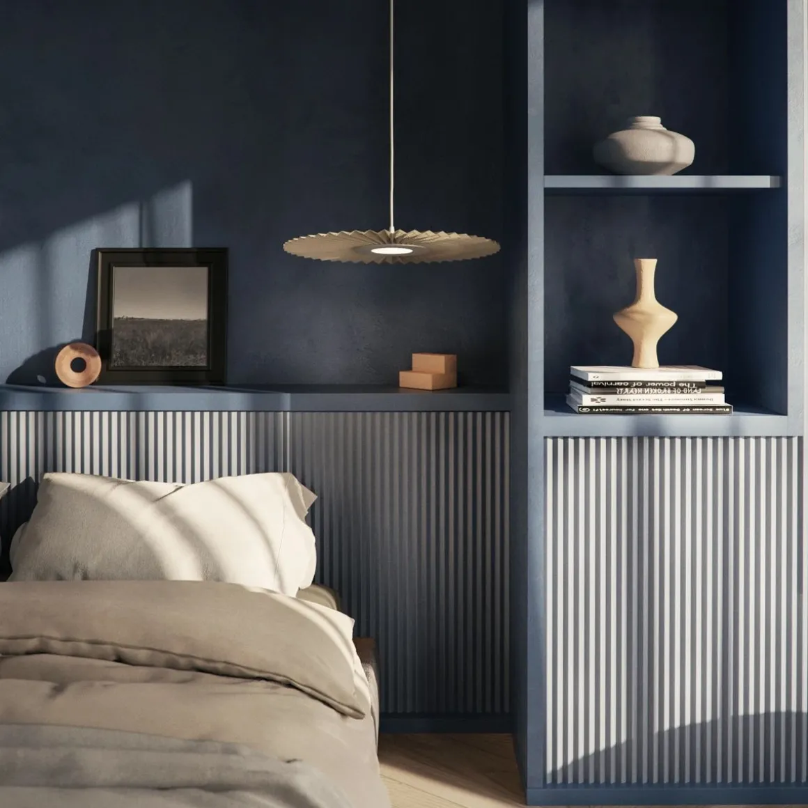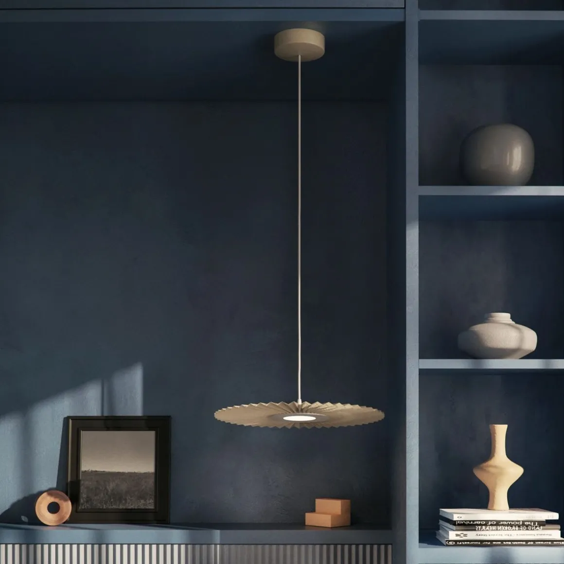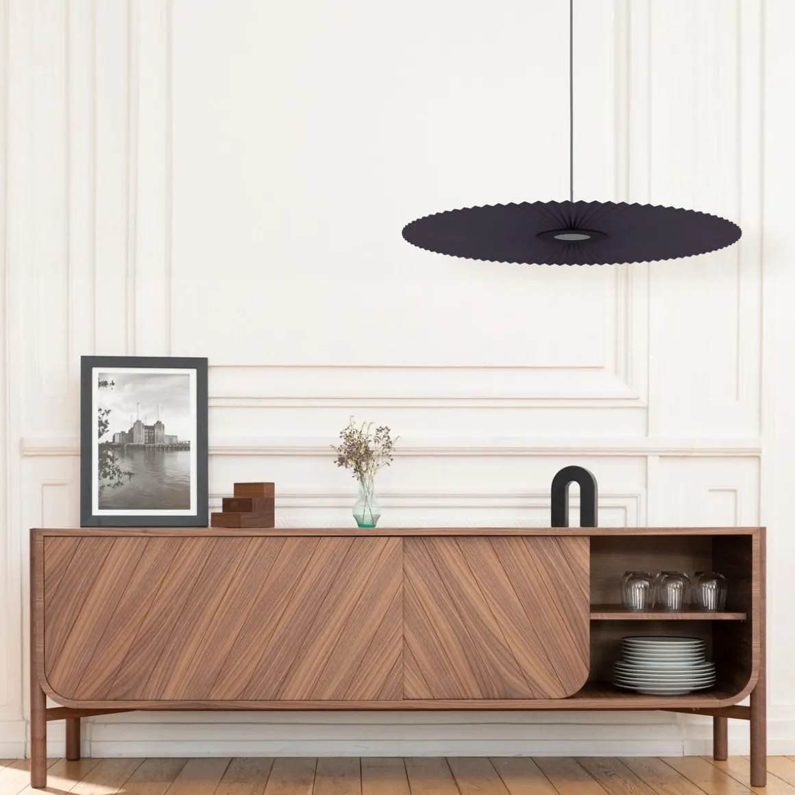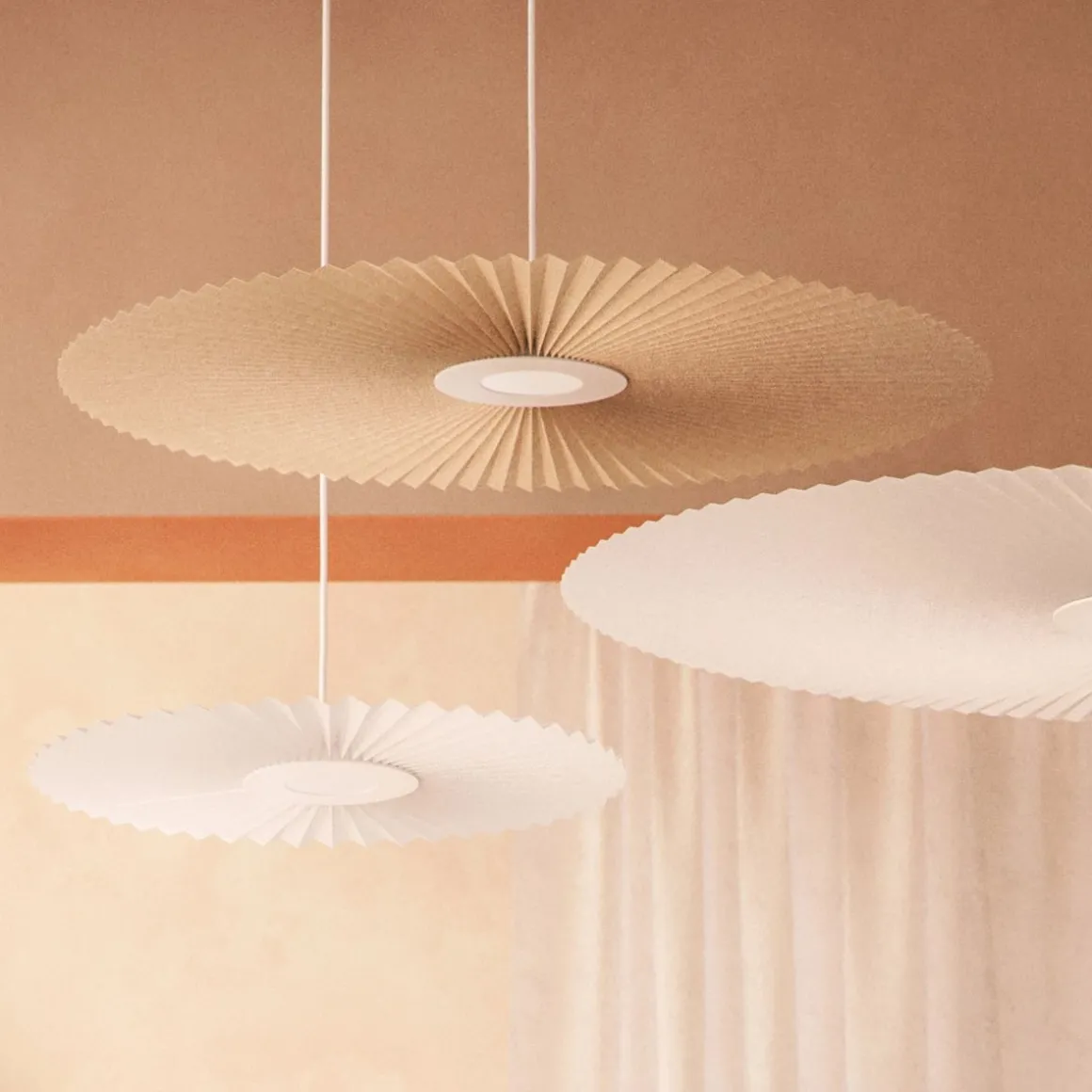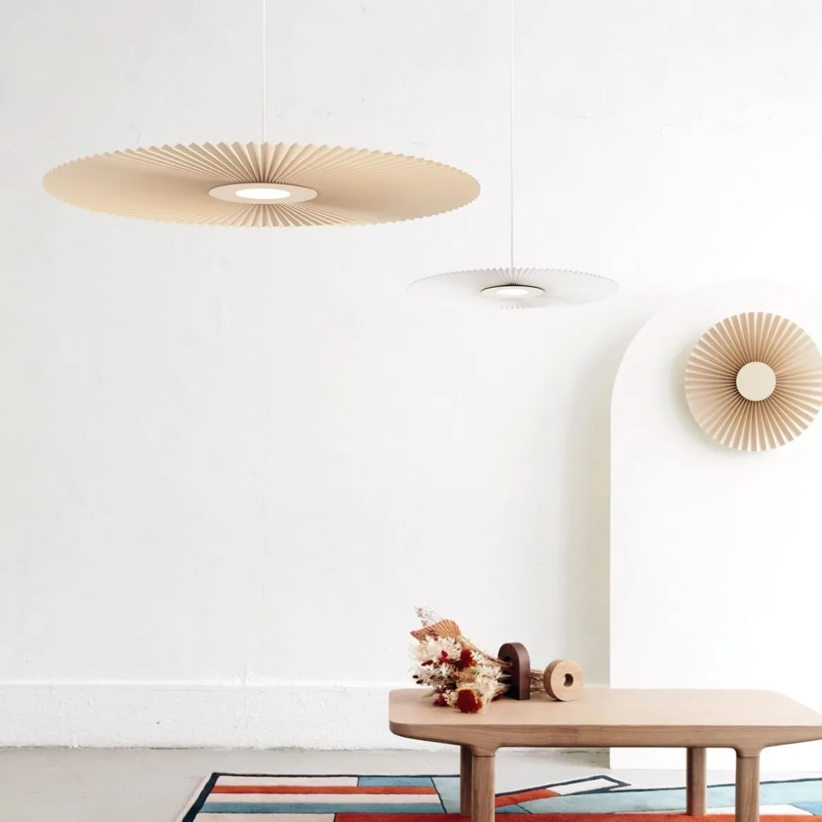 Le plissage et l’envergure de Carmen rendent son graphisme captivant. Le studio PaulinePlusLuis, a pensé pour HARTÔ cette suspension comme une danseuse. Les lignes de sa jupe se répètent et viennent rythmer l’espace dans laquelle elle se trouve. Quand Carmen entre en scène, elle ne passe pas inaperçue. Sublimée par son disque lumineux, elle a été conçue en partant d’expérimentations sur le textile. L’approche créative de ce jeune duo à l’origine de la suspension est intuitive. Elle se nourrit du quotidien. La polyvalence du traitement qu’ils accordent à la lumière rend leurs créations uniques. Le studio retrouve HARTÔ sur l’importance accordée aux motifs et lignes répétitives.