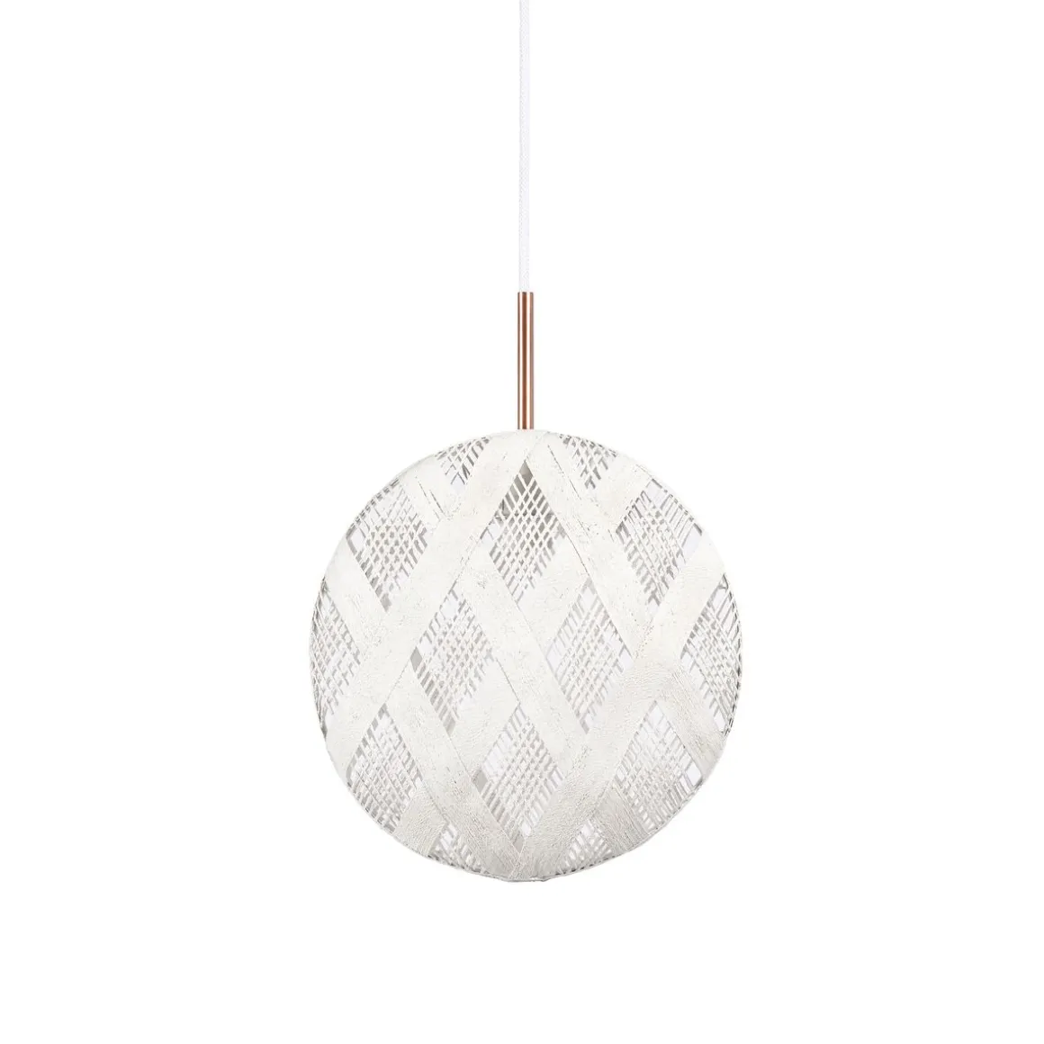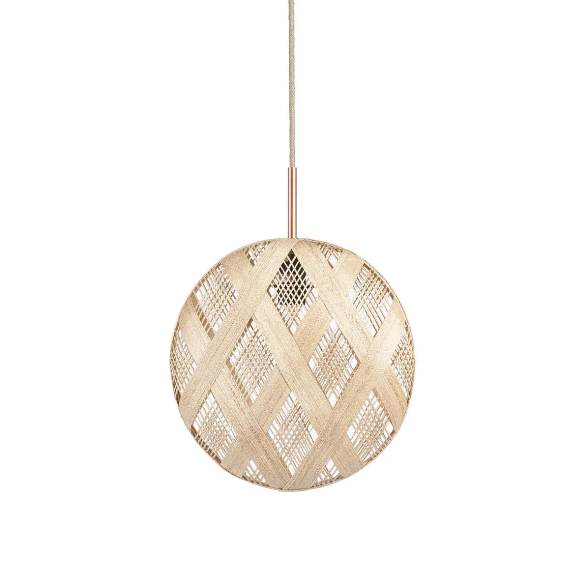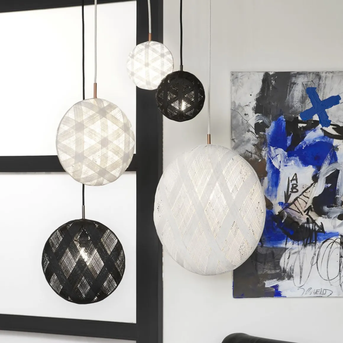Ces suspensions sont fabriquées artisanalement en abaca, une fibre textile naturelle ultra résistante issue d’une espèce de bananier qui croit très rapidement. Tissée à la main, la fibre d’abaca est ensuite mise en forme dans des moules où elle sèche longuement. Le tissage perfectionné dessine de superbes motifs géométriques et forme une dentelle délicate et légère. La structure ajourée très aérienne produit un éclairage presque irréel en donnant naissance à de superbes projections d’ombres sur les murs ou au plafond. L’authenticité des matières, les jeux d’ombre et de lumière, créent une atmosphère infiniment poétique.