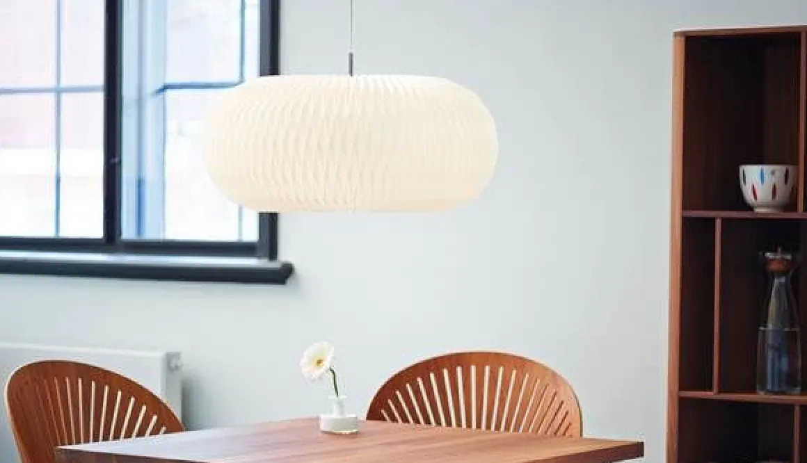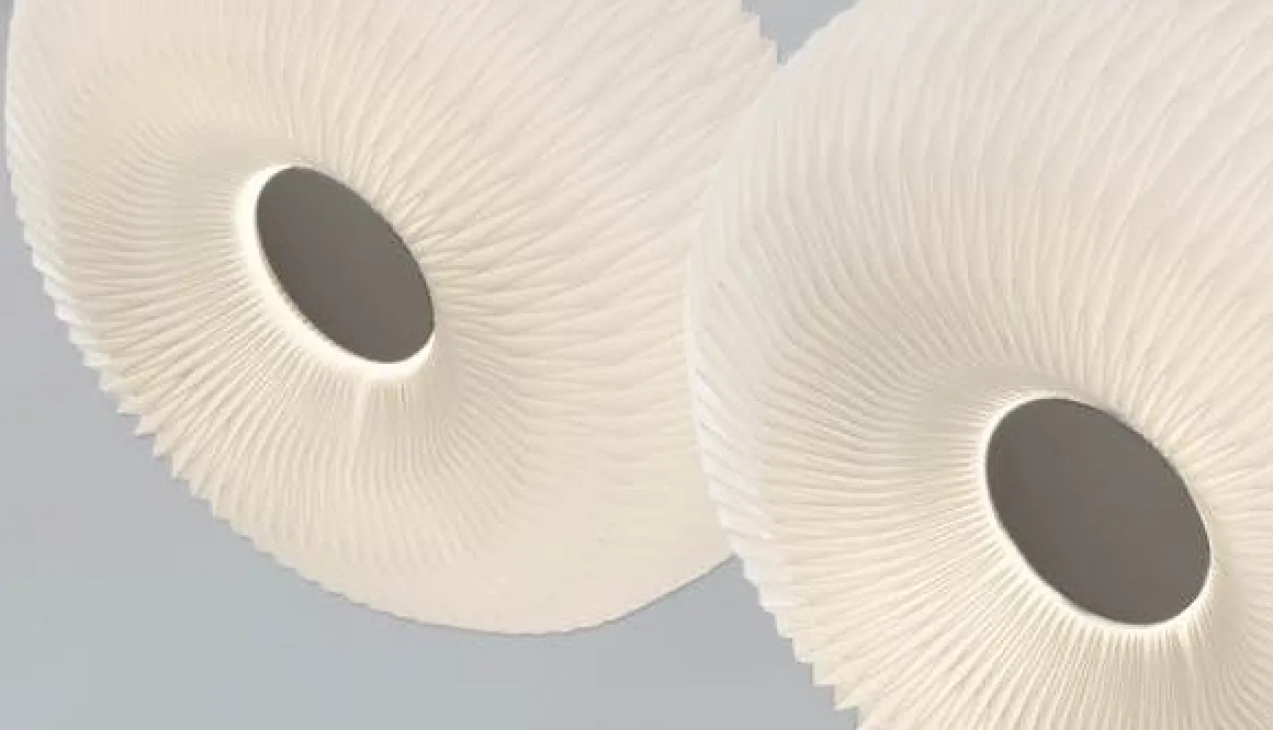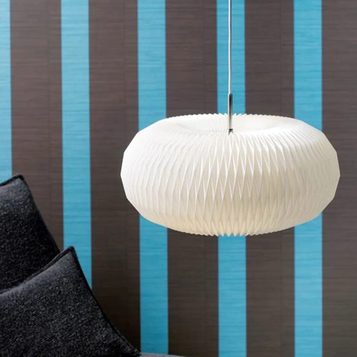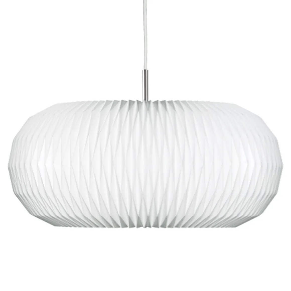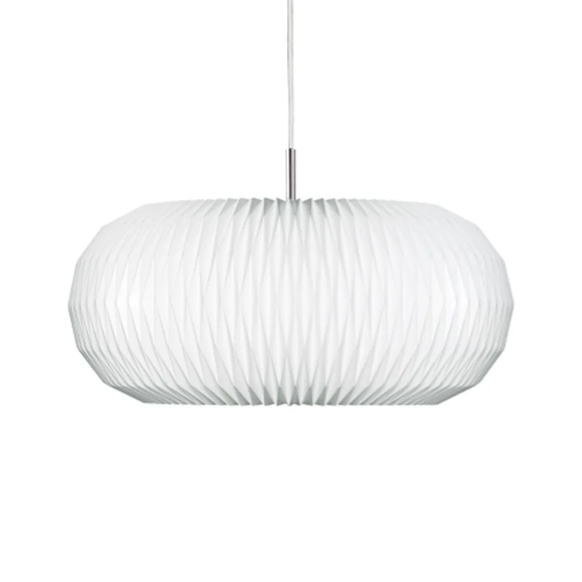 Cette lampe est populairement connue sous le nom de lampe Donut. Lorsqu’elle a créé la lampe en 2007, la designer Lise Navne s’est en effet inspirée de la forme extrêmement arrondie de son homologue comestible. Actuellement disponible en deux tailles. La lampe est entièrement fermée en haut et en bas par une plaque en acier poli, dont la simplicité contraste parfaitement avec le plissage très complexe de l’abat-jour lui-même.