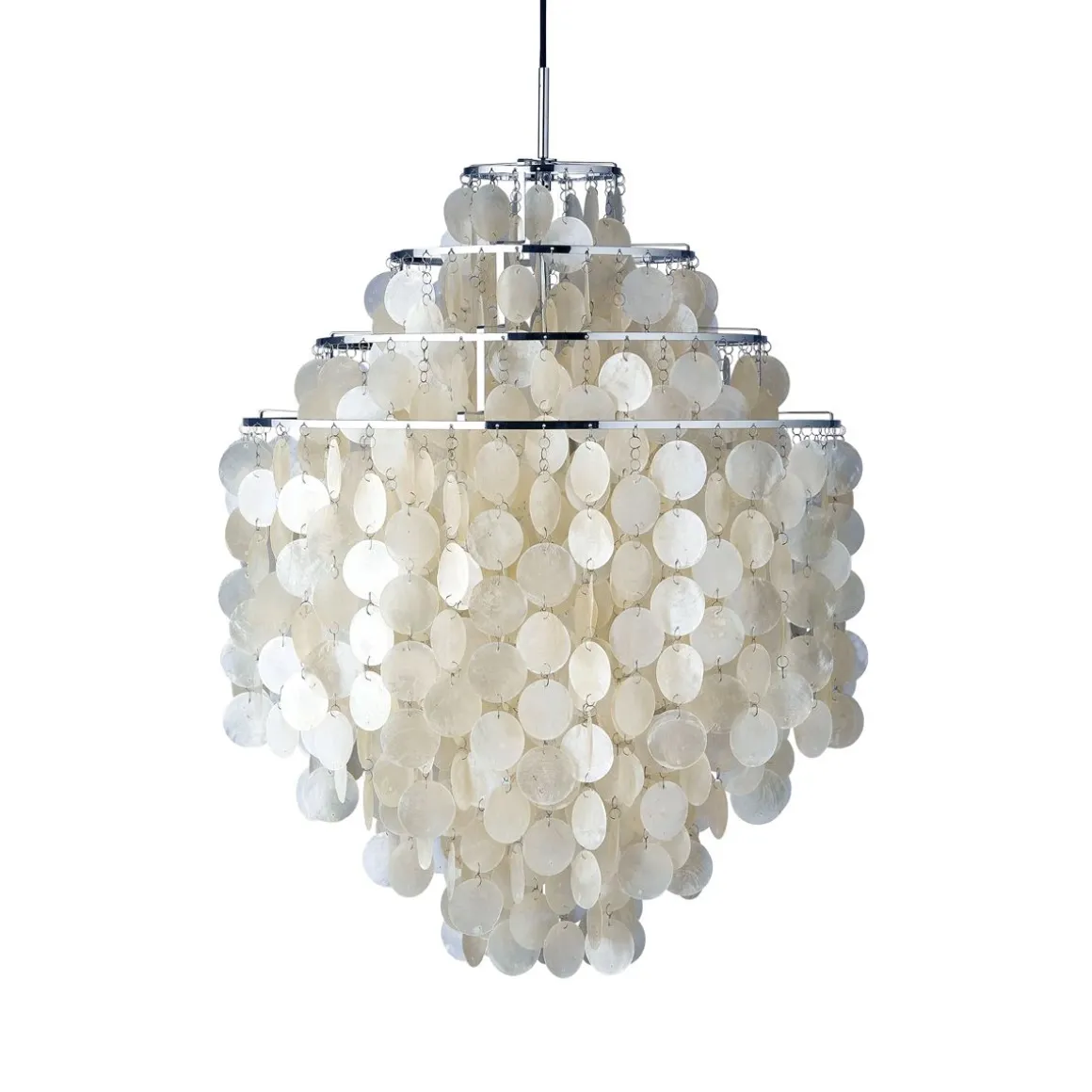 Beaucoup considèrent la collection Fun comme l’un des plus grands chefs-d’œuvre de Verner Panton dans le domaine de la conception d’éclairage. Depuis 1964, cette suspension est source de joie et d’histoires. FUN 0DM est une grande suspension avec un cadre chromé à quatre anneaux.