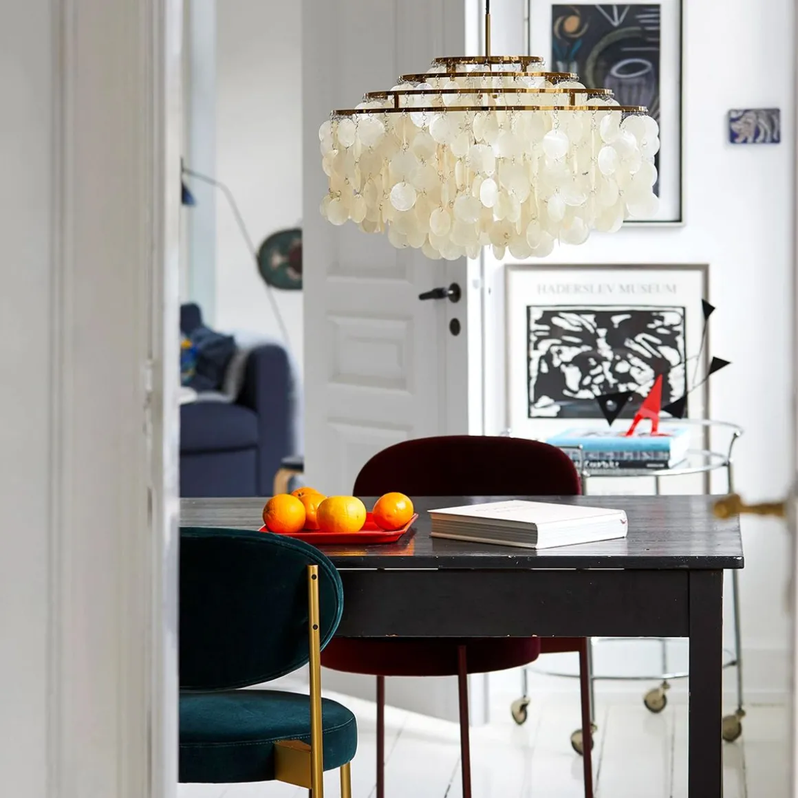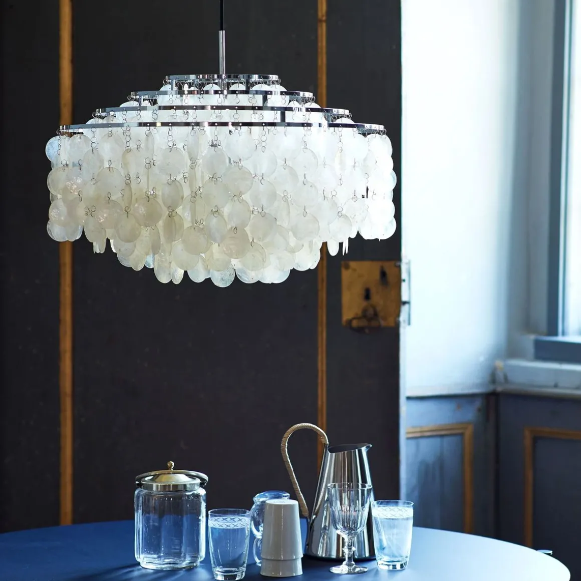 Beaucoup considèrent la collection Fun comme l’un des plus grands chefs-d’œuvre de Verner Panton dans le domaine de la conception d’éclairage. Depuis 1964, cette suspension est source de joie et d’histoires. FUN 10DM est un grand pendentif avec un cadre à quatre anneaux au fini laiton ou chromé.