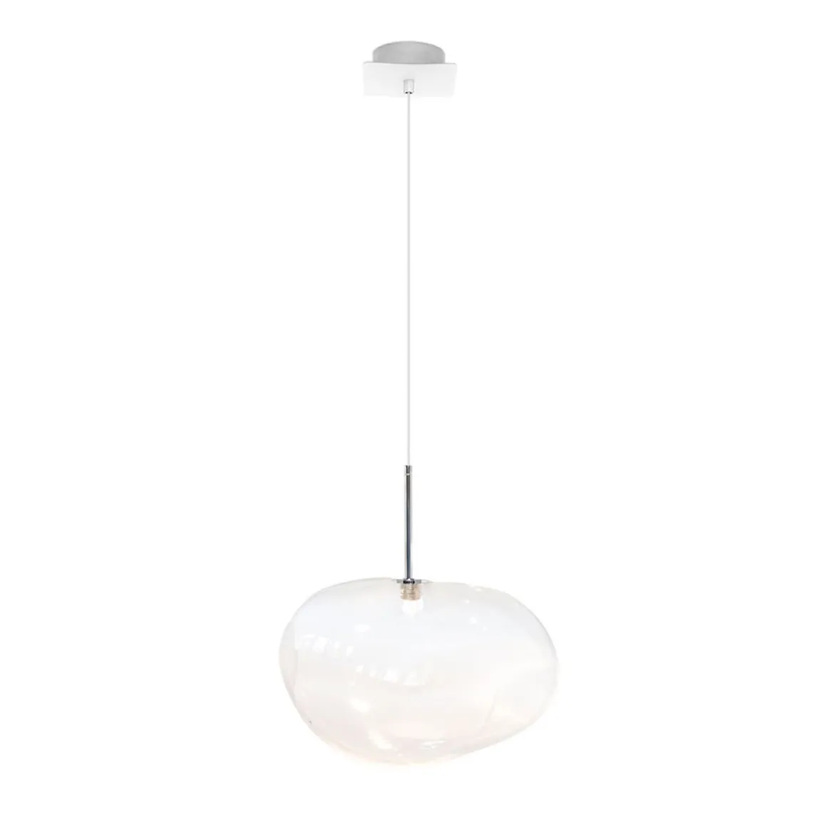 La suspension pendulaire G1 constitue un unique galet de verre italien pour créer une suspension sculpturale et aérienne. Ce galet de verre dessiné et réalisé à la main retranscrit et exploite les qualités de réflexion naturelle d’un verre pur permettant ainsi une excellente diffusion lumineuse. Selon la finition choisie, ce galets arbore une métallisation spéciale du verre. En effet, en version Chrome, le verre translucide se voit se vêtir d’une infime couche métallique, rendant le galet chromée et miroitant lorsque la suspension est éteinte et d’un ton chaud et marbré lorsqu’elle vient à s’allumer. En version Mordorée, le galet se transforme afin de retrouver une ambiance mordorée avec une métallisation ayant pour but d’apporter un subtil ton ambré. Enfin version sombre, le galet vient à s’assombrir afin de retrouver une ambiance feutrée et harmonieuse. Ce galet est suspendu à un disque métallique minimaliste et discret afin de former un plafonnier fluide et dynamique. Il peut aussi être associé a notre dispositif de fixation invisible, supprimant le base de fixation pour un rendu encore plus attrayant. Cette suspension à pour possibilité de s’adapter à vos intérieurs. En effet elle s’ajuste en longueur pour passer de 40 centimètres à 140 centimètres de longueur. Elle peut également permettre de réaliser un chemin de lustre selon votre inspiration et les caractéristiques de la pièce à mettre en lumière.