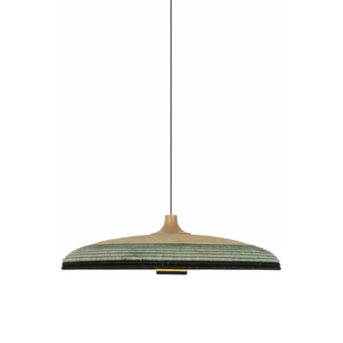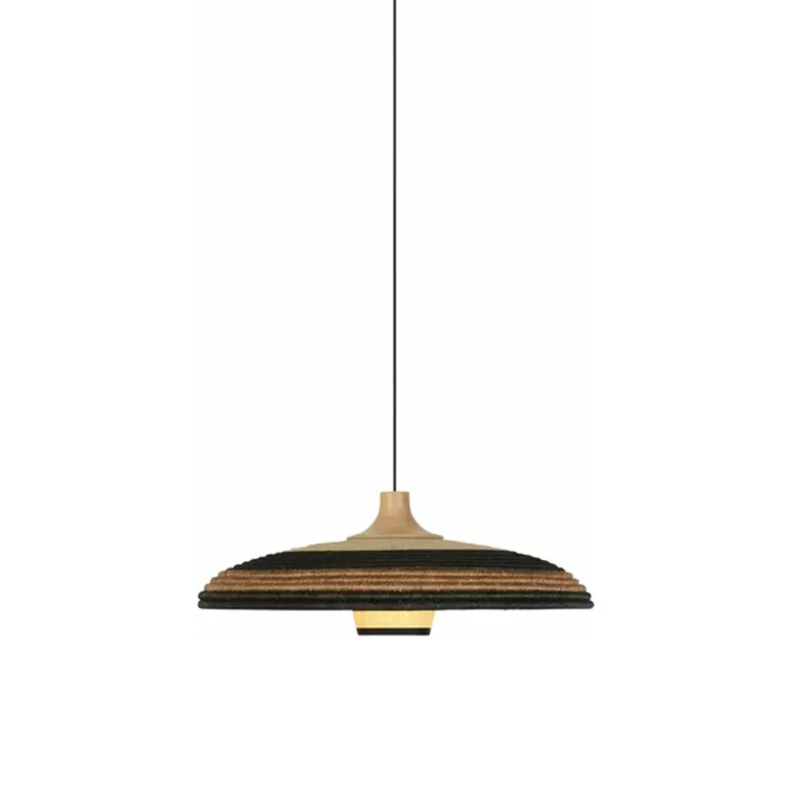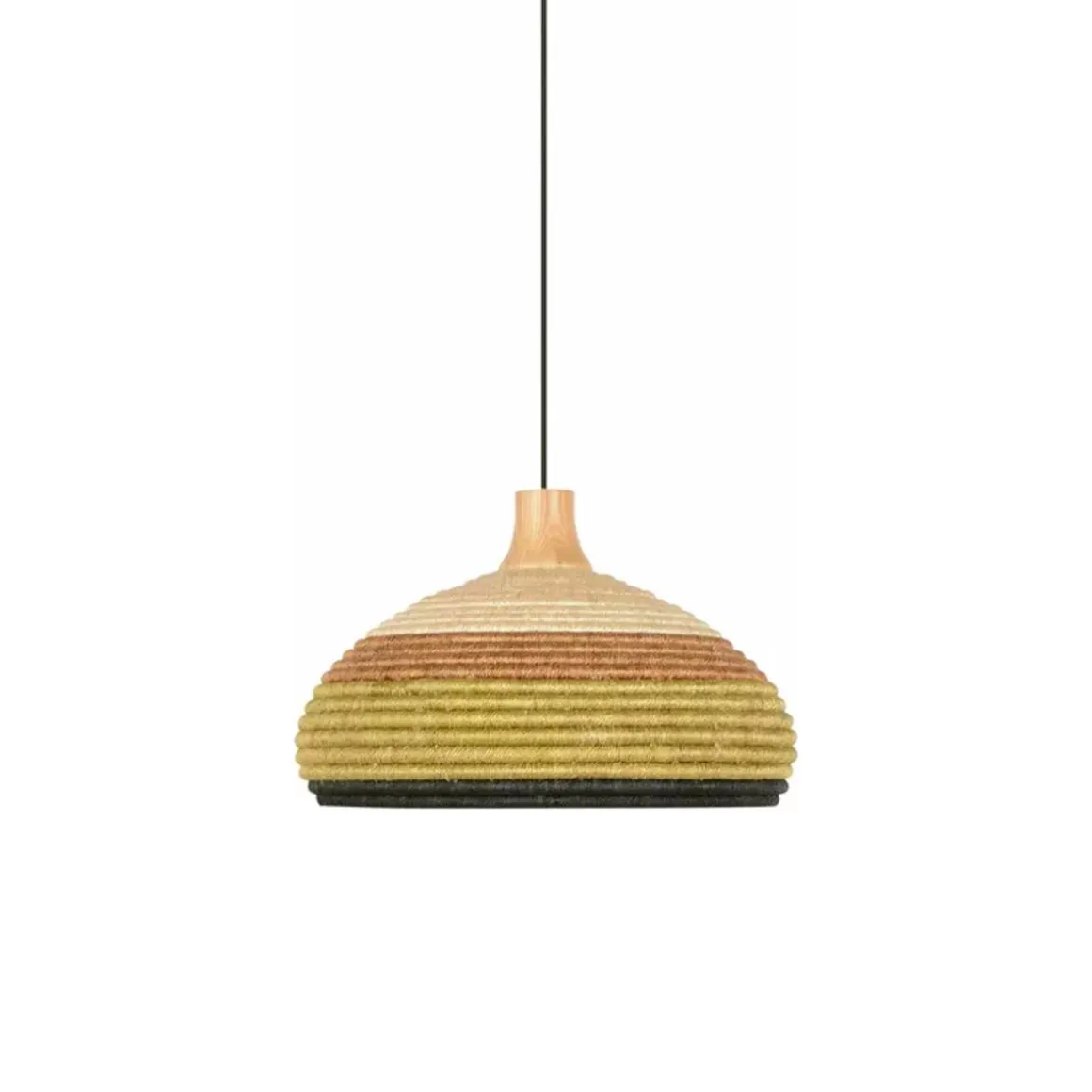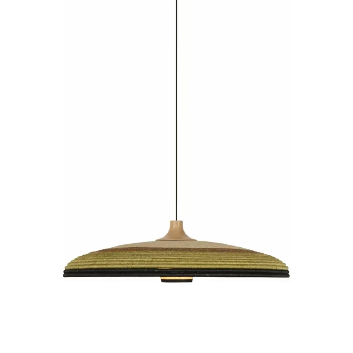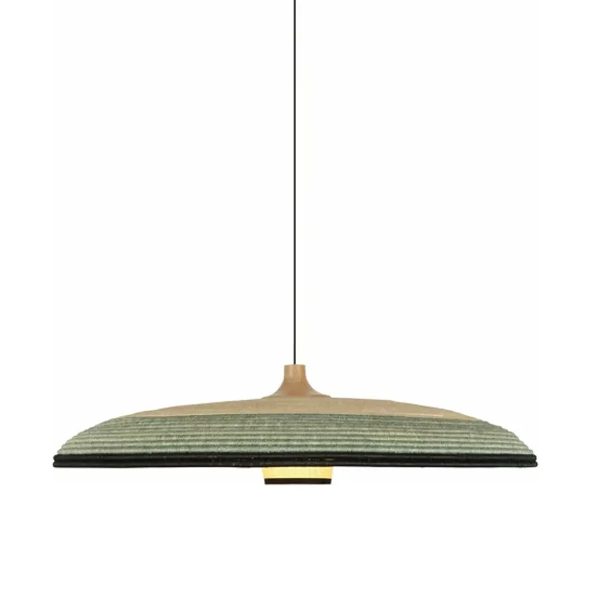 Matériaux : fibre d’abaca et rotin tressée, câble en textile, abat-jour surmonté d’une pièce en chêne massif