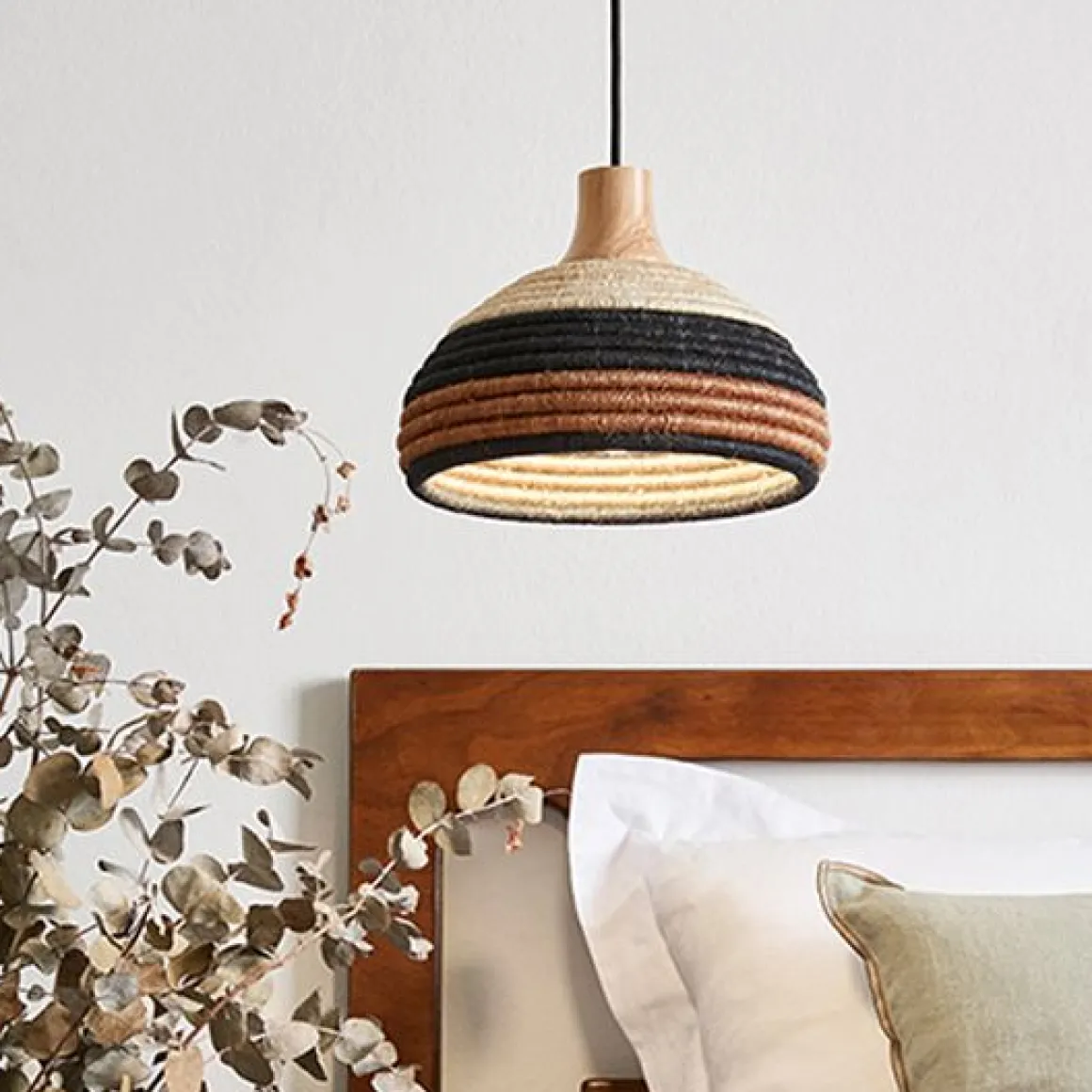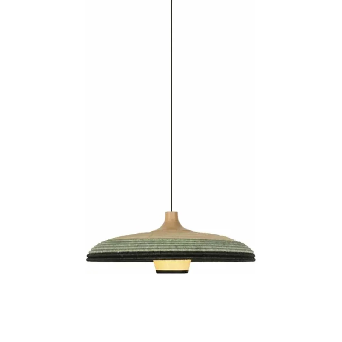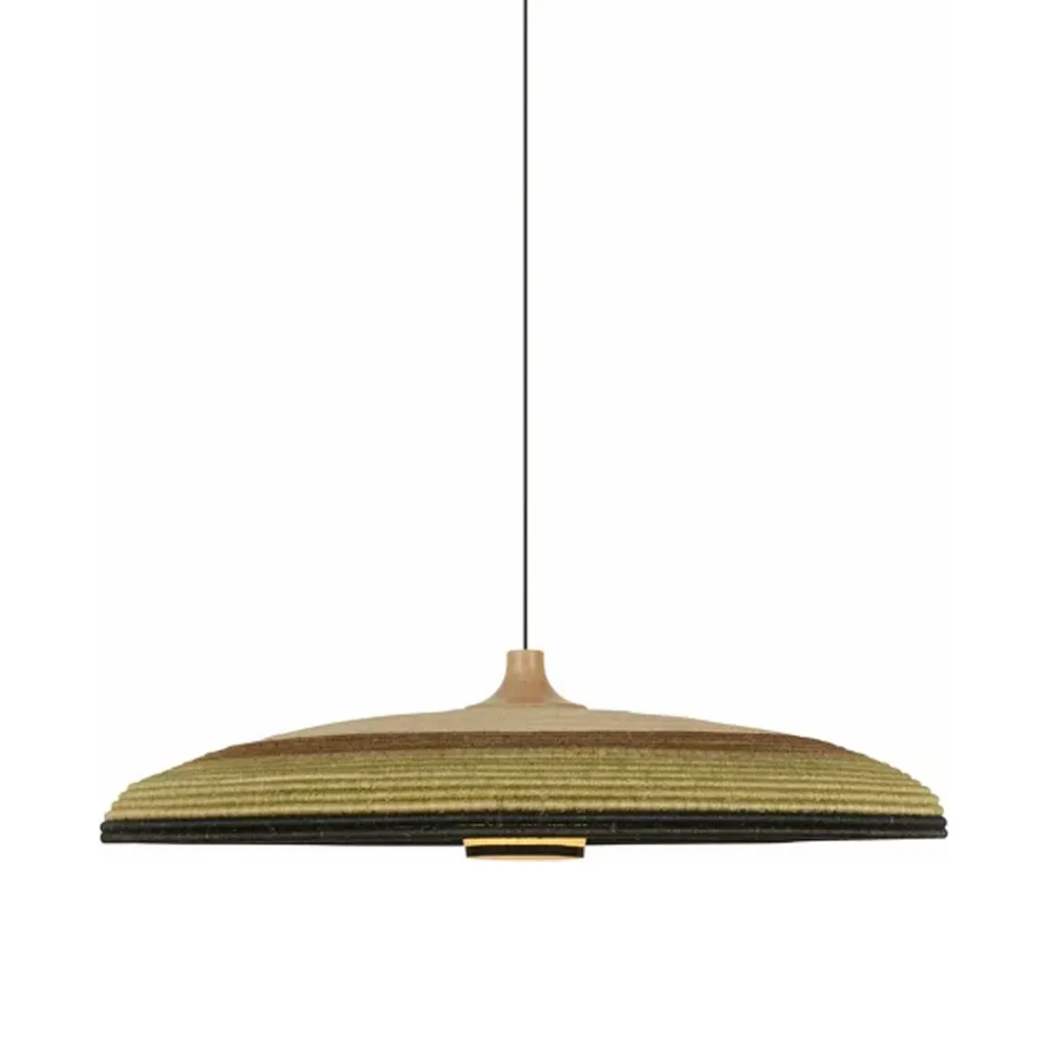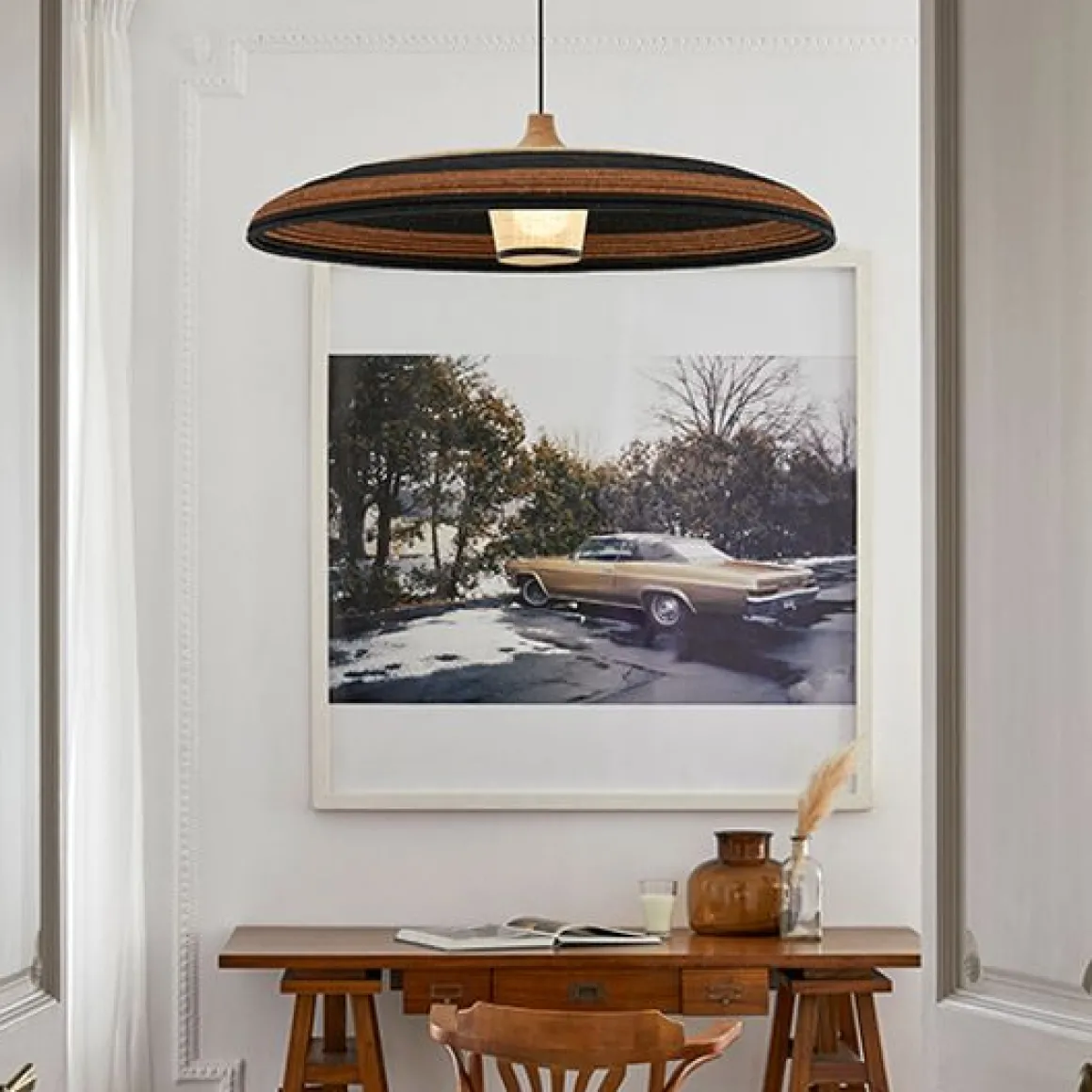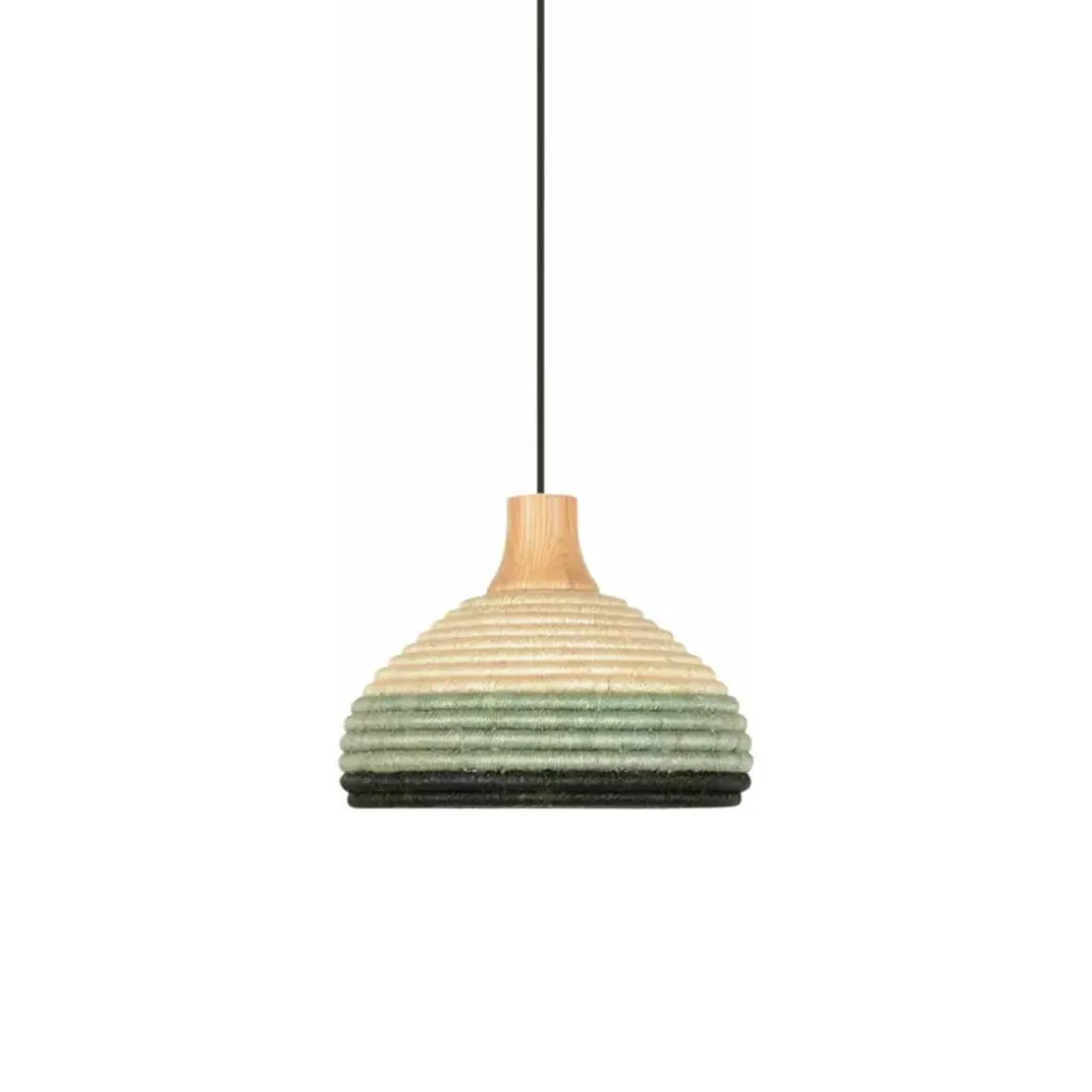 Matériaux : fibre d’abaca et rotin tressée, câble en textile, abat-jour surmonté d’une pièce en chêne massif