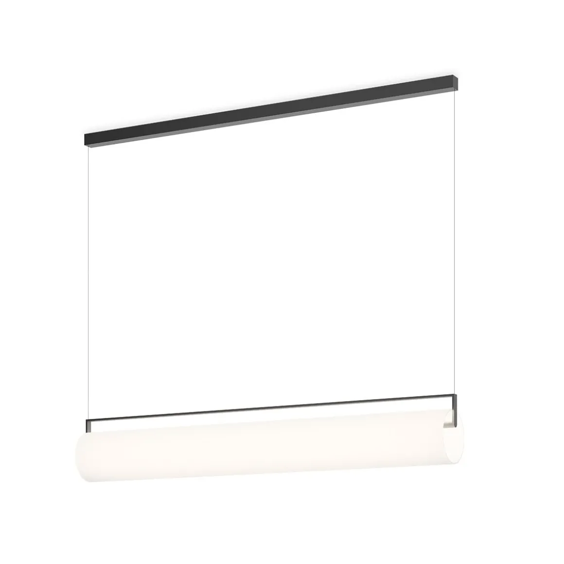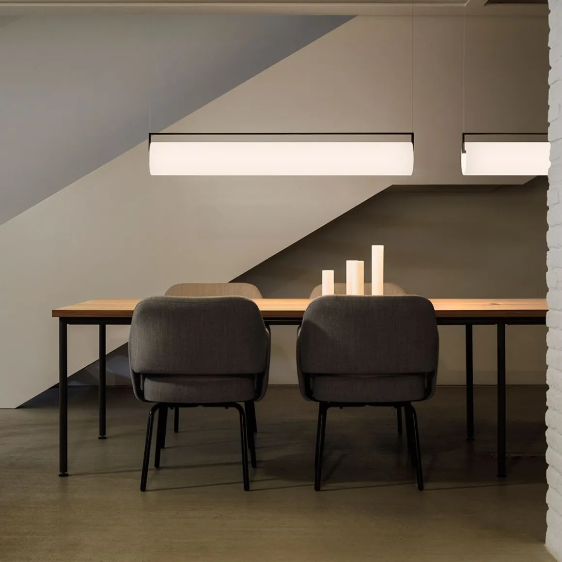 Cette suspension en verre se présente sous la forme d’une barrette de métal ouverte équipée de LEDs, soutenant un diffuseur cylindrique en verre opalin soufflé bouche. Retenue par de fins câbles presque invisibles, elle apporte une lumière chaleureuse, éclairant à 360 degrés.