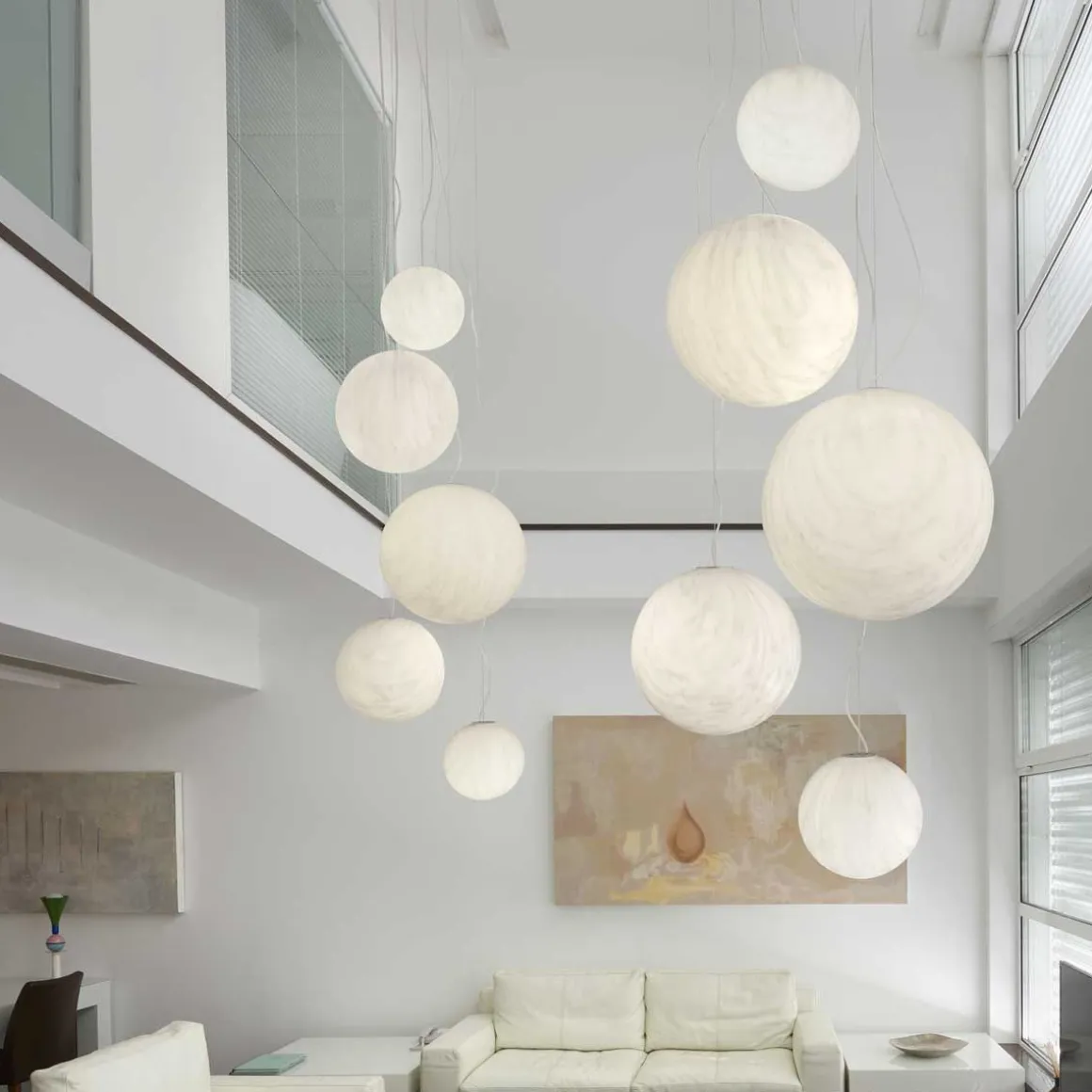 La forme sphérique de Mineral donne de l’élégance à chaque agencement d’intérieur: la finition particulière du polyéthylène marbré enrichit un matériau simple tel que le polyéthylène en lui donnant un aspect précieux tel que celui du marbre. Mineral est idéal pour créer un point lumineux dans les espaces privés. La suspension est proposée en trois diamètres différents avec finition en marbre blanc de Carrare, disponible avec des veines grises. Dans la même collection d’autres modèles sont également disponibles.