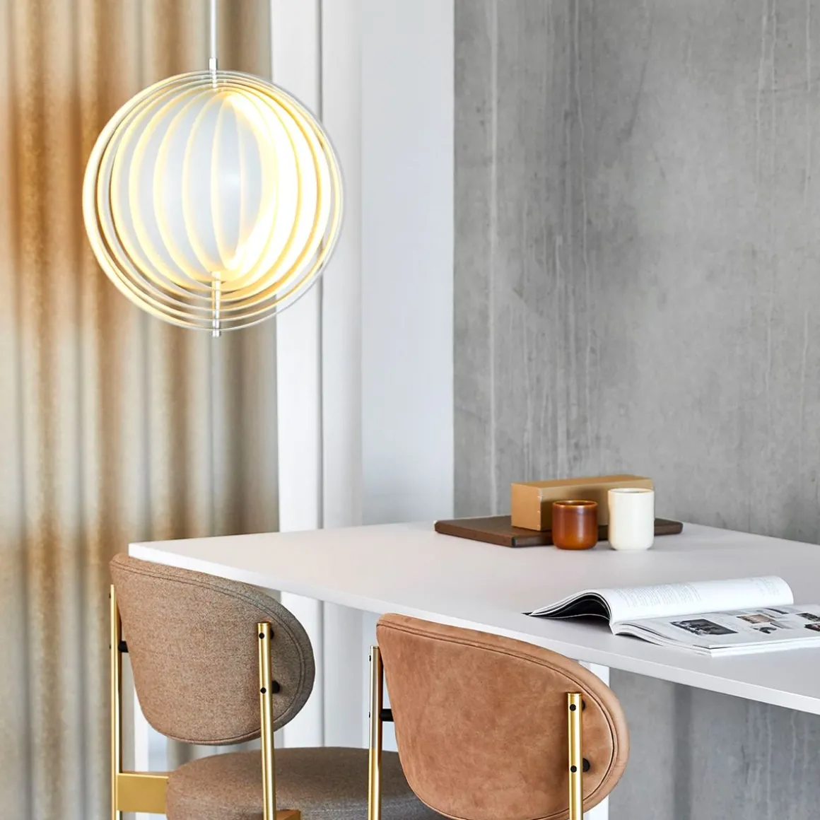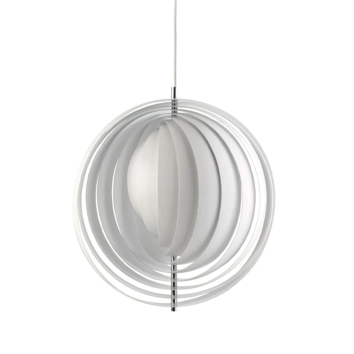 Conçue en 1960, la Moon représente l’une des premières conceptions d’éclairage de Verner Panton. La suspension emblématique se caractérise par son design en éventail avec dix lamelles en forme d’anneau parfaitement positionnées pour fournir une lumière douce, ambiante et sans éblouissement. Les lames réfléchissent et filtrent la lumière et la suspension change d’apparence en fonction de l’angle sous lequel vous la regardez.
