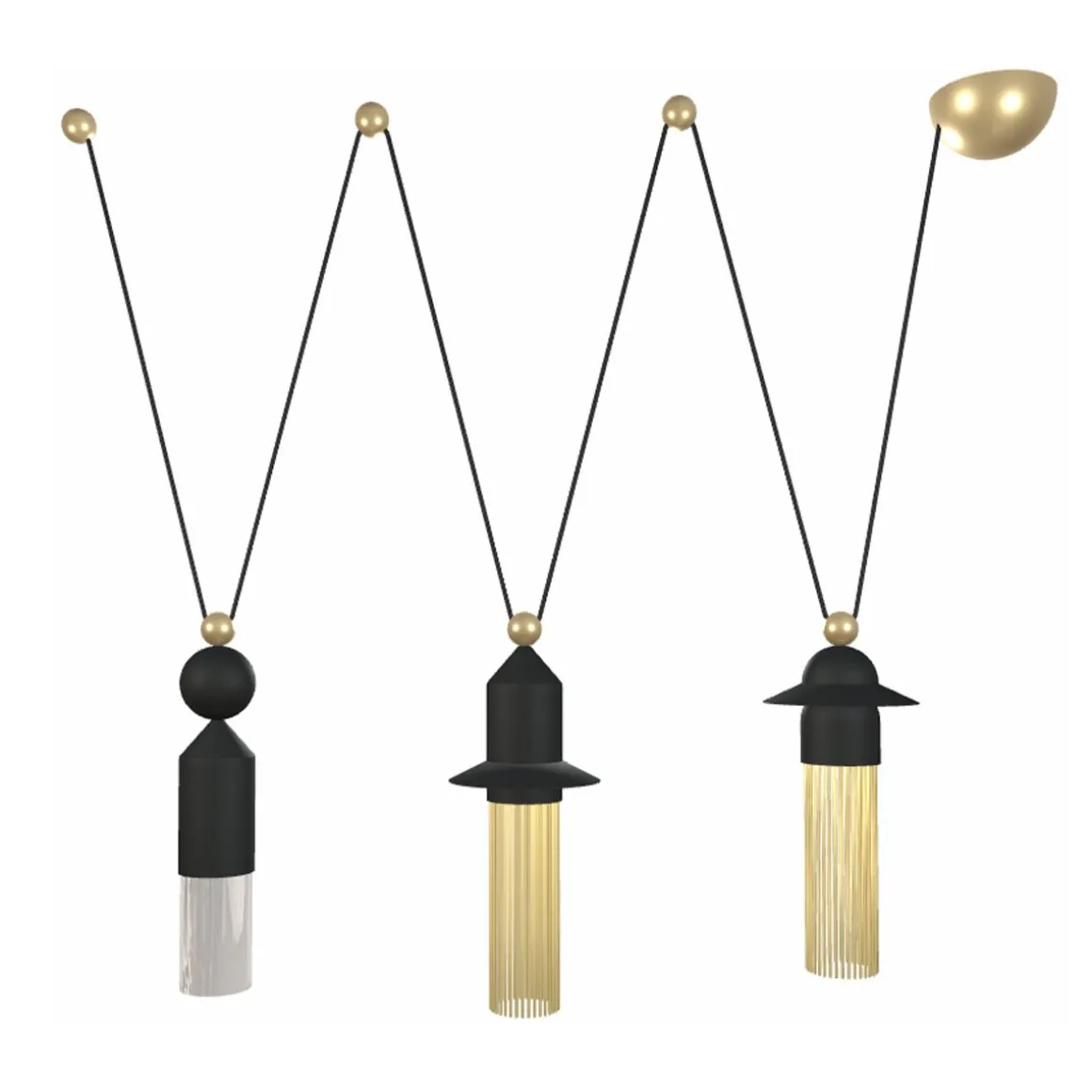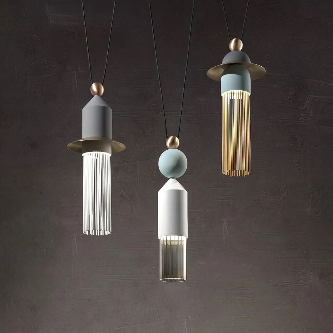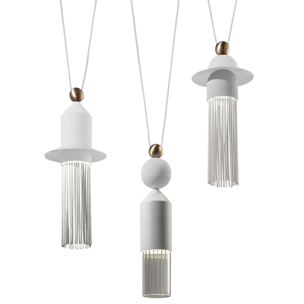 Les lampes à LED originales Nappe par Masiero ont été conçues par Marco Zito et font penser à des glands décoratifs, mais de forme abstraite, minimaliste et en métal et verre. De nombreuses versions et quatre coloris permettent de faire des compositions originales et des concepts lumineux créatifs. Chaque lampe Nappe se compose de formes géométriques simples, de cônes, cylindres, dômes et boules. Les diffuseurs sur la partie inférieure des lampes sont soit en verre, soit en minces tiges de métal formant un grillage. La lumière n’éblouit donc pas sur les côtés et brille en grande partie directement vers le bas. La lumière des LED intégrées est donc d’un agréable blanc chaud et se distingue par un excellent rendu des couleurs, ce qui est très demandé en particulier dans les salons et zones de prises de repas.