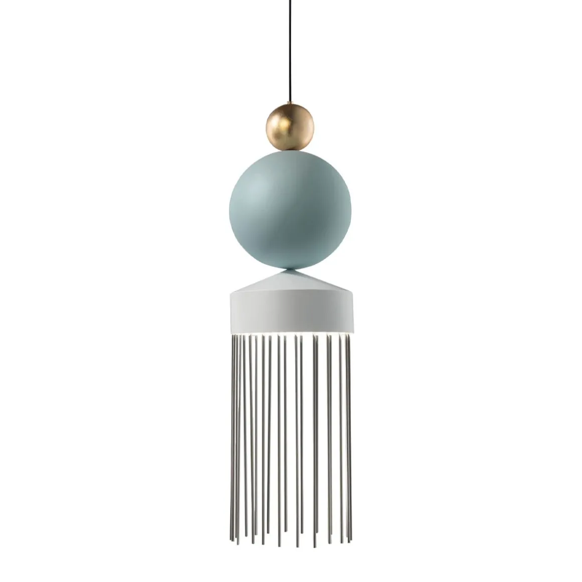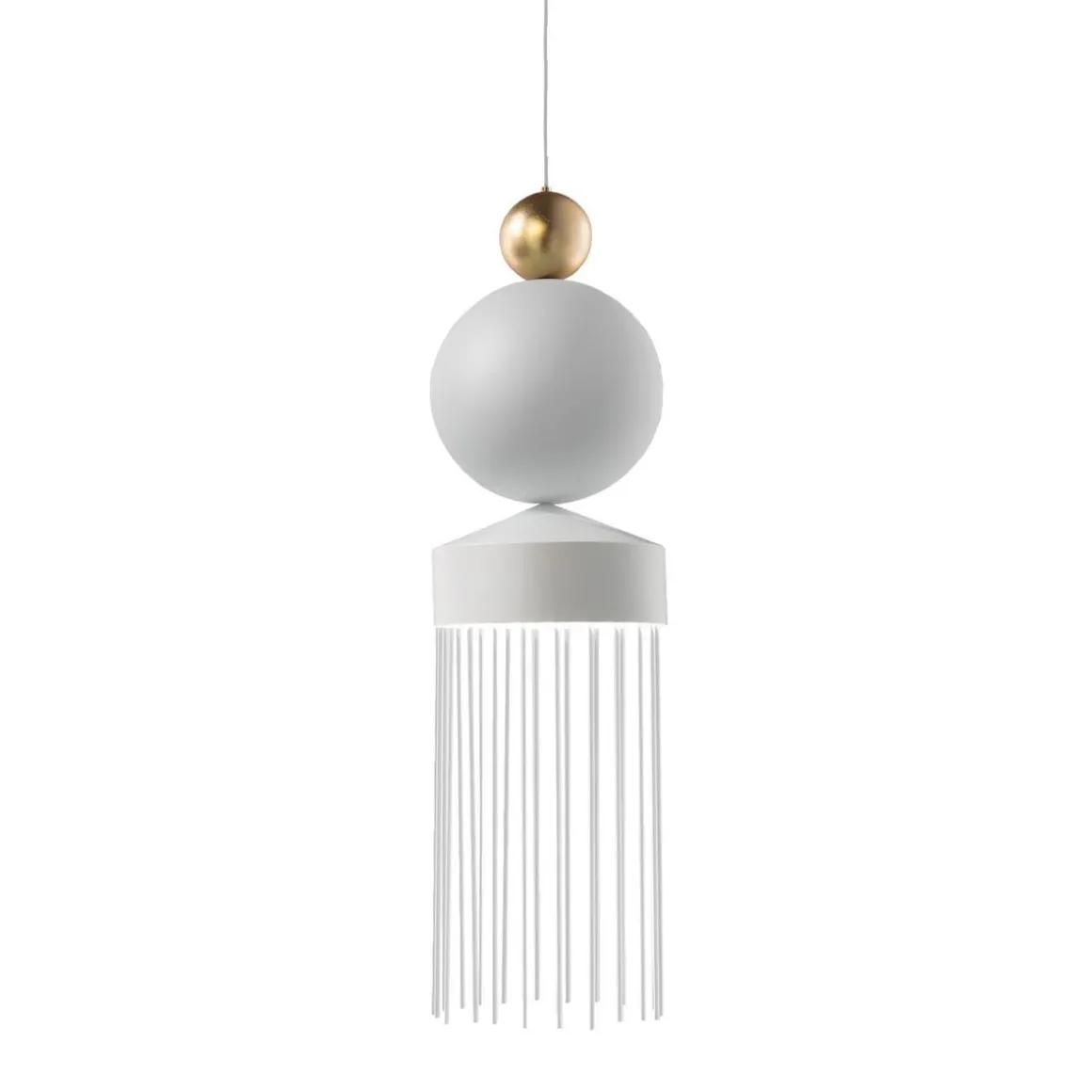 Les lampes à LED originales Nappe par Masiero ont été conçues par Marco Zito et font penser à des glands décoratifs, mais de forme abstraite, minimaliste et en métal et verre. De nombreuses versions et quatre coloris permettent de faire des compositions originales et des concepts lumineux créatifs. Chaque lampe Nappe se compose de formes géométriques simples, de cônes, cylindres, dômes et boules. Les diffuseurs sur la partie inférieure des lampes sont soit en verre, soit en minces tiges de métal formant un grillage. La lumière n’éblouit donc pas sur les côtés et brille en grande partie directement vers le bas. La lumière des LED intégrées est donc d’un agréable blanc chaud et se distingue par un excellent rendu des couleurs, ce qui est très demandé en particulier dans les salons et zones de prises de repas.