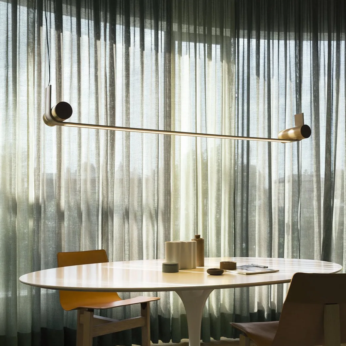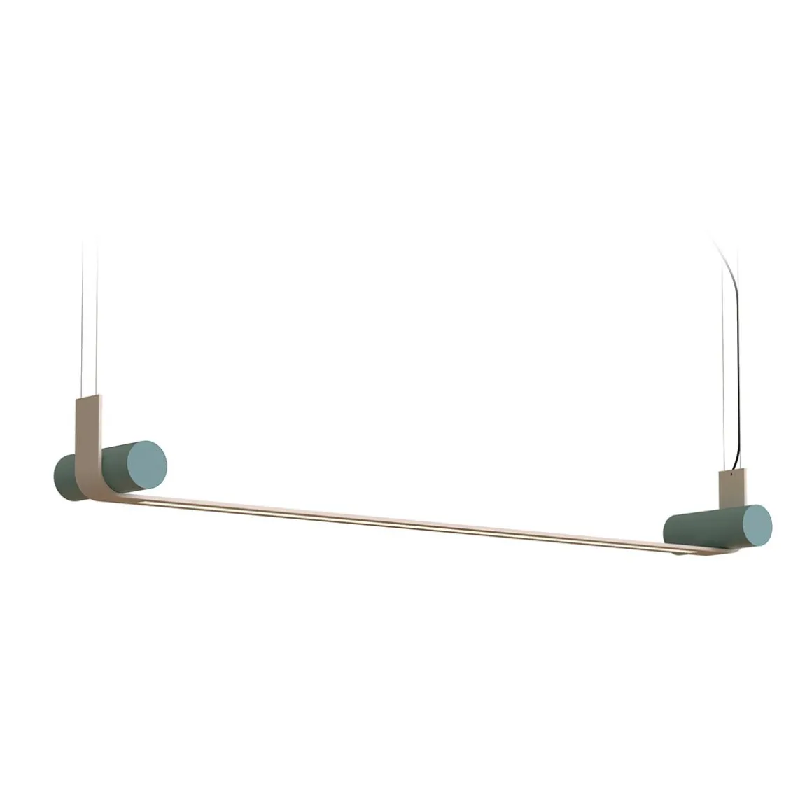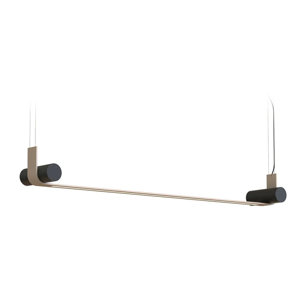 La suspension est recouverte d’une poudre époxy structure en bande d’aluminium accompagnée d’un poids cylindrique qui contrebalance sa flexuosité, dans un équilibre visuel raffiné. La source de lumière se compose d’une bande LED à intensité variable ; les cylindres sont disponible en métal enduit de poudre époxy, en bois et en brossé laiton.