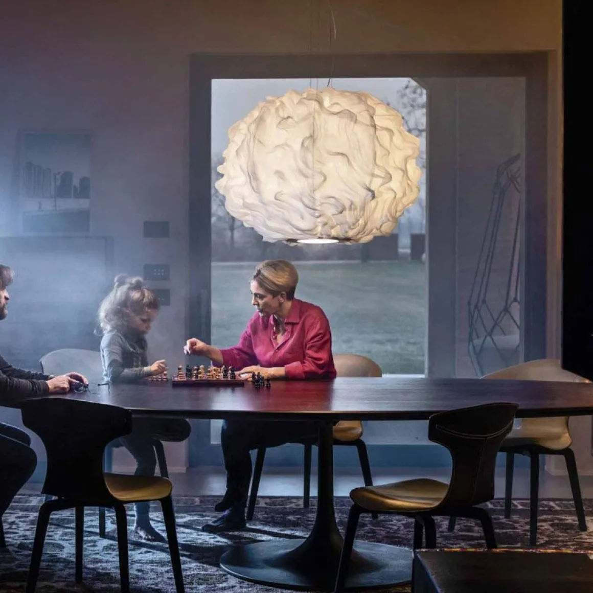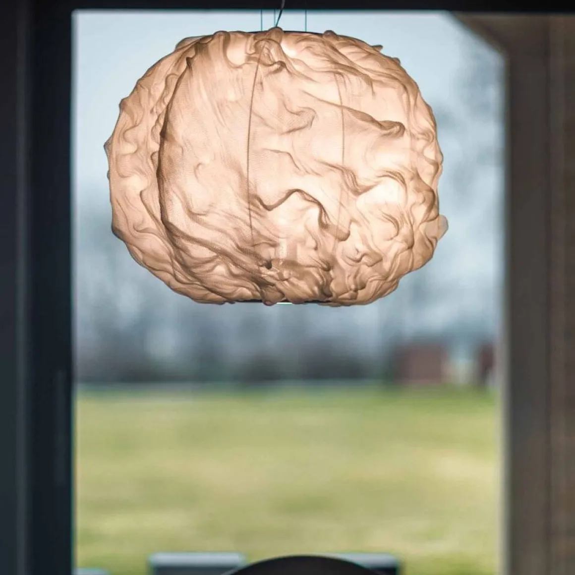 Comme une multitude d’êtres ou de choses regroupées d’une manière apparemment guidée, mais en réalité aléatoire, Nuée génère un contraste entre spontanéité et coordination dans une lampe dont la physionomie ne peut être appréhendée, mais simplement contemplée. Nuée est une lampe de présence théâtrale réalisée en superposant un tissu technique tridimensionnel, que la lumière traverse de manière irrégulière et évocatrice. Le fil continu du tissage permet des déformations qui deviennent poétiques: des zones sombres apparaissent sur une base blanche, comme un nuage qui assombrit sa couleur dans les zones plus compactes.