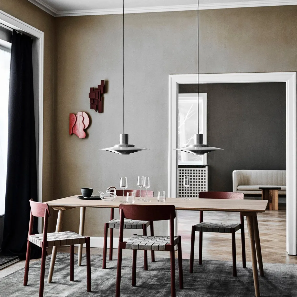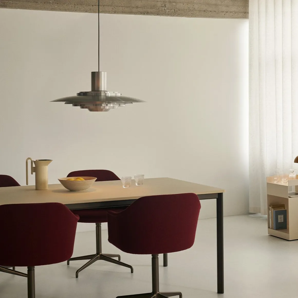 La suspension P376 est un parfait exemple de la subtile conception architecturale de Kastholm & Fabricius. Conçu à l’origine en 1963, cinq abat-jour concentriques créent des dégradés de courbes vers le milieu de la lampe pour émettre une lumière douce et diffuse. Le placement discret des abat-jour et la finition en aluminium soyeux aboutissent à une expression cohérente à la fois emblématique et captivante.
