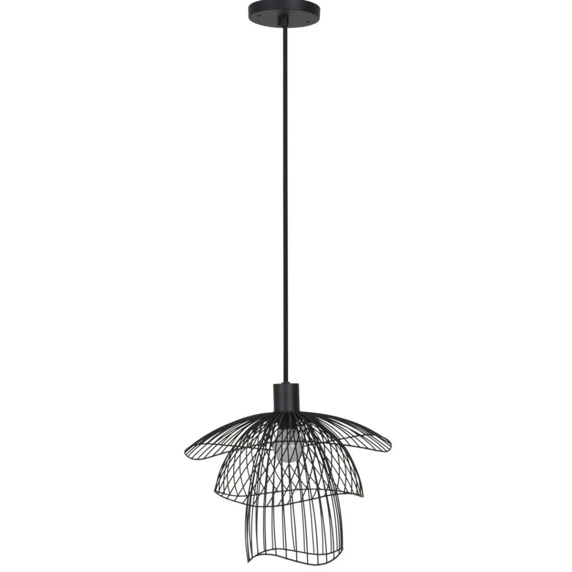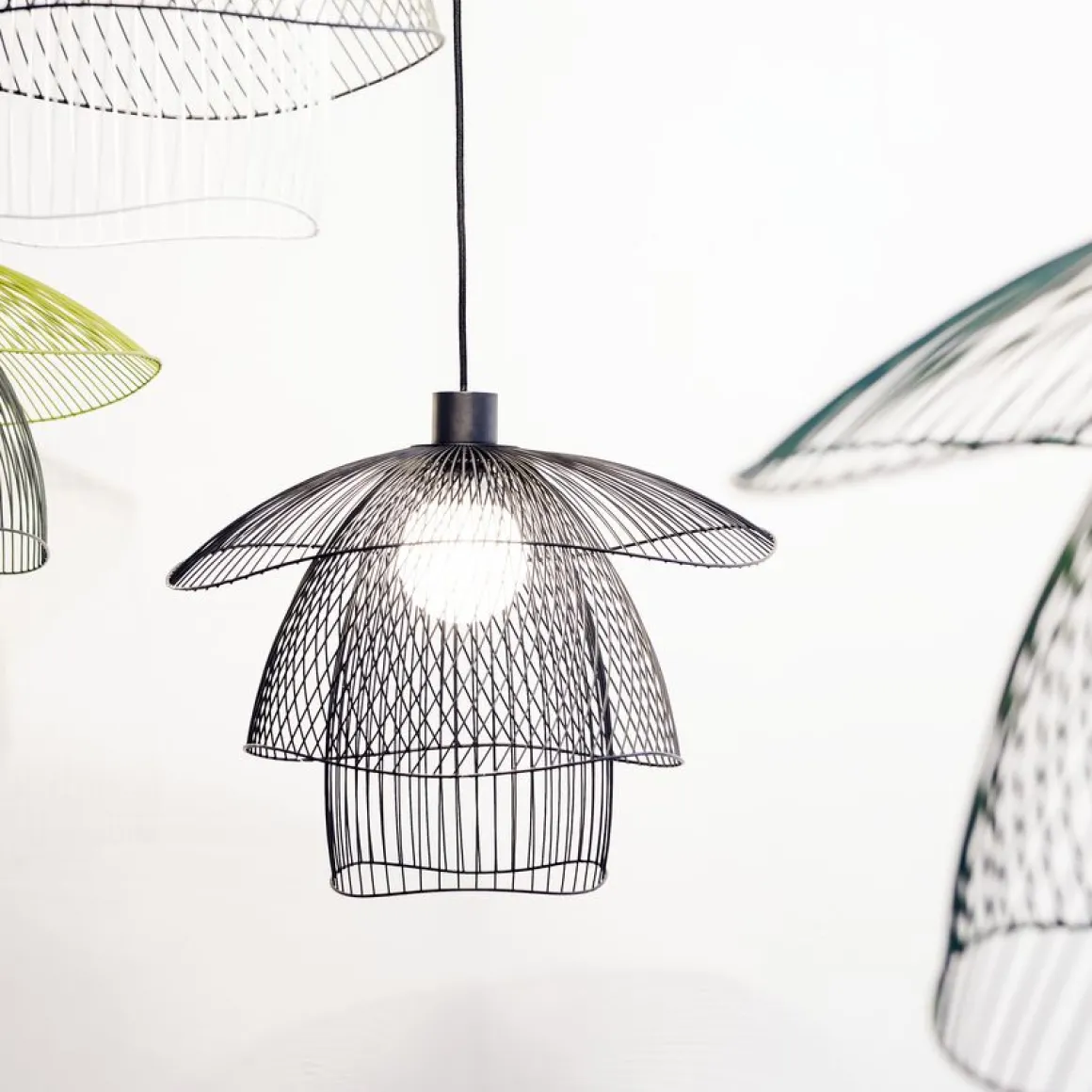 Crée par la designer française Elise Fouin, cette suspension affiche une silhouette légère. La lumière filtrant à travers les multiples fils de métal offre un magnifique éclairage. Suspension composée de 3 carcasses en métal superposée, équipée d’une cordelière textile.