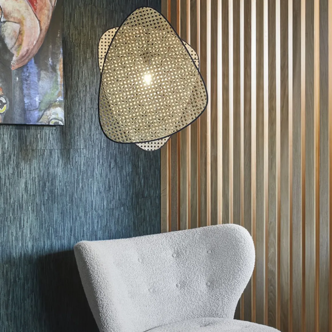 Suspension une lumière structure en métal peint, deux écrans en papier. Équipée d’une cordelière textile et d’un pavillon en métal adaptable DCL.