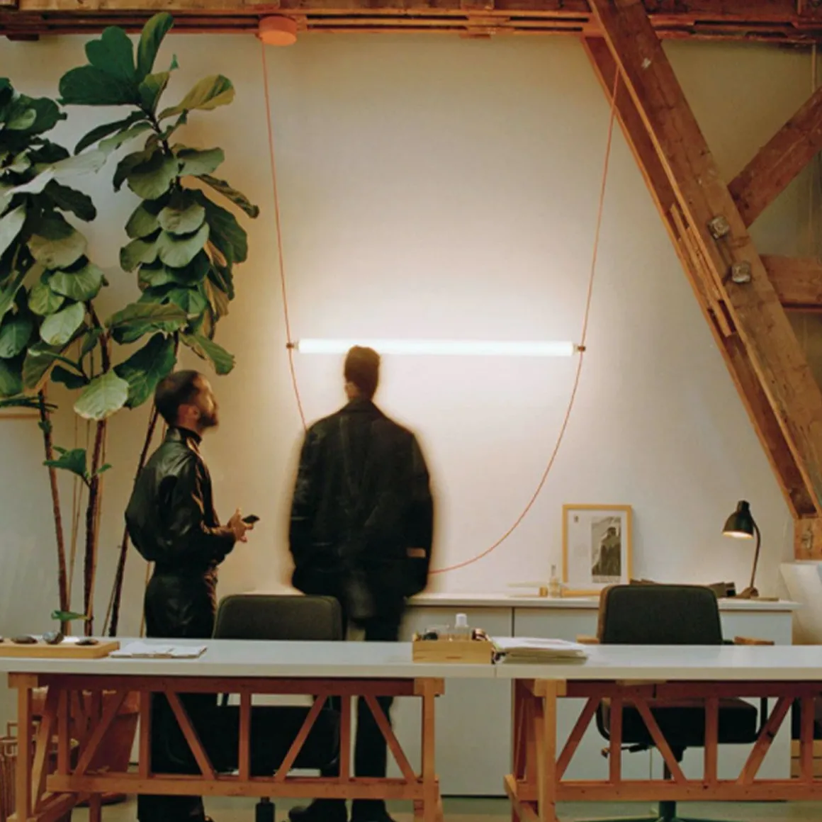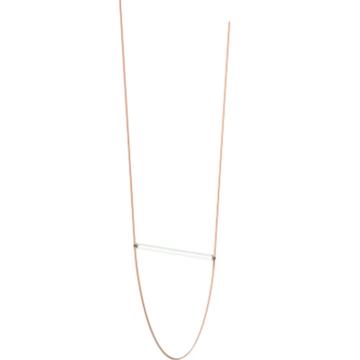 Suspension à lumière diffuse. Tube en verre extrudé transparent et diffuseur intérieur en PC opale. Écrous en acier inoxydable satiné fabriqués avec la technologie CNC. Câble en caoutchouc extrudé rose et vert forêt. Rosette en PC moulé par injection dans les mêmes finitions que le câble.
