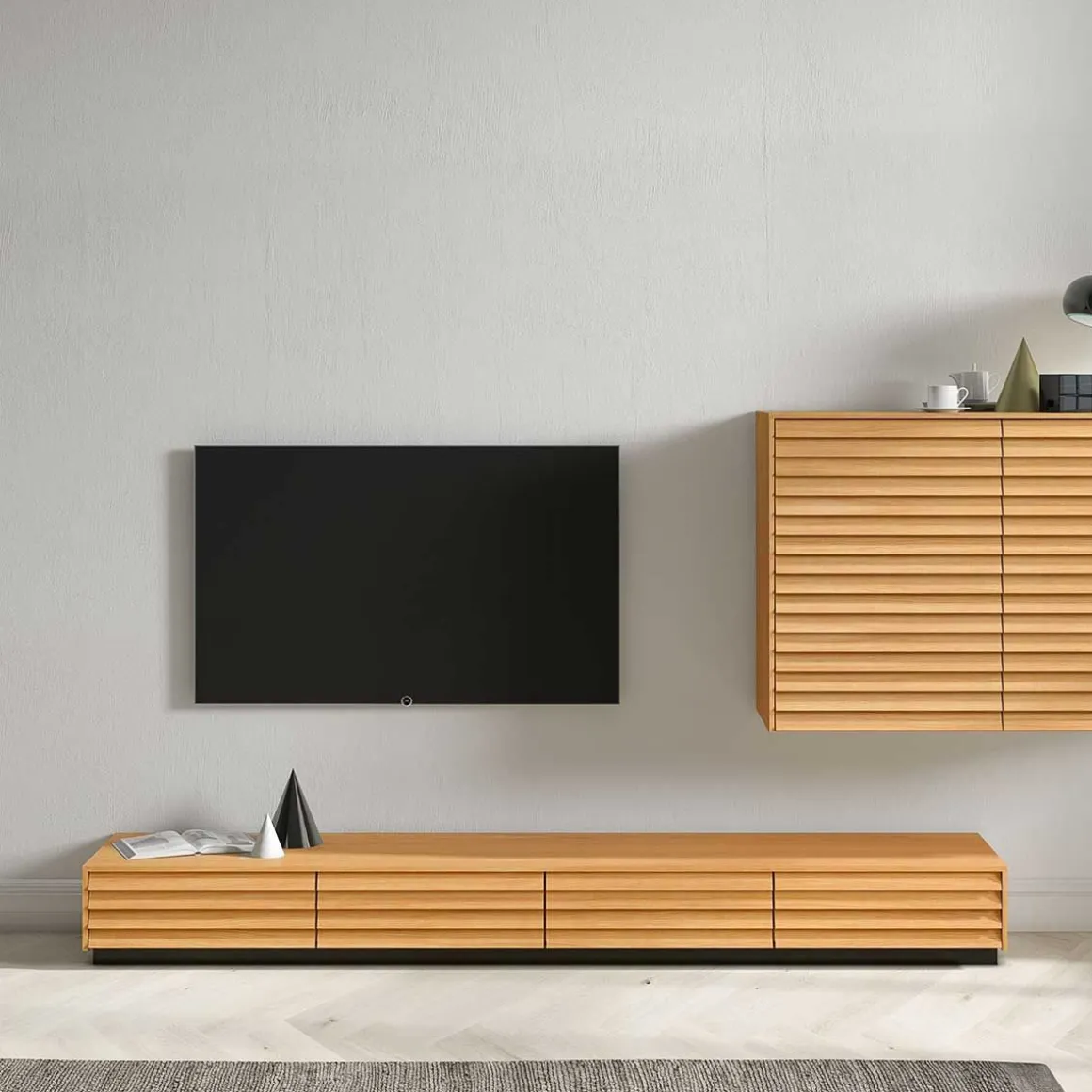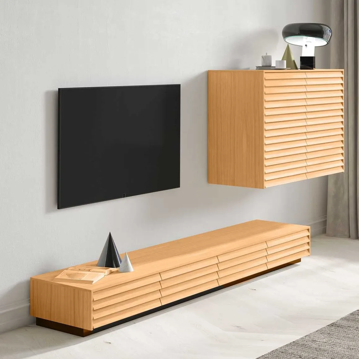 Buffet au design exclusif sur la face avant composée de barres horizontales qui cachent la composition et servent de poignées pour les portes et les tiroirs. Un meuble reposant sur un socle, les éléments de porte comprennent une tablette réglable en hauteur, plusieurs modèles sont disponibles.