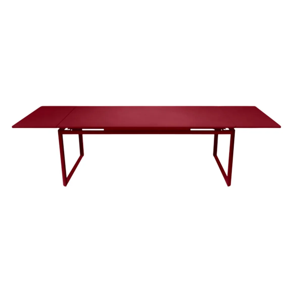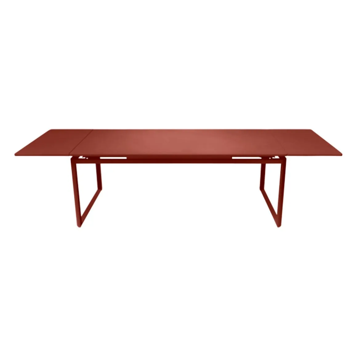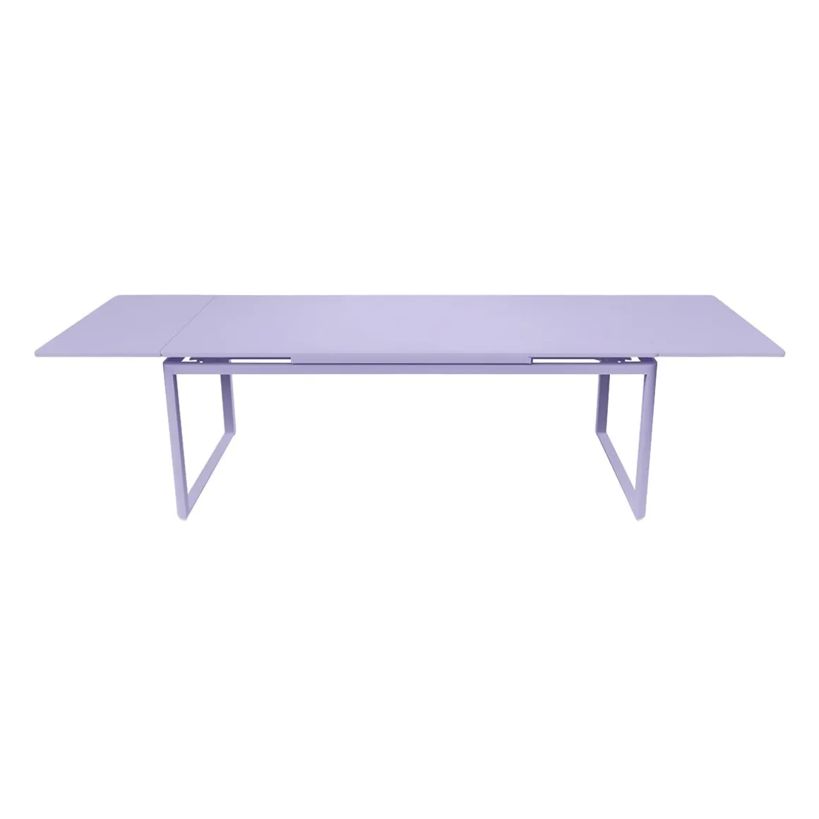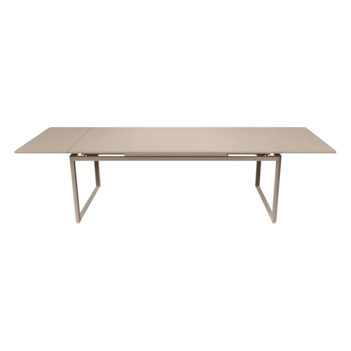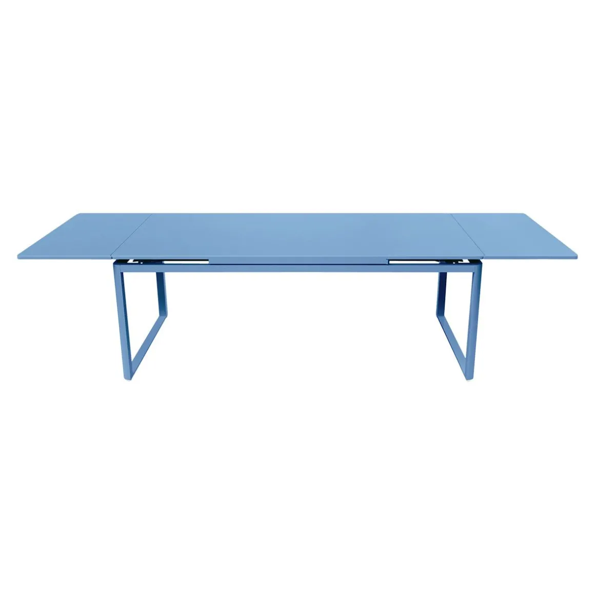 Table à allonges Biarritz de Fermob. La table à allonges Biarritz, née de la créativité du Studio Fermob, s’adapte à votre nombre d’invités. Petit comité ou grandes assemblées ? Elle convient dans tous les cas, passant de 2 m à 2,50 m avec une allonge, et jusqu’à 3 m si besoin, avec deux allonges, ce qui permet d’accueillir jusqu’à 14 personnes ! Futées, ses rallonges latérales de 50 cm chacune, très pratiques à installer en bout de table : il suffit pour cela de les faire coulisser. Tirez-en une et hop, voilà votre invité de dernière minute installé ! Et pour les ranger, c’est facile : elles se glissent sous le plateau et sont alors complètement dissimulées. Le piètement aluminium et le plateau acier de cette grande table de jardin lui garantissent une durabilité exceptionnelle, comme à tout le mobilier, grâce notamment au traitement anti-corrosion et anti-UV. Ainsi qu’à la solidité des matériaux qui la composent et à sa conception. Une cale de table pour l’hivernage permet d’éviter que l’eau s’accumule sur son plateau à la saison froide.