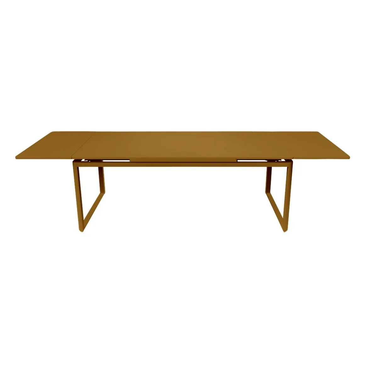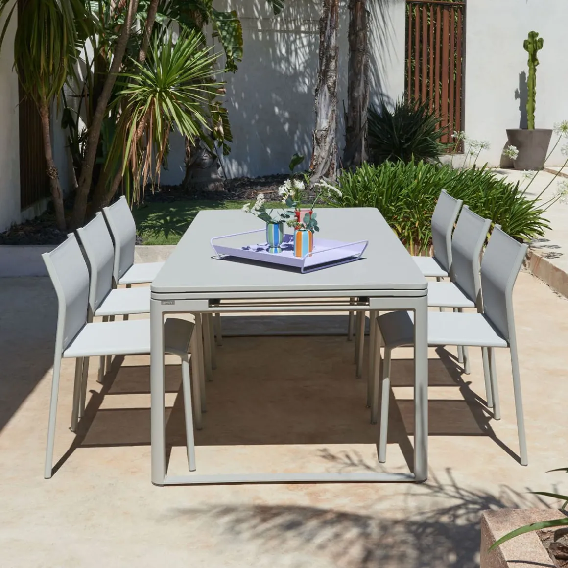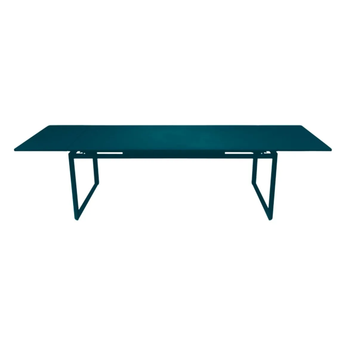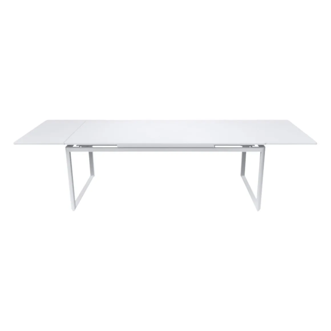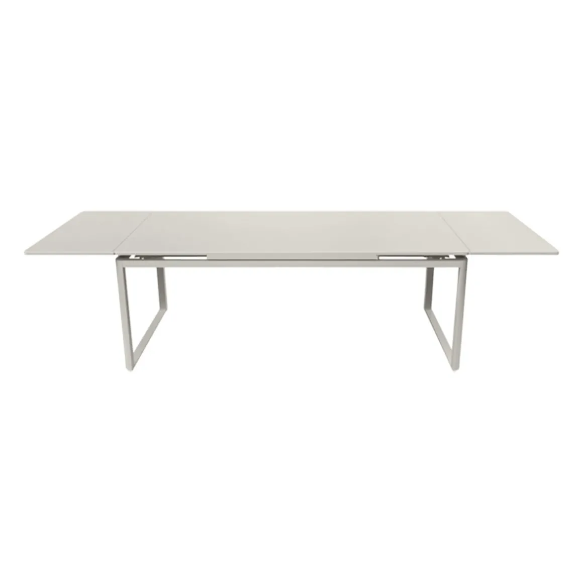 Table à allonges Biarritz de Fermob. La table à allonges Biarritz, née de la créativité du Studio Fermob, s’adapte à votre nombre d’invités. Petit comité ou grandes assemblées ? Elle convient dans tous les cas, passant de 2 m à 2,50 m avec une allonge, et jusqu’à 3 m si besoin, avec deux allonges, ce qui permet d’accueillir jusqu’à 14 personnes ! Futées, ses rallonges latérales de 50 cm chacune, très pratiques à installer en bout de table : il suffit pour cela de les faire coulisser. Tirez-en une et hop, voilà votre invité de dernière minute installé ! Et pour les ranger, c’est facile : elles se glissent sous le plateau et sont alors complètement dissimulées. Le piètement aluminium et le plateau acier de cette grande table de jardin lui garantissent une durabilité exceptionnelle, comme à tout le mobilier, grâce notamment au traitement anti-corrosion et anti-UV. Ainsi qu’à la solidité des matériaux qui la composent et à sa conception. Une cale de table pour l’hivernage permet d’éviter que l’eau s’accumule sur son plateau à la saison froide.
