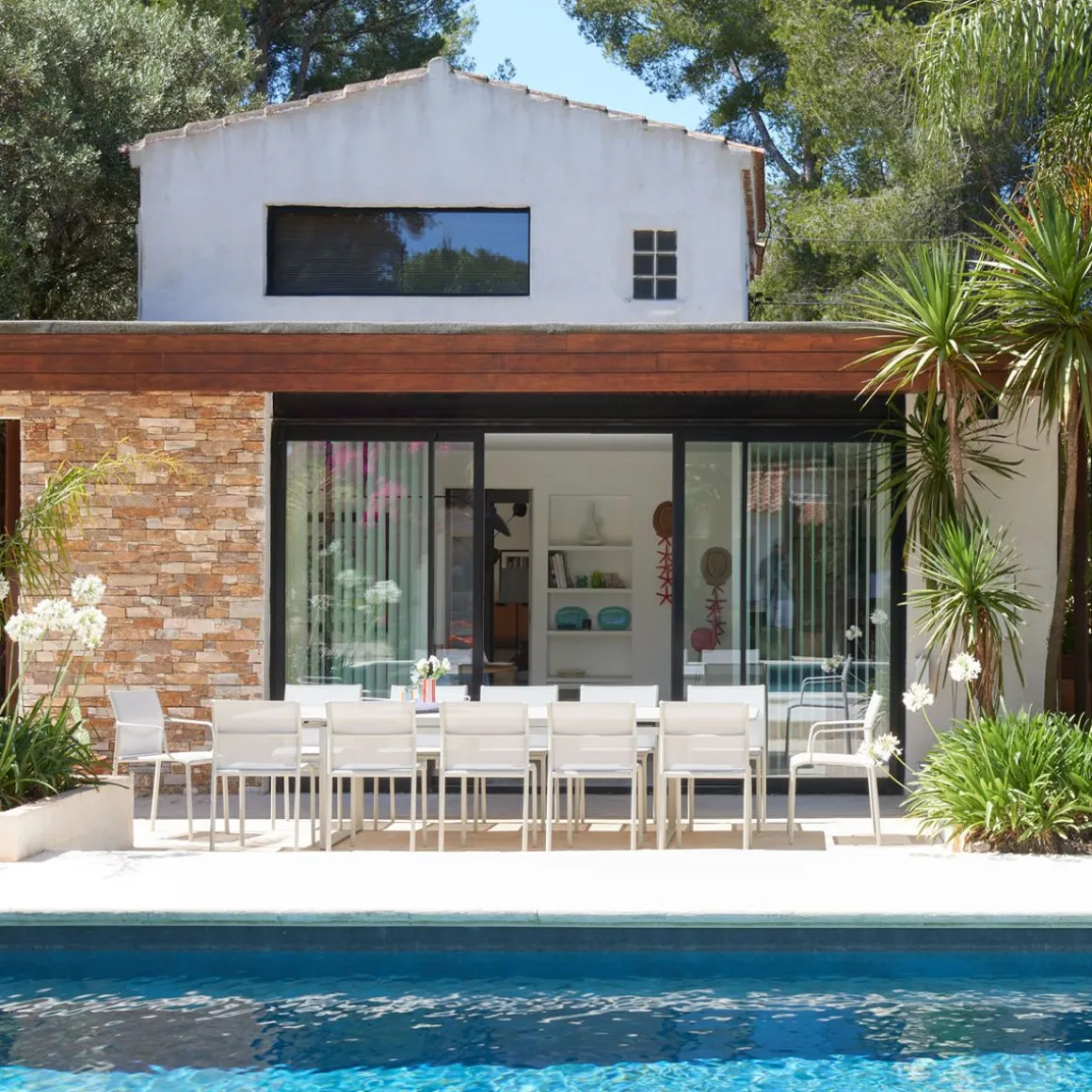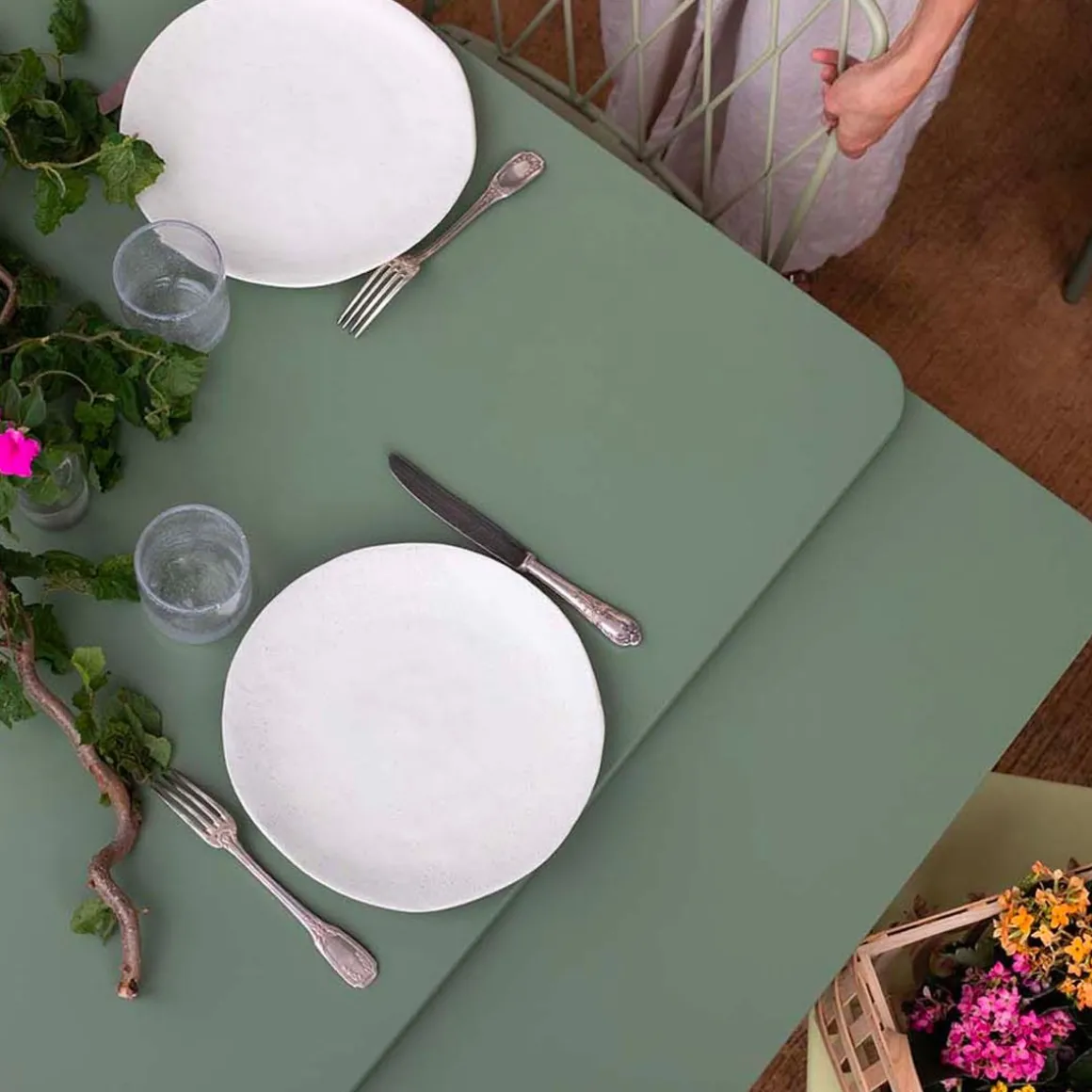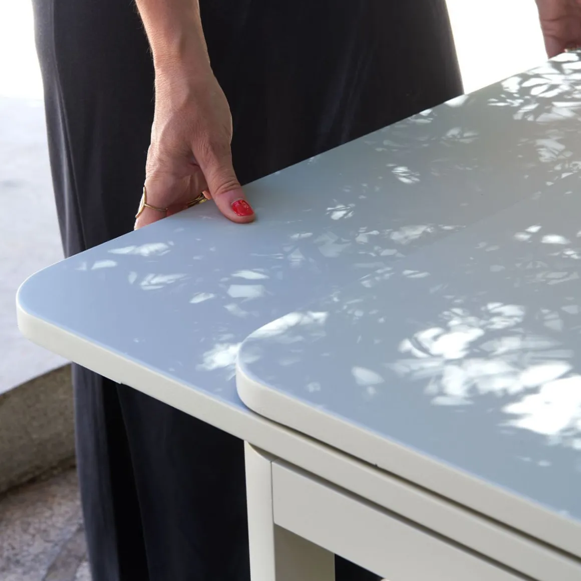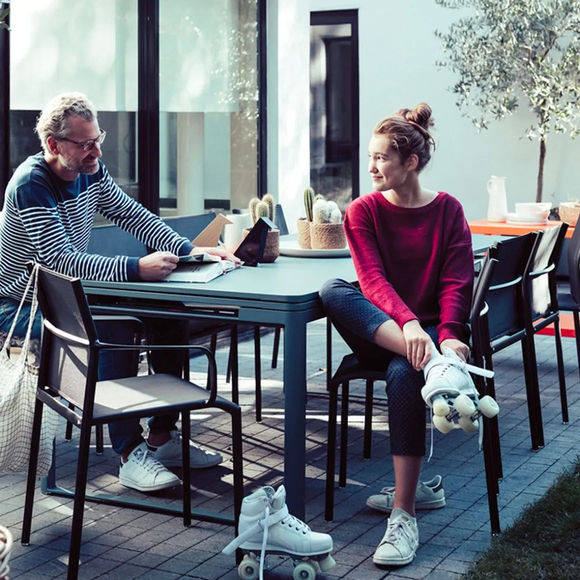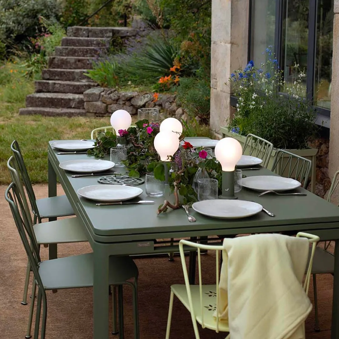 Table à allonges Biarritz de Fermob. La table à allonges Biarritz, née de la créativité du Studio Fermob, s’adapte à votre nombre d’invités. Petit comité ou grandes assemblées ? Elle convient dans tous les cas, passant de 2 m à 2,50 m avec une allonge, et jusqu’à 3 m si besoin, avec deux allonges, ce qui permet d’accueillir jusqu’à 14 personnes ! Futées, ses rallonges latérales de 50 cm chacune, très pratiques à installer en bout de table : il suffit pour cela de les faire coulisser. Tirez-en une et hop, voilà votre invité de dernière minute installé ! Et pour les ranger, c’est facile : elles se glissent sous le plateau et sont alors complètement dissimulées. Le piètement aluminium et le plateau acier de cette grande table de jardin lui garantissent une durabilité exceptionnelle, comme à tout le mobilier, grâce notamment au traitement anti-corrosion et anti-UV. Ainsi qu’à la solidité des matériaux qui la composent et à sa conception. Une cale de table pour l’hivernage permet d’éviter que l’eau s’accumule sur son plateau à la saison froide.