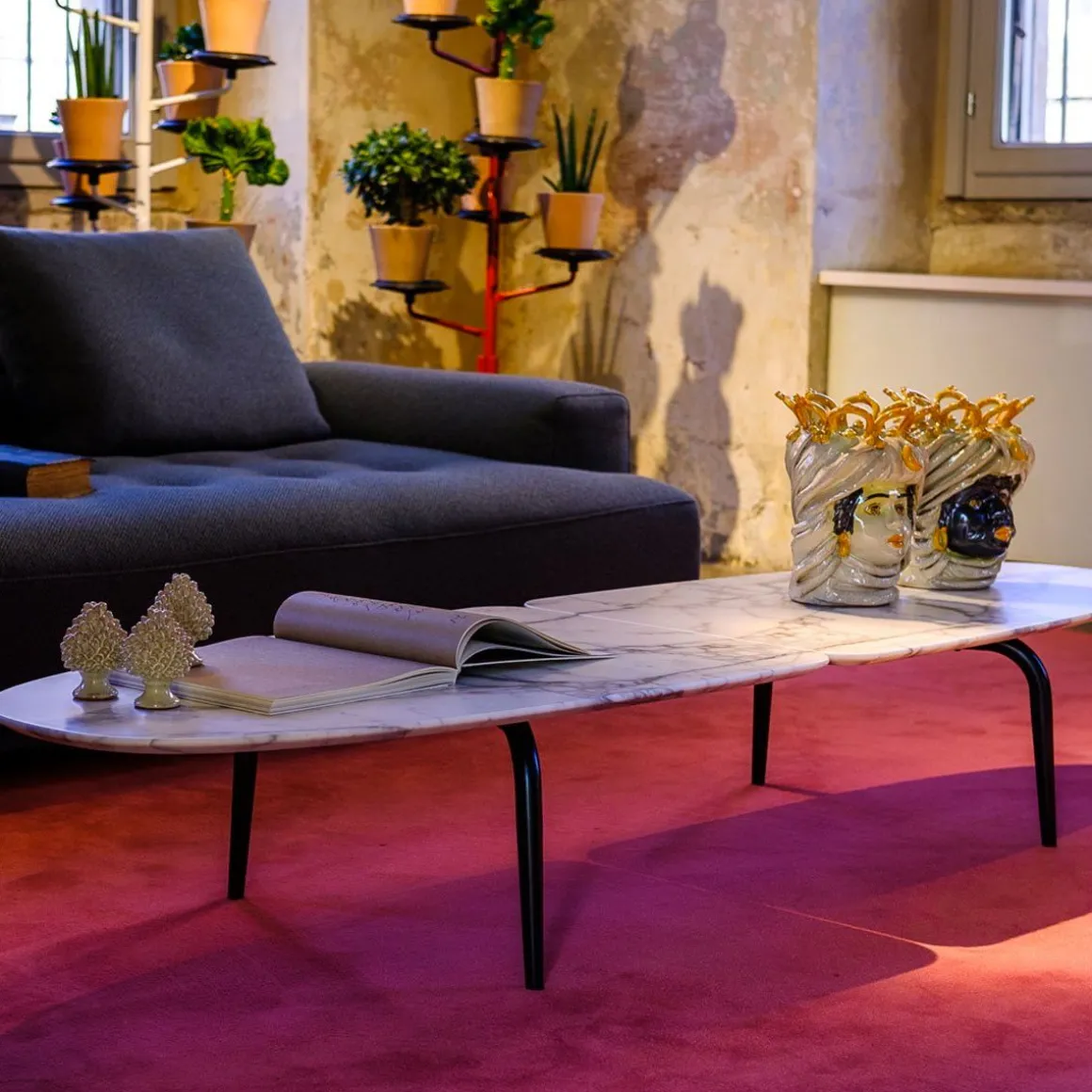 Des tables basses inspirées de deux concepts et de deux éléments naturels : le graphisme et la symétrie, le marbre et les papillons tropicaux. En combinant ces éléments apparemment contradictoires, l’éthéré d’un battement d’aile et la solidité de la pierre, nous avons créé un complément d’ameublement de goût contemporain : un plateau massif en marbre naturel soutenu par une structure organique élancée en acier.