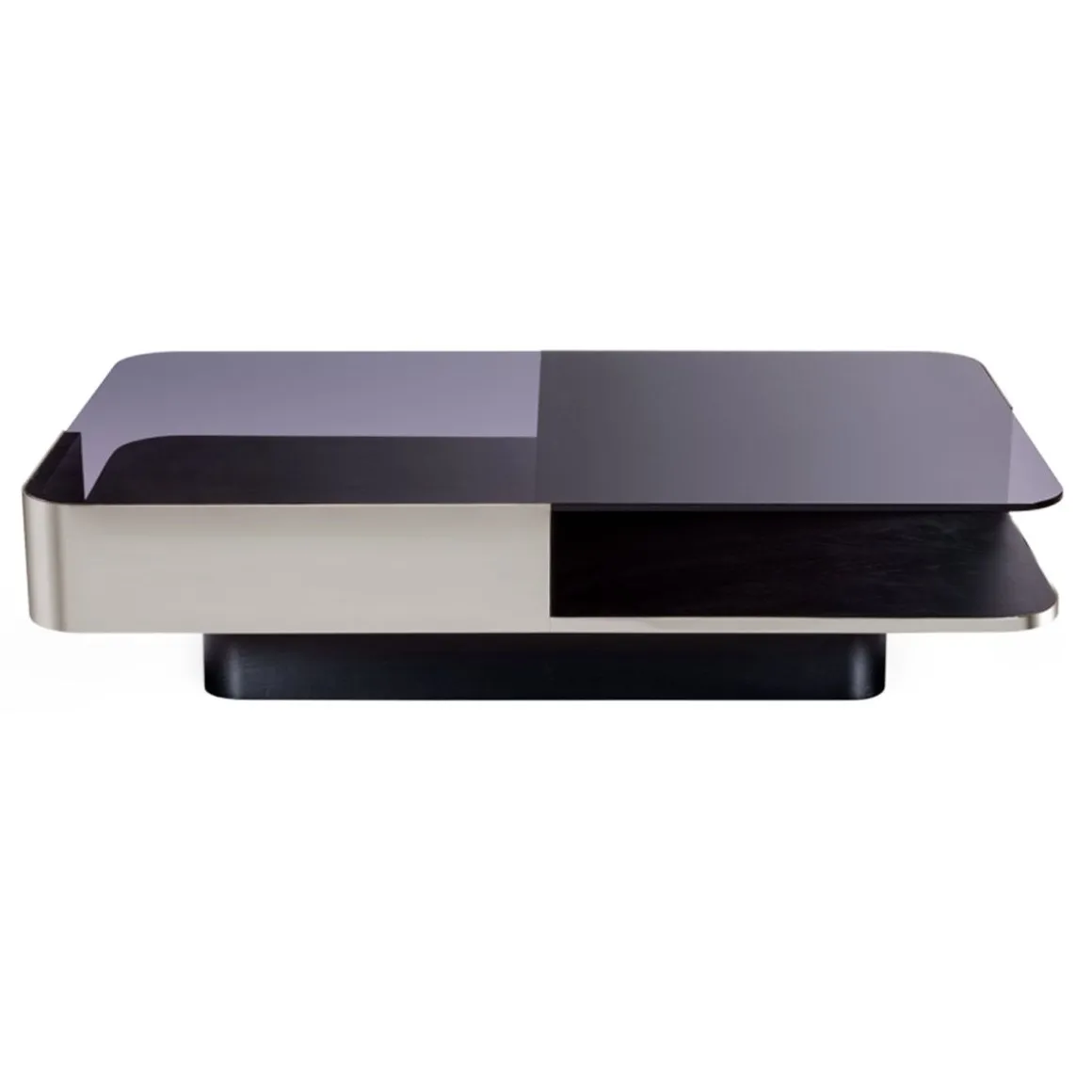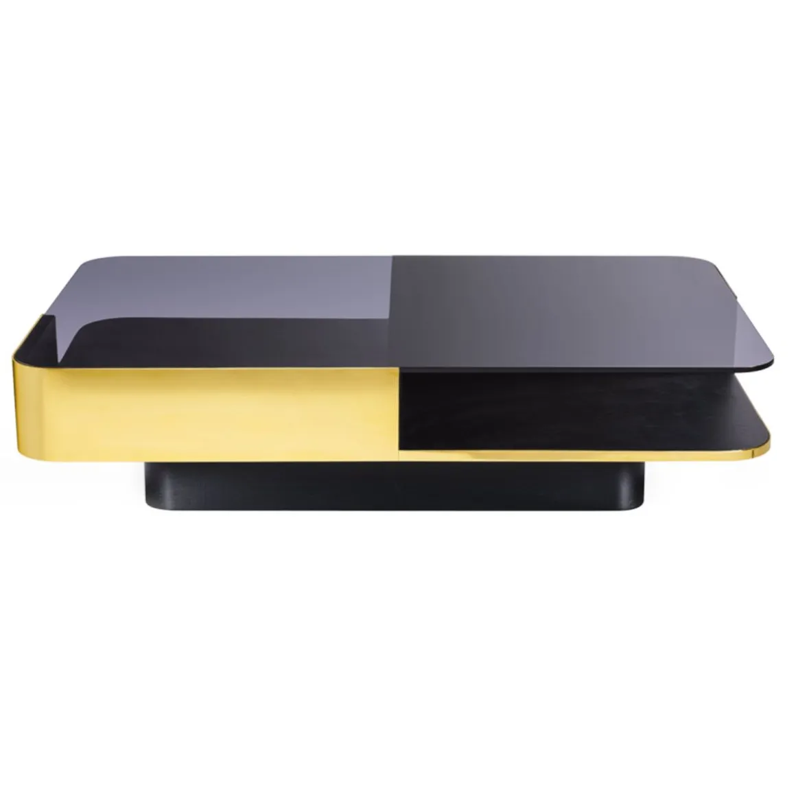La table basse Lounge, joue avec les pleins et les vides et à une combinaison de matière haut de gamme. Elle est la signature moderne d’un design qui rappelle un style rétro futur. Le plateau est en verre fumé noir, encerclé de laiton massif. La structure et le piètement sont taillés dans un bois noir teinté pour deviner les veinures du bois.