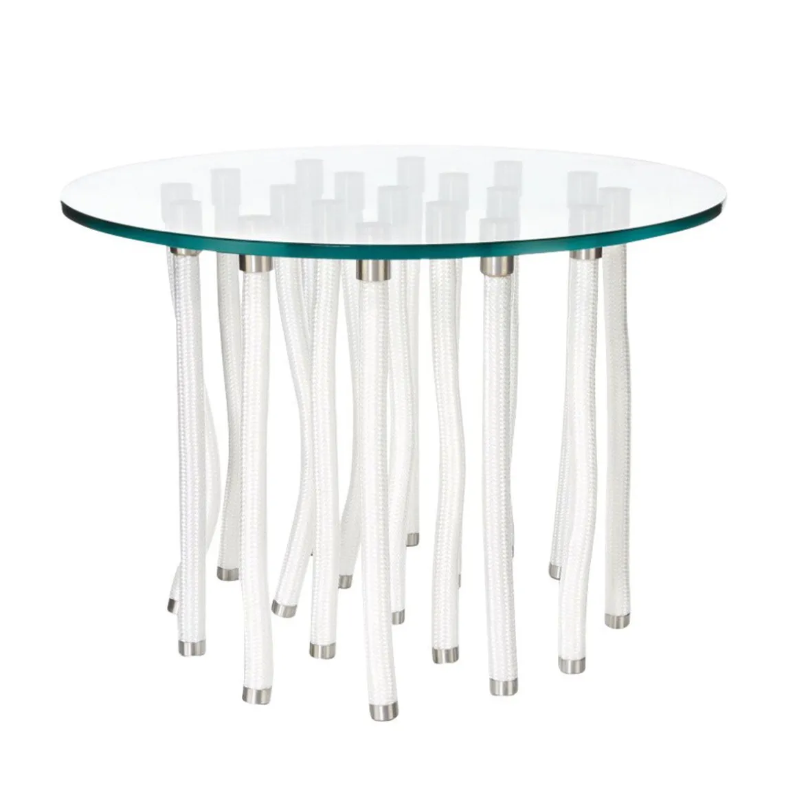Matériaux : verre transparent trempé, pieds rigides en acier et cordes de polypropylène