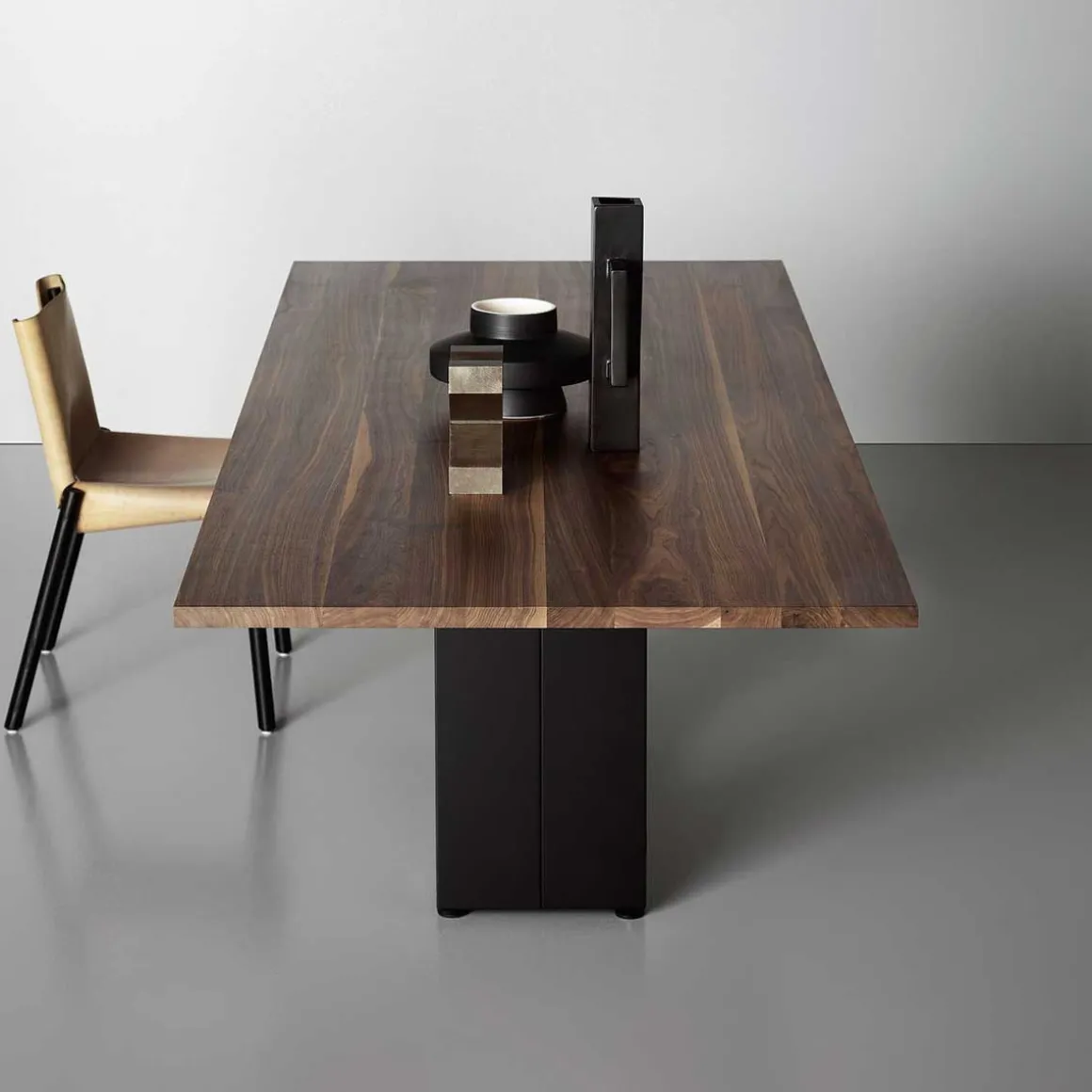 C’est sur ce piètement original que repose un mince plateau en bois massif pour un article de décoration à la personnalité tout à fait unique.