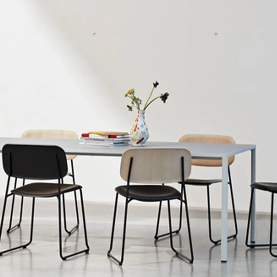 Table New Order de Hay. Dotée d’une construction simple en matériaux durables, la table New Order peut être utilisée à la fois comme table à manger et comme table de réunion dans un environnement de bureau. Avec un cadre en aluminium léger et durable et un plateau en linoléum de différentes couleurs, la table combine des qualités fonctionnelles et esthétiques dans une conception de table polyvalente. Adaptable à une large gamme d’applications d’espace de travail, le cadre de la table peut être complété par des solutions de gestion des câbles, des séparateurs et d’autres composants pour améliorer la fonctionnalité et l’organisation. Les profils à double pied permettent la mise en place de configurations plus grandes avec plusieurs tables, créant des combinaisons infinies.