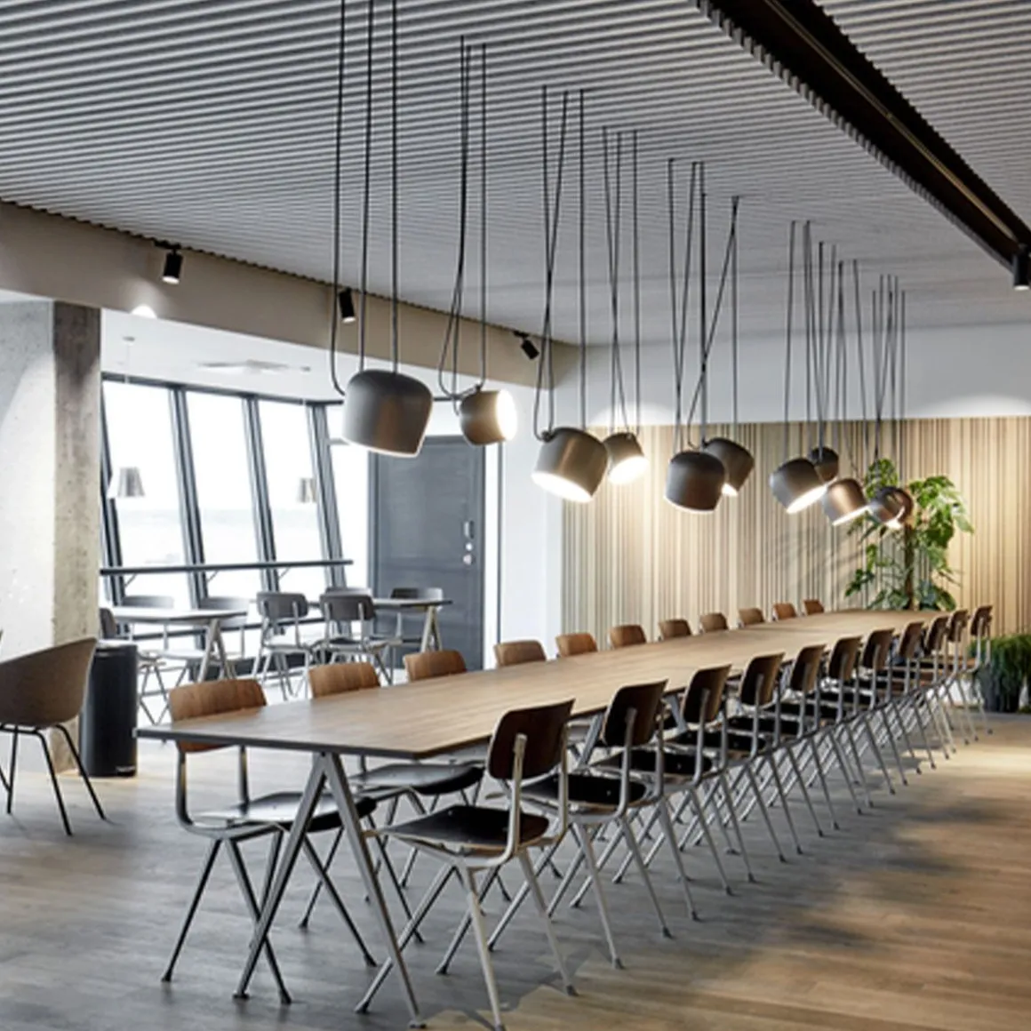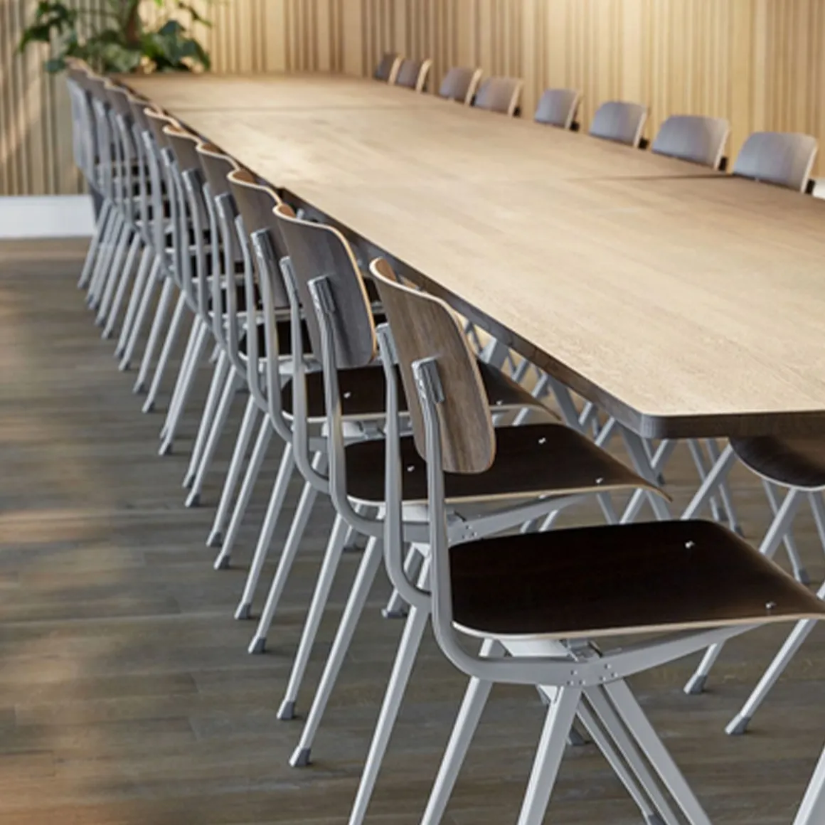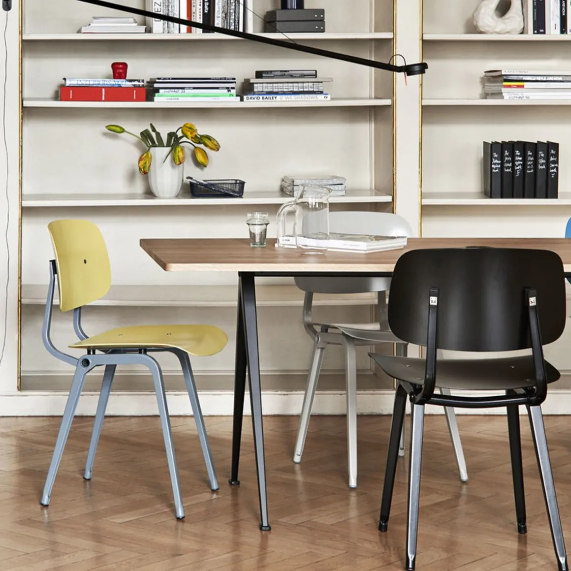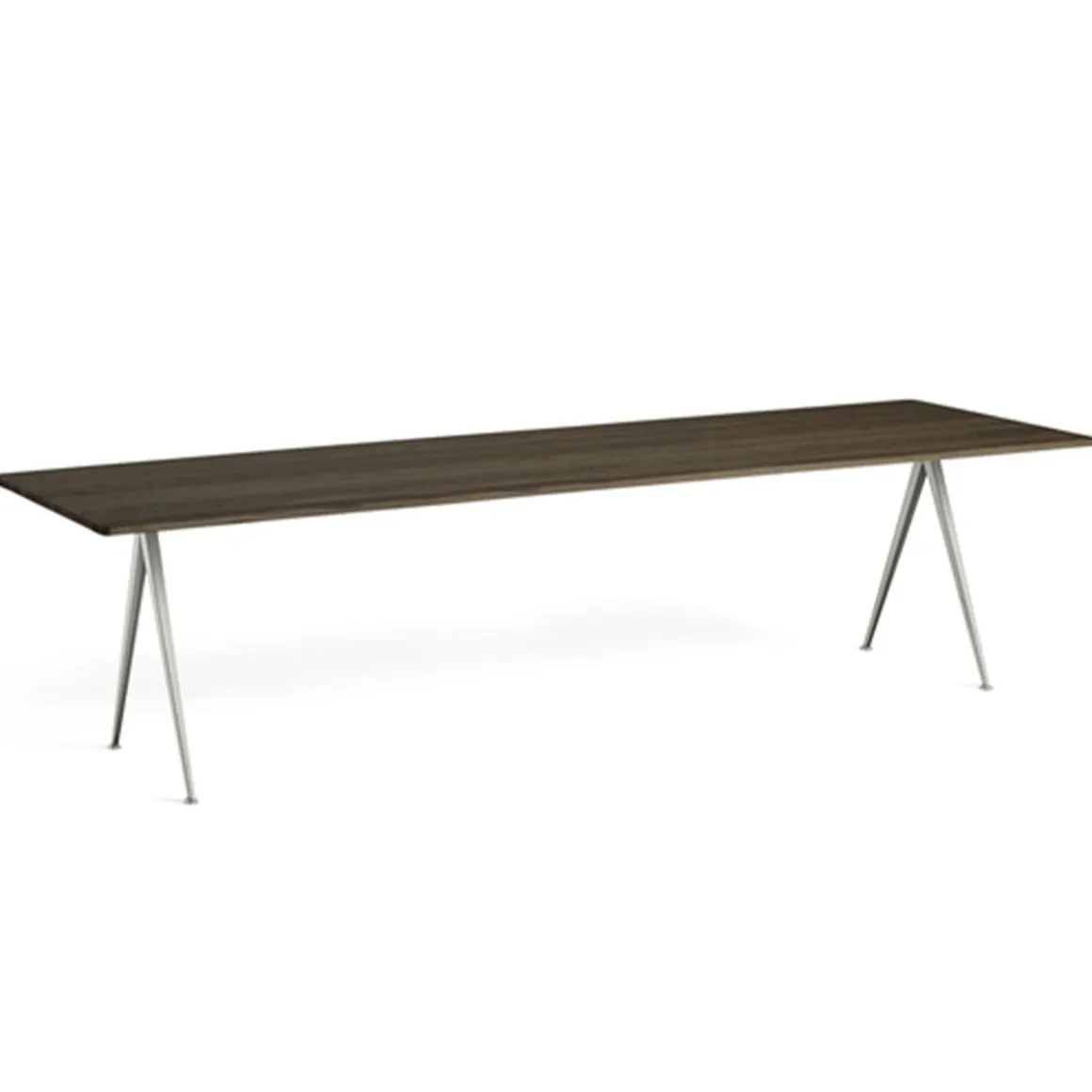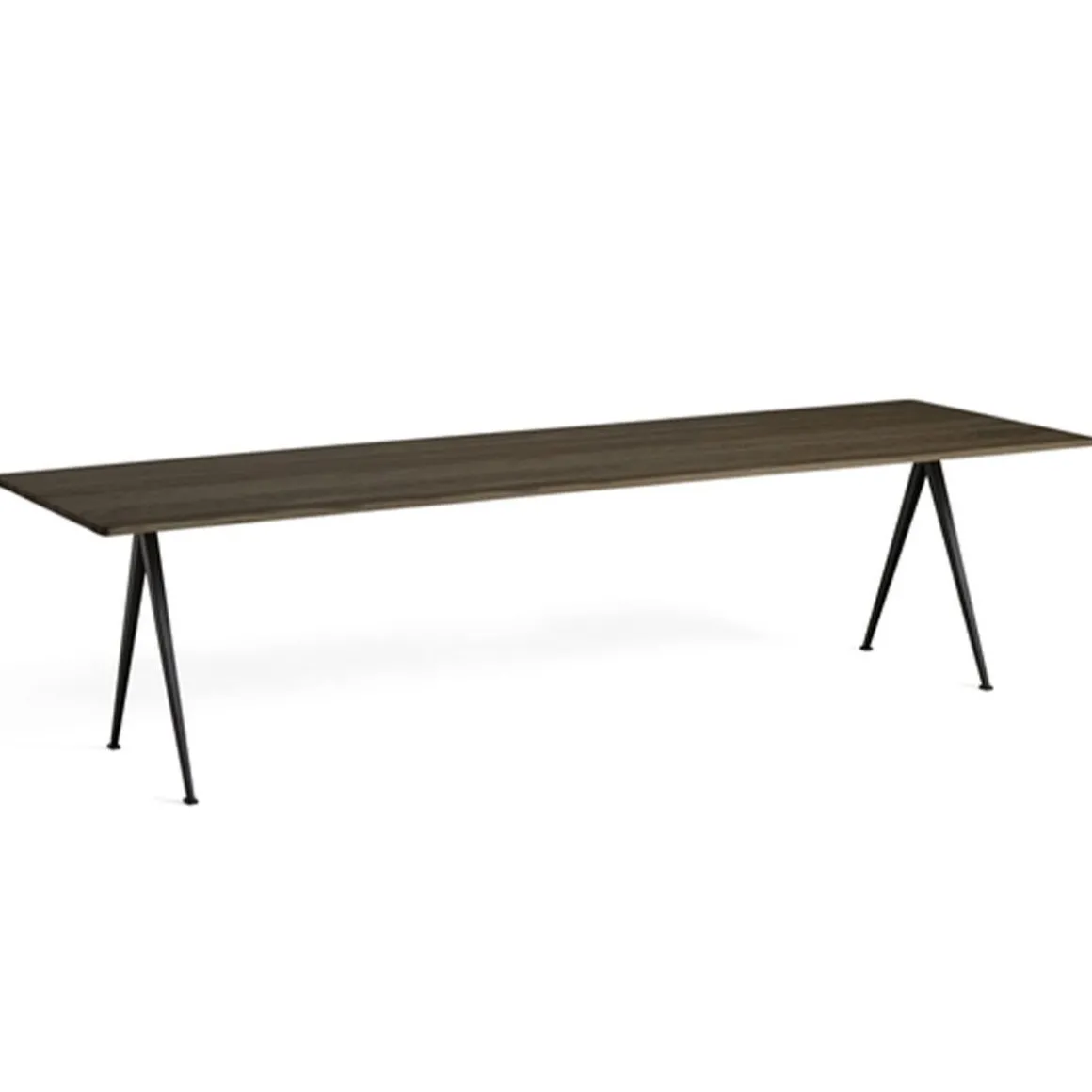Table Pyramide 02 de Hay. Conçue pour être fonctionnelle, légère et solide, la table Pyramid est dotée d’une base en tôle d’acier et d’un plateau rectangulaire en chêne. Créée à l’origine par Wim Rietveld alors qu’il travaillait chez Ahrend dans les années 1950, la collection en acier découpé a été relancée par HAY en collaboration avec Ahrend. La table est disponible en deux modèles – avec et sans surplomb – et convient à une utilisation dans un large éventail d’établissements d’enseignement, d’environnements d’entreprise et de maisons privées. Les deux variantes sont disponibles dans une variété de finitions en bois et de couleurs de base qui peuvent être coordonnées avec la chaise Result et le banc Pyramid.