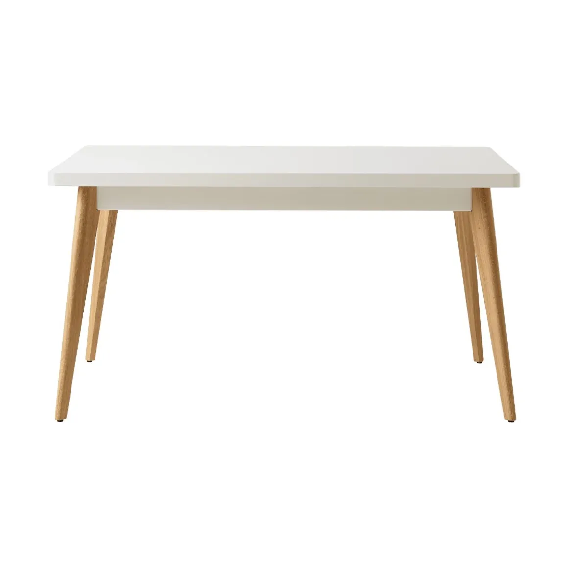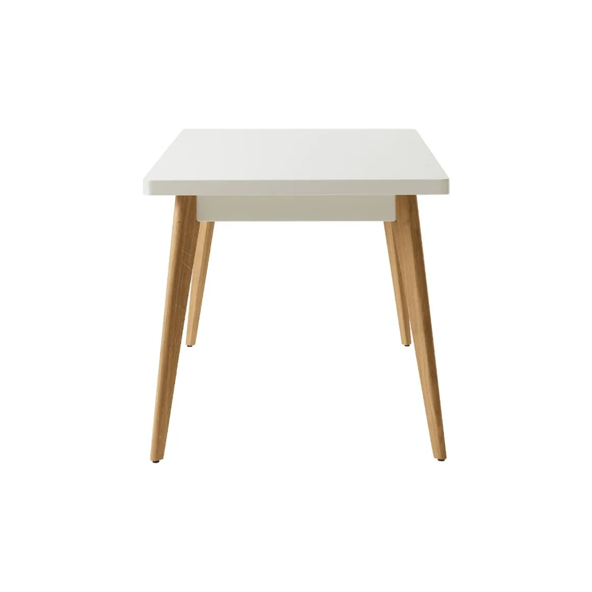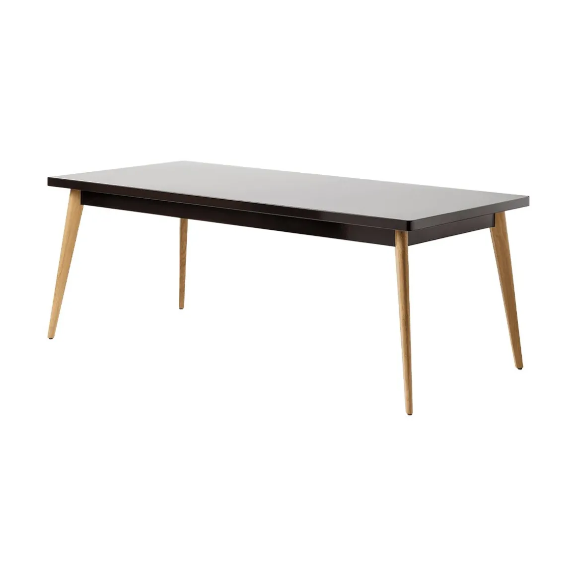 En 1955 Jean Pauchard cherche sa Table. « Le pied, c’est le pied qui compte » s’exclame-t-il. Il conçoit une première maquette de pied en blanc de forme rectangulaire puis dès 1960 il l’affine et lui donne sa forme actuelle plus élégante. La table T55 est née. Ses pieds fuselés et coniques, entièrement réalisés en acier, lui confèrent une grâce aérienne, tout en attestant de la durabilité de sa construction. Sur cette version bi-matière, TOLIX joue le contraste de la forme et de la matière : ses pieds en acier sont remplacés par des pieds coniques en bois et le plateau rectangulaire demeure en acier. Ce mixte des genres lui confère un esprit contemporain et chaleureux. Offerte en différentes longueurs – 140 cm, 200 cm et 240 cm – elle s’adapte à chaque espace, affirmant sa présence avec une subtilité raffinée.