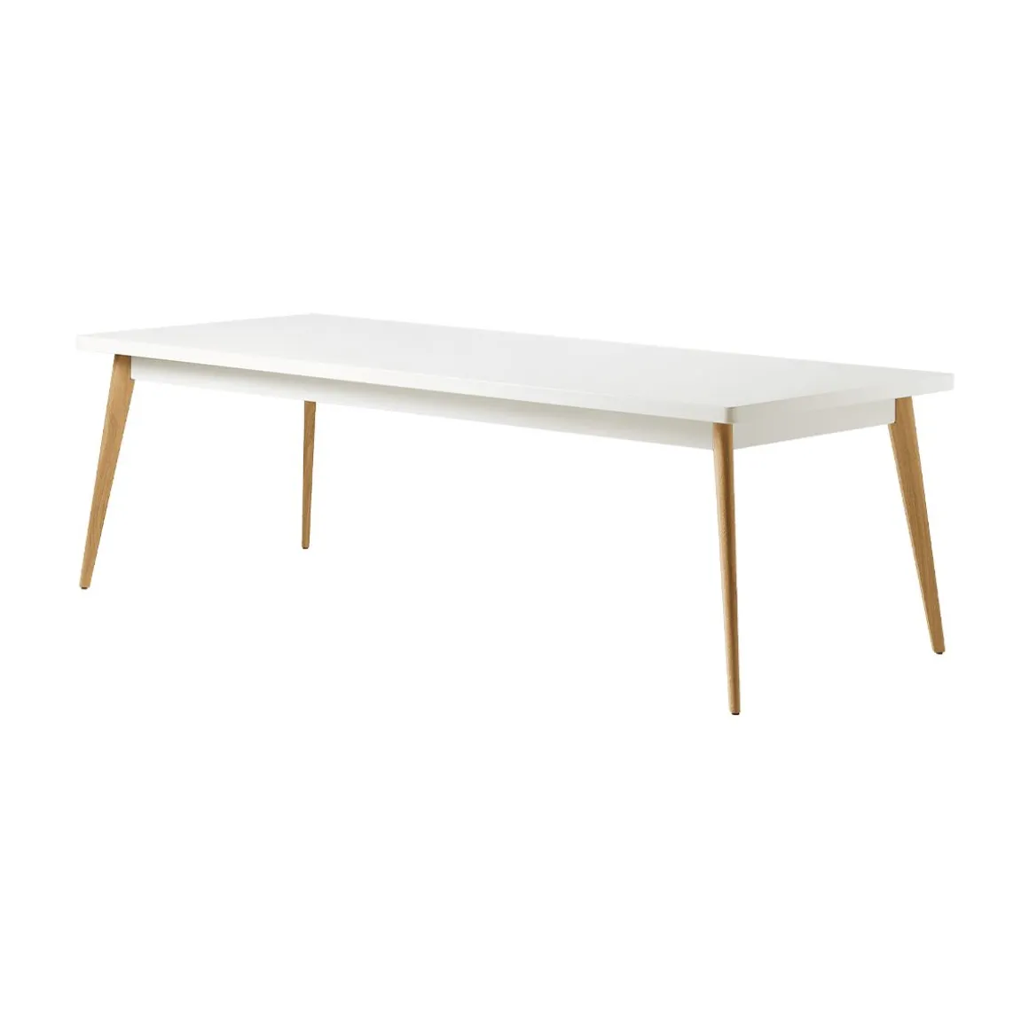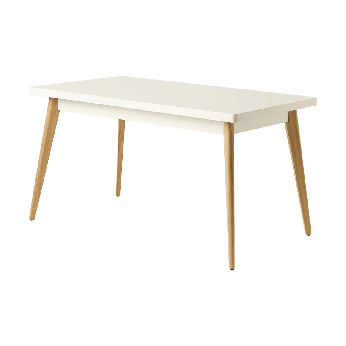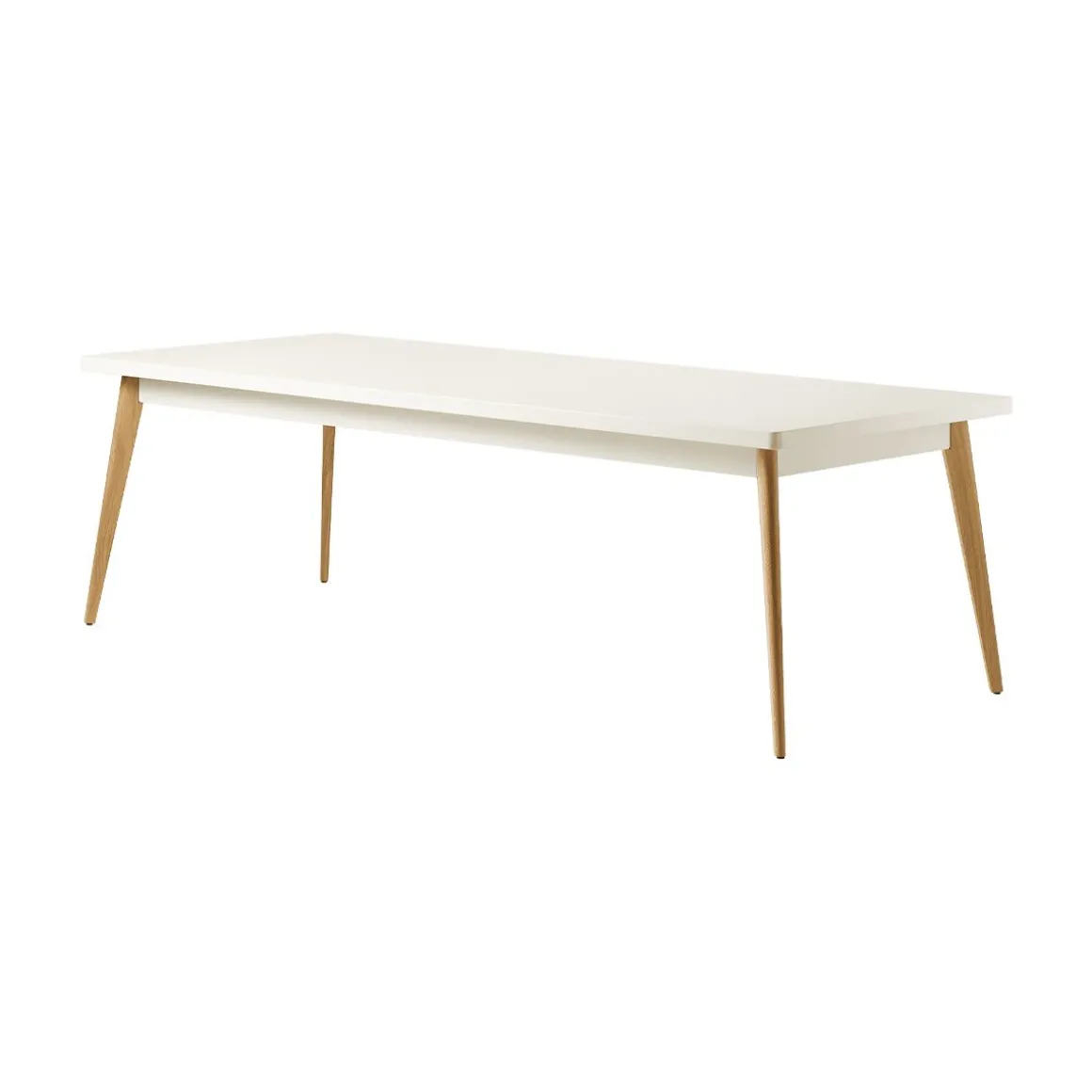 En 1955 Jean Pauchard cherche sa Table. « Le pied, c’est le pied qui compte » s’exclame-t-il. Il conçoit une première maquette de pied en blanc de forme rectangulaire puis dès 1960 il l’affine et lui donne sa forme actuelle plus élégante. La table T55 est née. Ses pieds fuselés et coniques, entièrement réalisés en acier, lui confèrent une grâce aérienne, tout en attestant de la durabilité de sa construction. Sur cette version bi-matière, TOLIX joue le contraste de la forme et de la matière : ses pieds en acier sont remplacés par des pieds coniques en bois et le plateau rectangulaire demeure en acier. Ce mixte des genres lui confère un esprit contemporain et chaleureux. Offerte en différentes longueurs – 140 cm, 200 cm et 240 cm – elle s’adapte à chaque espace, affirmant sa présence avec une subtilité raffinée.