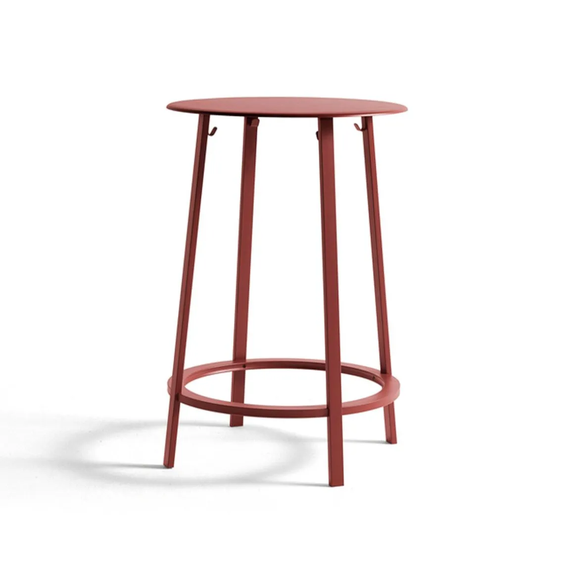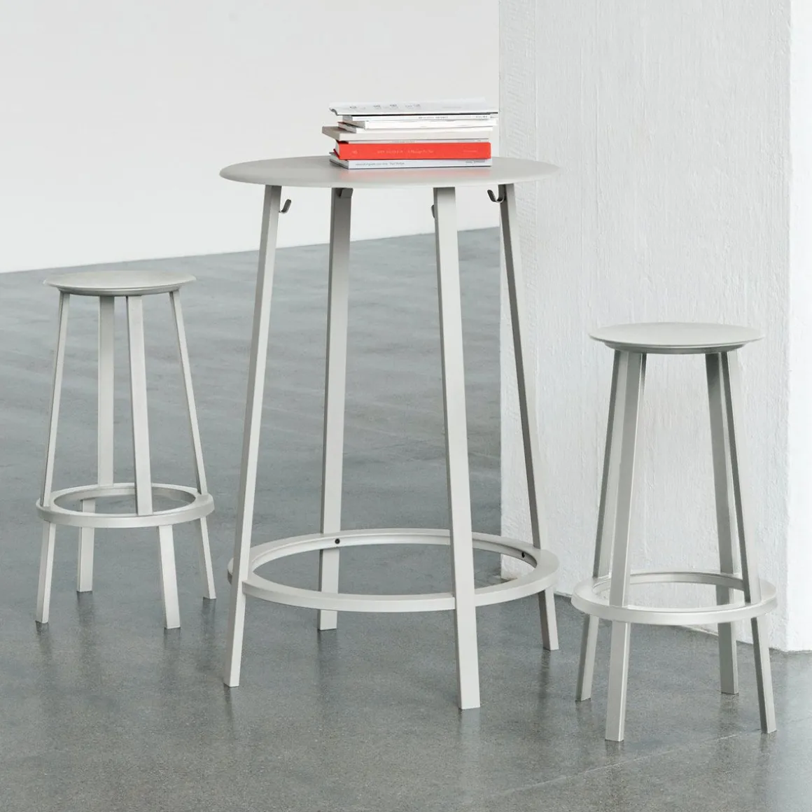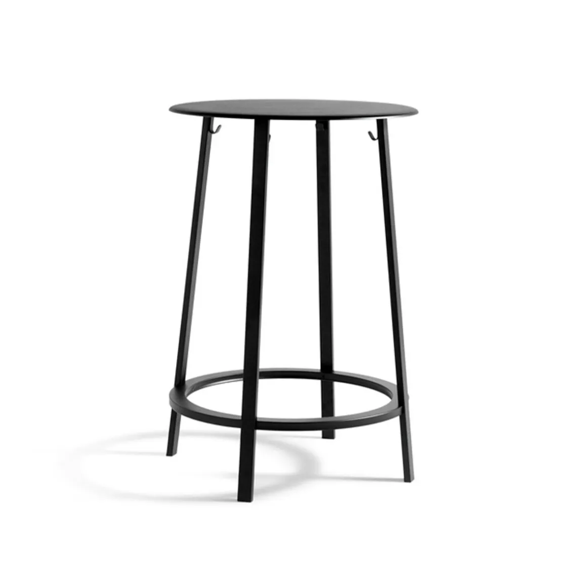 Table revolver de Hay. Conçue pour accompagner la famille des tabourets Revolver, la table Revolver de Leon Ransmeier est fabriquée en acier enduit de poudre et présente les mêmes bords incurvés et le même sens de la symétrie. En termes de fonctionnalité, le repose-pied circulaire fournit un soutien, tandis que les crochets sur les pieds de la table permettent de suspendre les manteaux et les sacs en toute sécurité en dessous. La table est disponible en différentes couleurs et convient à un large éventail de cafés, restaurants et autres environnements publics.