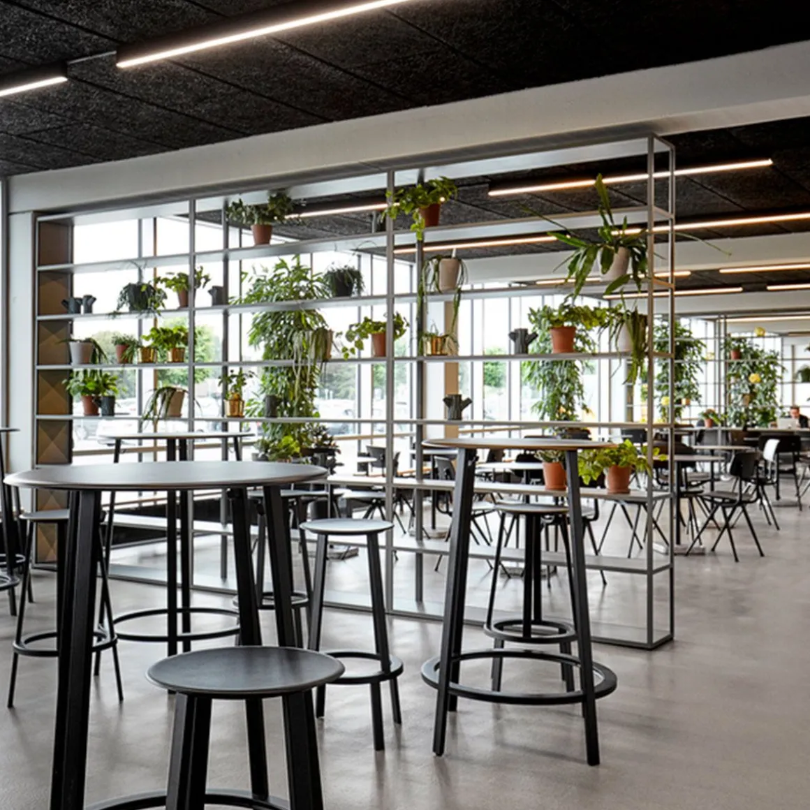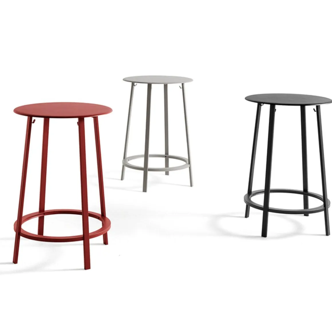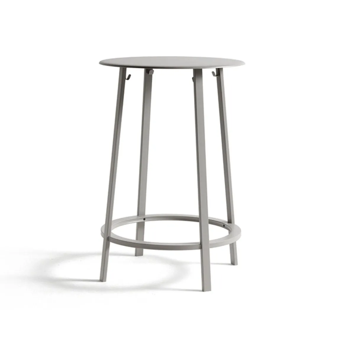 Table revolver de Hay. Conçue pour accompagner la famille des tabourets Revolver, la table Revolver de Leon Ransmeier est fabriquée en acier enduit de poudre et présente les mêmes bords incurvés et le même sens de la symétrie. En termes de fonctionnalité, le repose-pied circulaire fournit un soutien, tandis que les crochets sur les pieds de la table permettent de suspendre les manteaux et les sacs en toute sécurité en dessous. La table est disponible en différentes couleurs et convient à un large éventail de cafés, restaurants et autres environnements publics.