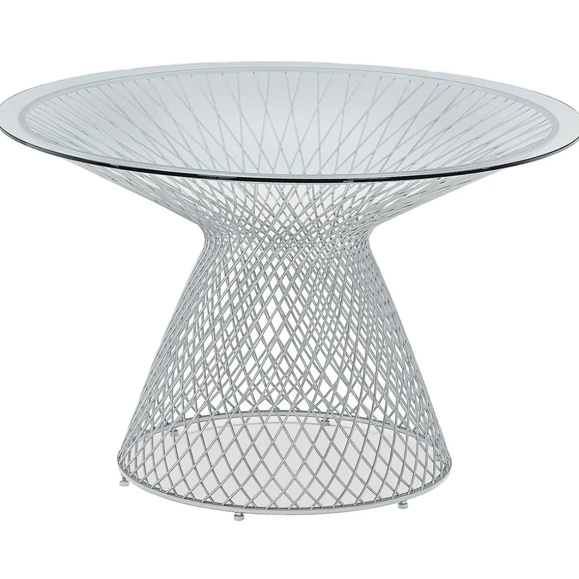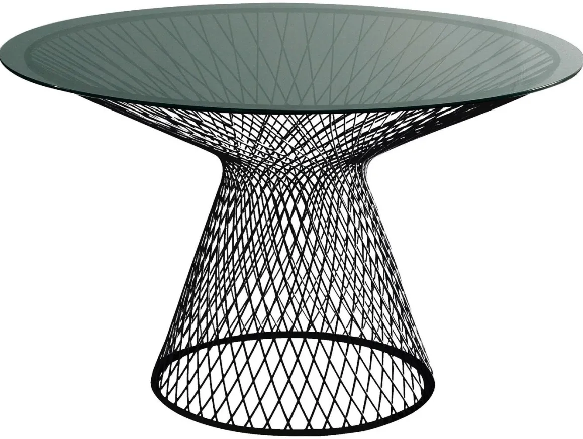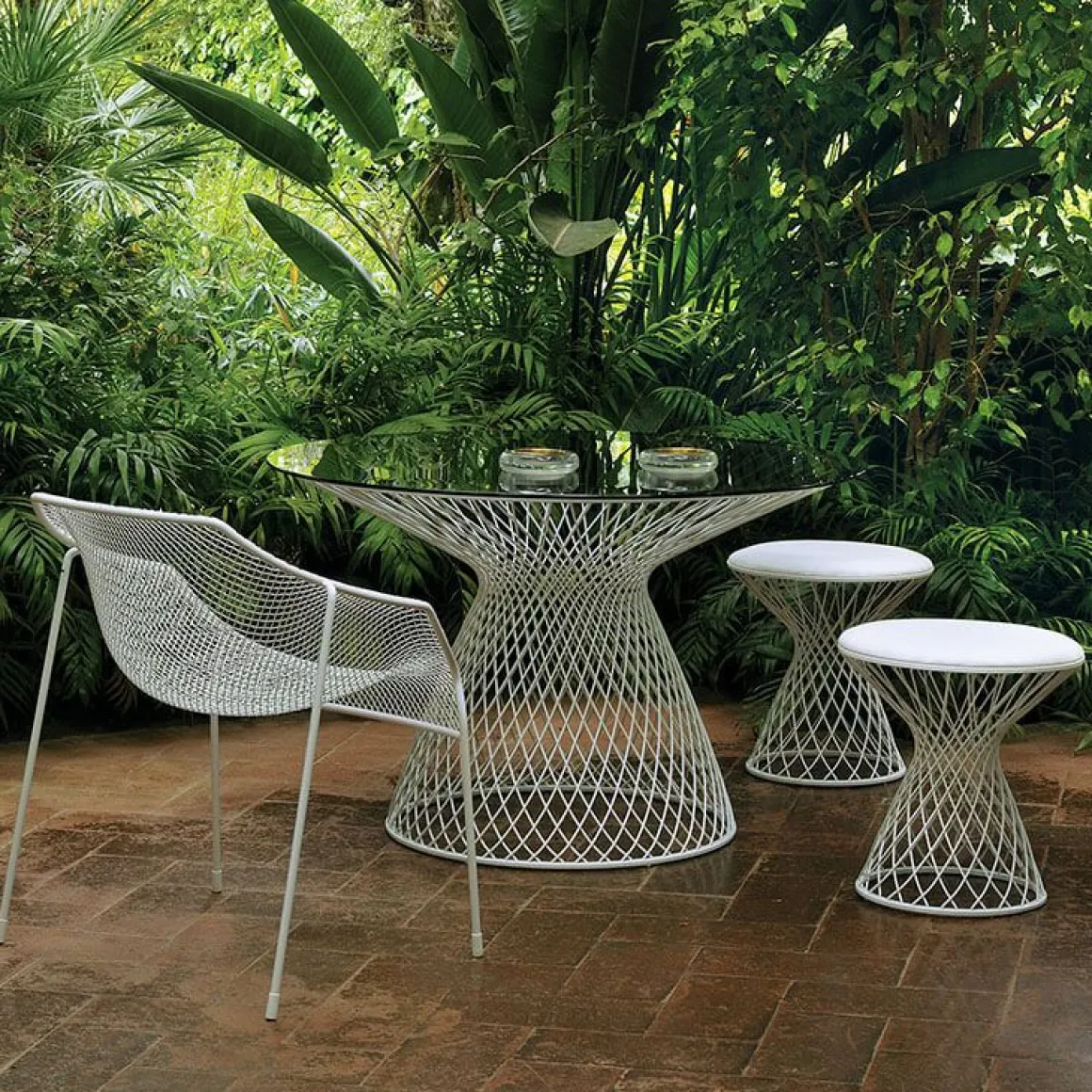 La table ronde Heaven est composée d’un plateau en cristal trempé de 8mm et d’une structure en tube d’acier pré-galvanisé verni. Disponible en blanc et en aluminium. La table est née comme complément de la chaise et du fauteuil et suit le même design évocateur. L’entrelacement est réalisé grâce à un processus unique de tissage et de soudure.