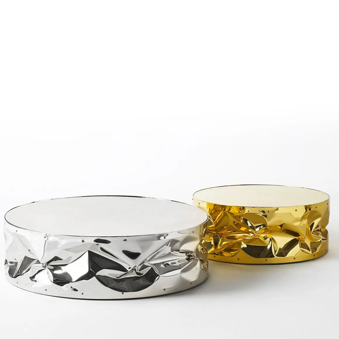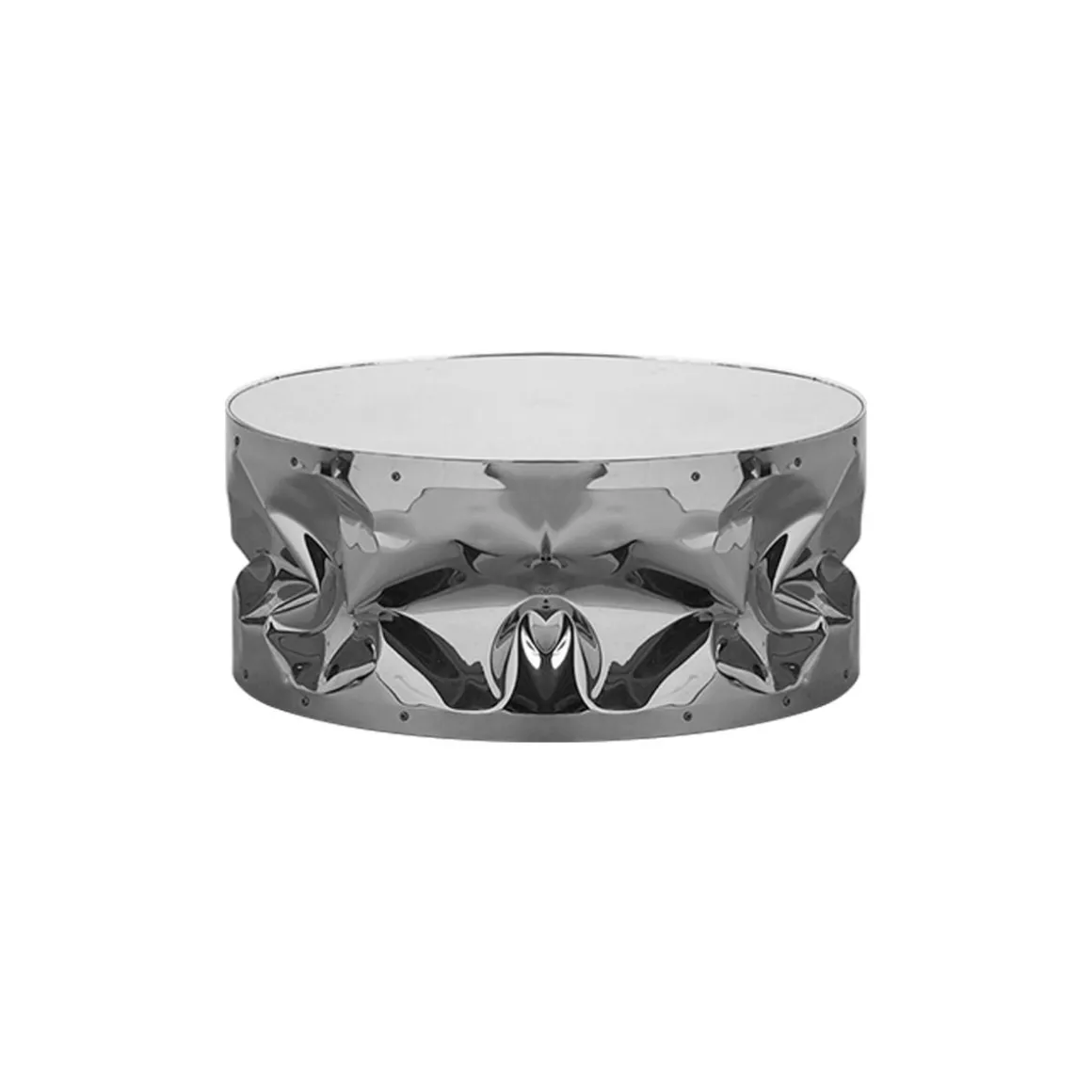 Matériaux : aluminium froissé, structure interne en bois, top en verre miroir