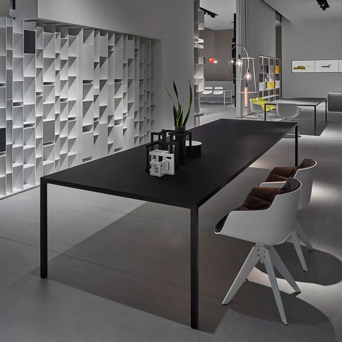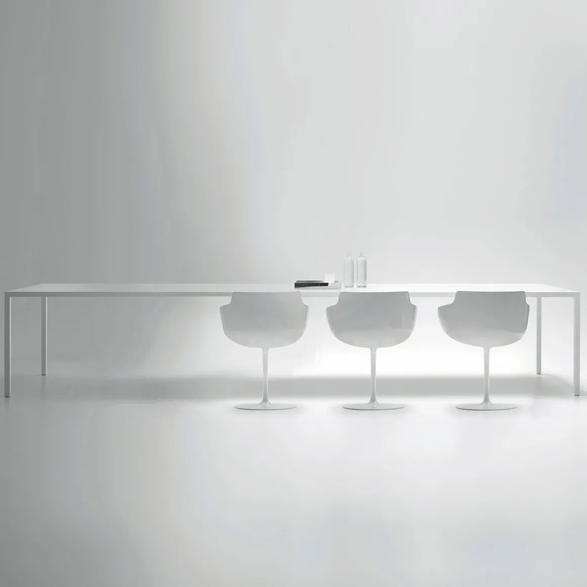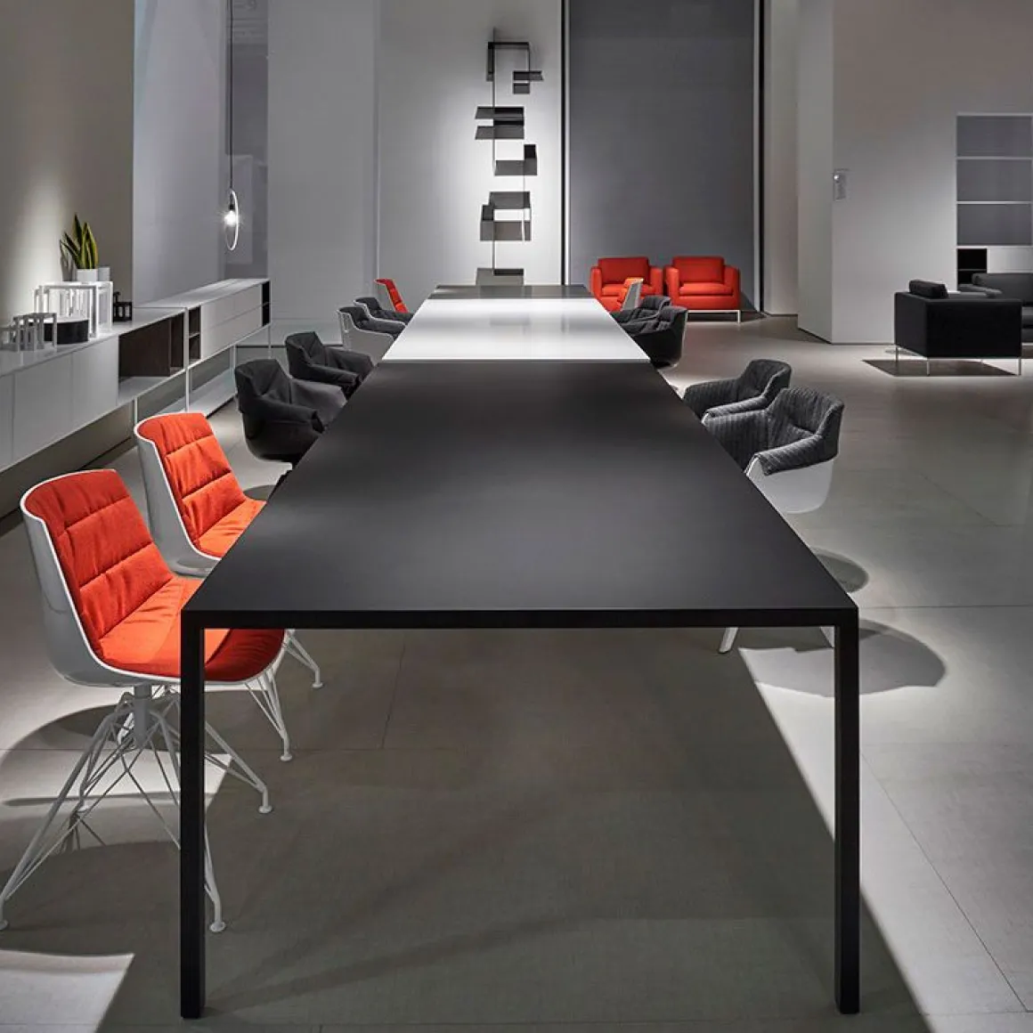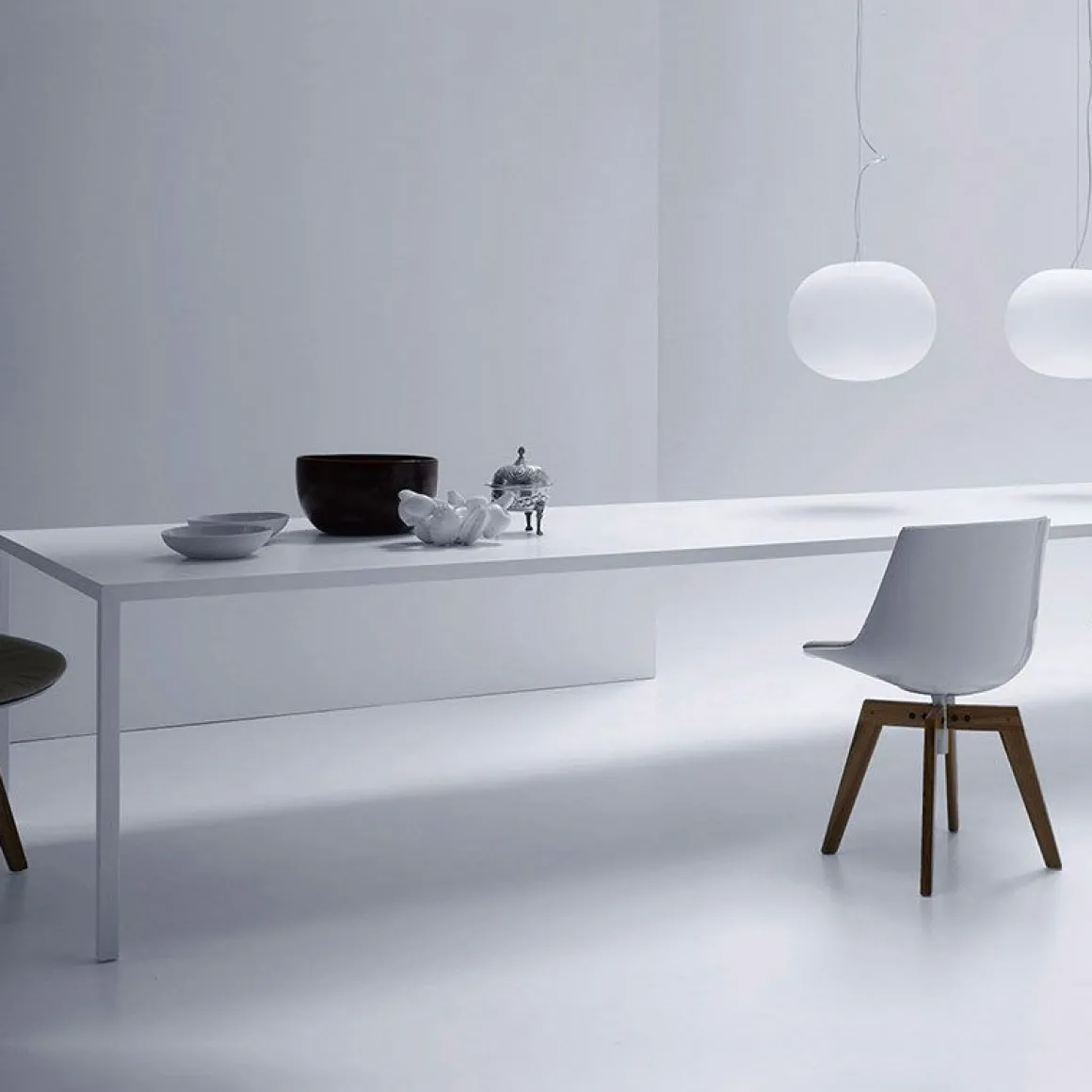 “Concevoir en simplifiant, extrapoler l’essence”. Ce fut la genèse de Tense de Piergiorgio et Michele Cazzaniga. Tense représente le noyau, le concept principal de l’idée de table, donc unique et minimale pour s’adapter à de nombreux espaces différents, résidentiels ou contractuels.Tense, c’est l’âme de la table, qui s’exprime à travers une énorme cohérence en termes de formes et de finitions, celle-ci dans un seul matériau et identique pour les pieds et le dessus, procurant une sensation de compacité et de modernité. Dans son essence, cette table cache un cœur technologique, encastré dans le panneau supérieur, qui permet, grâce à la tension interne, d’atteindre de grandes dimensions, jusqu’à 4 mètres. Et, grâce à l’épaisseur minimale du plateau, Tense conserve dans tous les cas un poids et une stabilité élevés. La possibilité de choisir différentes tailles et couleurs permet à Tense de répondre aux besoins de chaque client.