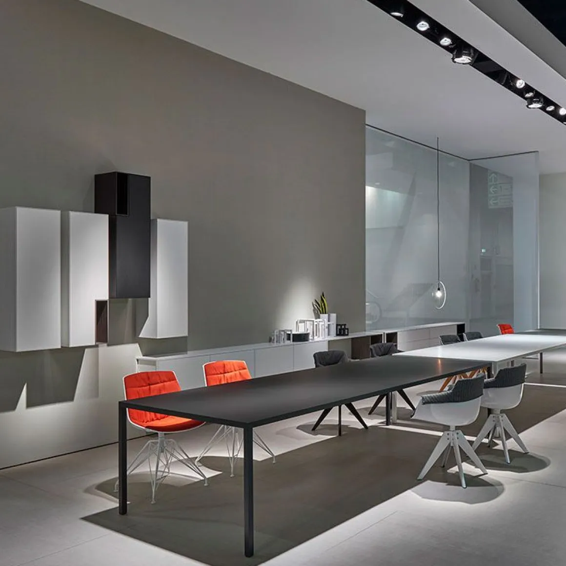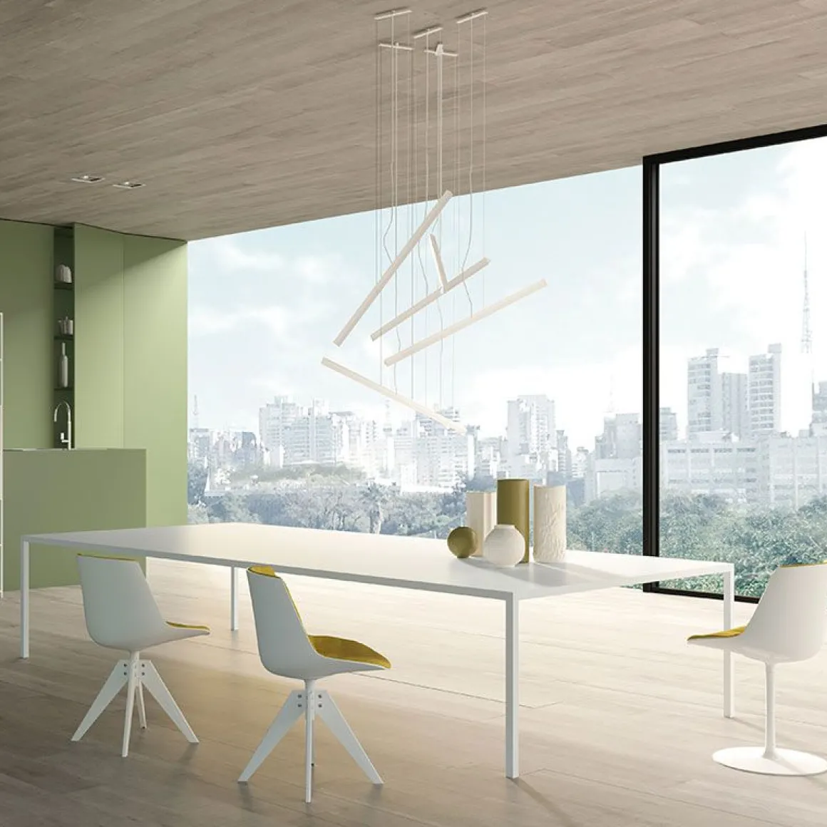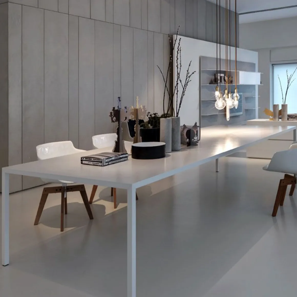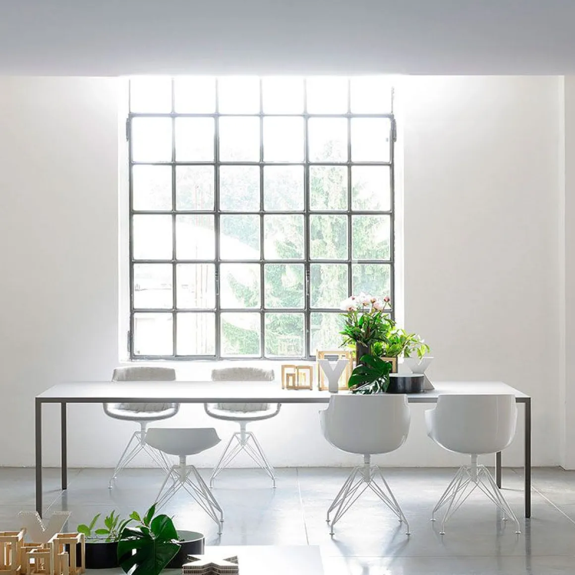 “Concevoir en simplifiant, extrapoler l’essence”. Ce fut la genèse de Tense de Piergiorgio et Michele Cazzaniga. Tense représente le noyau, le concept principal de l’idée de table, donc unique et minimale pour s’adapter à de nombreux espaces différents, résidentiels ou contractuels.Tense, c’est l’âme de la table, qui s’exprime à travers une énorme cohérence en termes de formes et de finitions, celle-ci dans un seul matériau et identique pour les pieds et le dessus, procurant une sensation de compacité et de modernité. Dans son essence, cette table cache un cœur technologique, encastré dans le panneau supérieur, qui permet, grâce à la tension interne, d’atteindre de grandes dimensions, jusqu’à 4 mètres. Et, grâce à l’épaisseur minimale du plateau, Tense conserve dans tous les cas un poids et une stabilité élevés. La possibilité de choisir différentes tailles et couleurs permet à Tense de répondre aux besoins de chaque client.