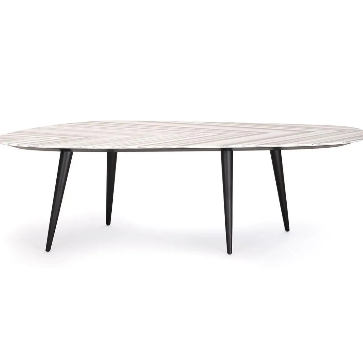 La table tweed marble a un plateau en marbre Striato Olimpico, épaisseur 20 mm, avec vernis de protection antitache en polyester transparent mat. Sous-plateau en MDF épaisseur 40 mm laqué noir mat. Pieds en tube d’acier peint en noir mat. Un cadre renforcé avec des pieds en acier tubulaire conique et un piètement en MDF supporte les deux dalles de marbre striées qui ont été placées spécifiquement pour assurer que les veines s’alignent pour former un motif en losange dans un jeu spéculaire très précis et à fort impact qui fait ressortir les propriétés du matériel. Les formes lisses sont fonctionnelles pour faciliter l’interaction et la communication autour de la table et les deux conceptions de table irrégulières sont conçues pour accueillir plusieurs convives et répondre à diverses exigences d’espace.
