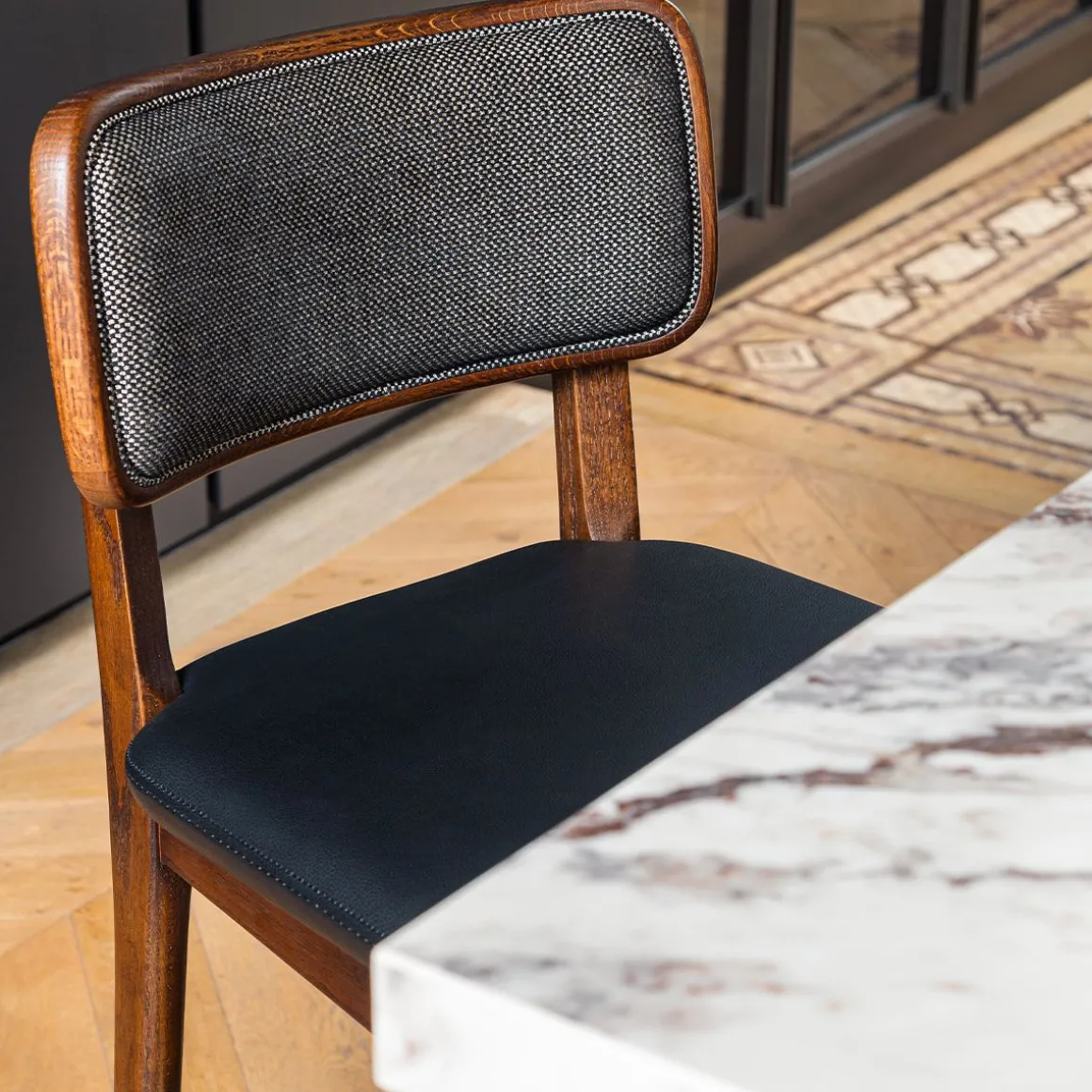 Coloris : Noyer/ tissu caviar, Noyer/ cuir noir, Noyer/ cuir tabac, Noyer/ cuir vanille