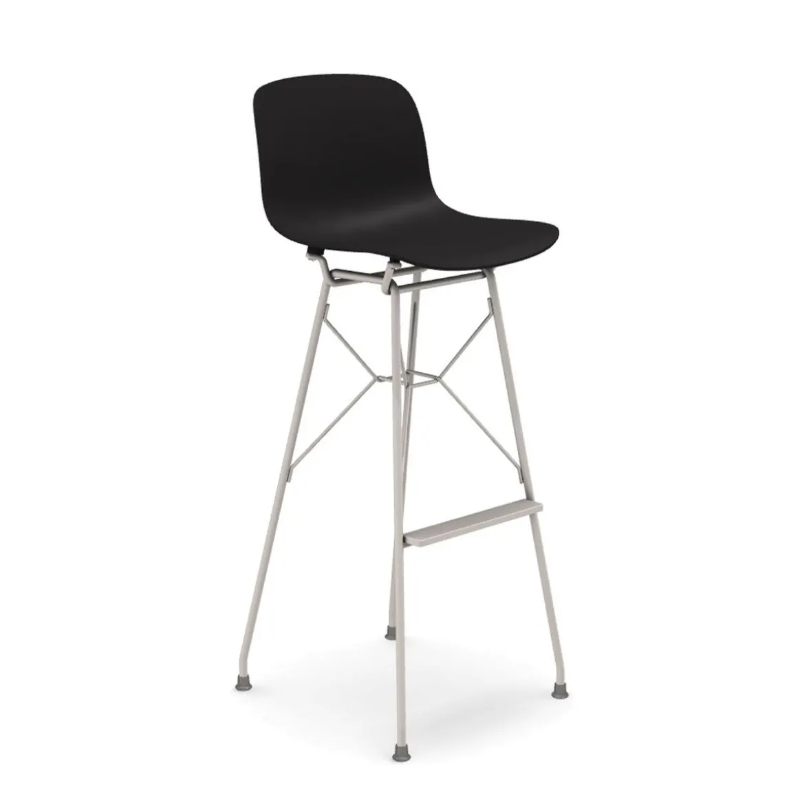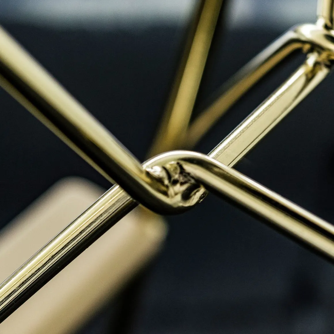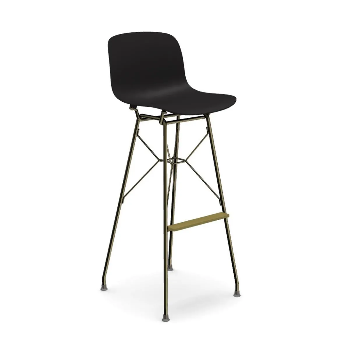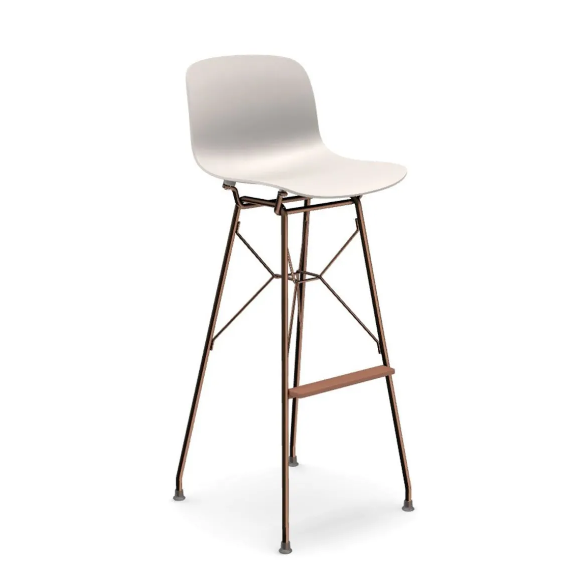 Matériaux : structure en tube d’acier, plaqué ou cuivre ou verni en polyester, assise en polypropylène