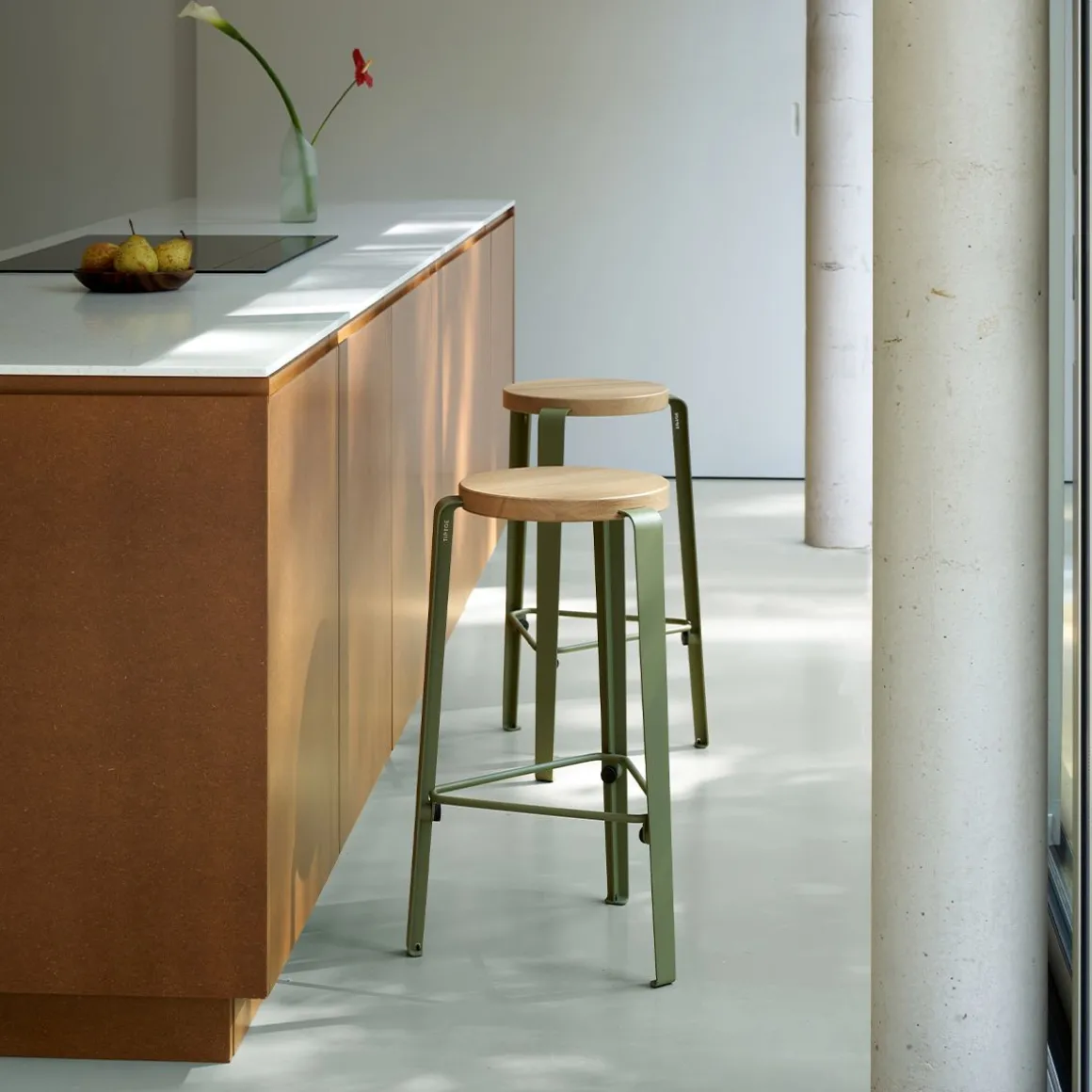 Le tabouret mi-haut MI LOU hauteur 66cm conçu par TIPTOE est une objet créatif et polyvalent à utiliser avec un plan de travail classique, un îlot central ou avec nos pieds de table pour plan de travail 90cm.
