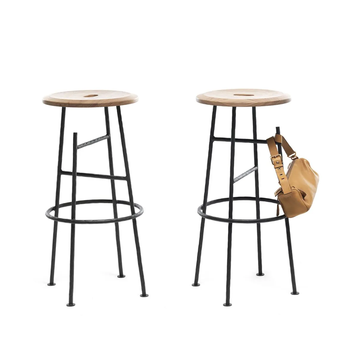 Sbagliato est un tabouret avec structure en fer forgé et assise en noyer Canaletto massif. Une coupe imparfaite d’une jambe se transforme en une fonction aussi simple qu’utile. Un crochet pour sacs et vêtements rend nos mains libres pour communiquer avec des gestes.